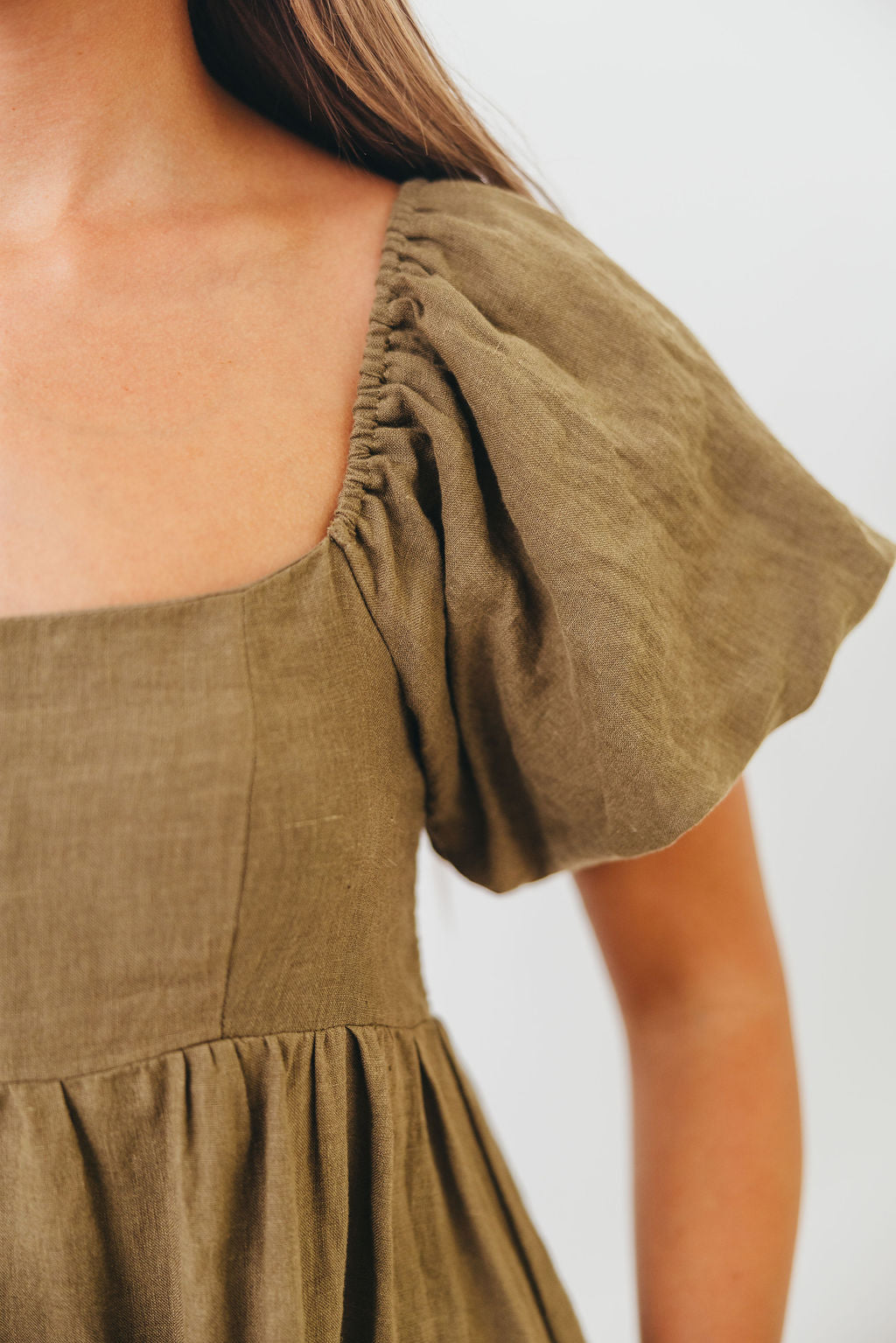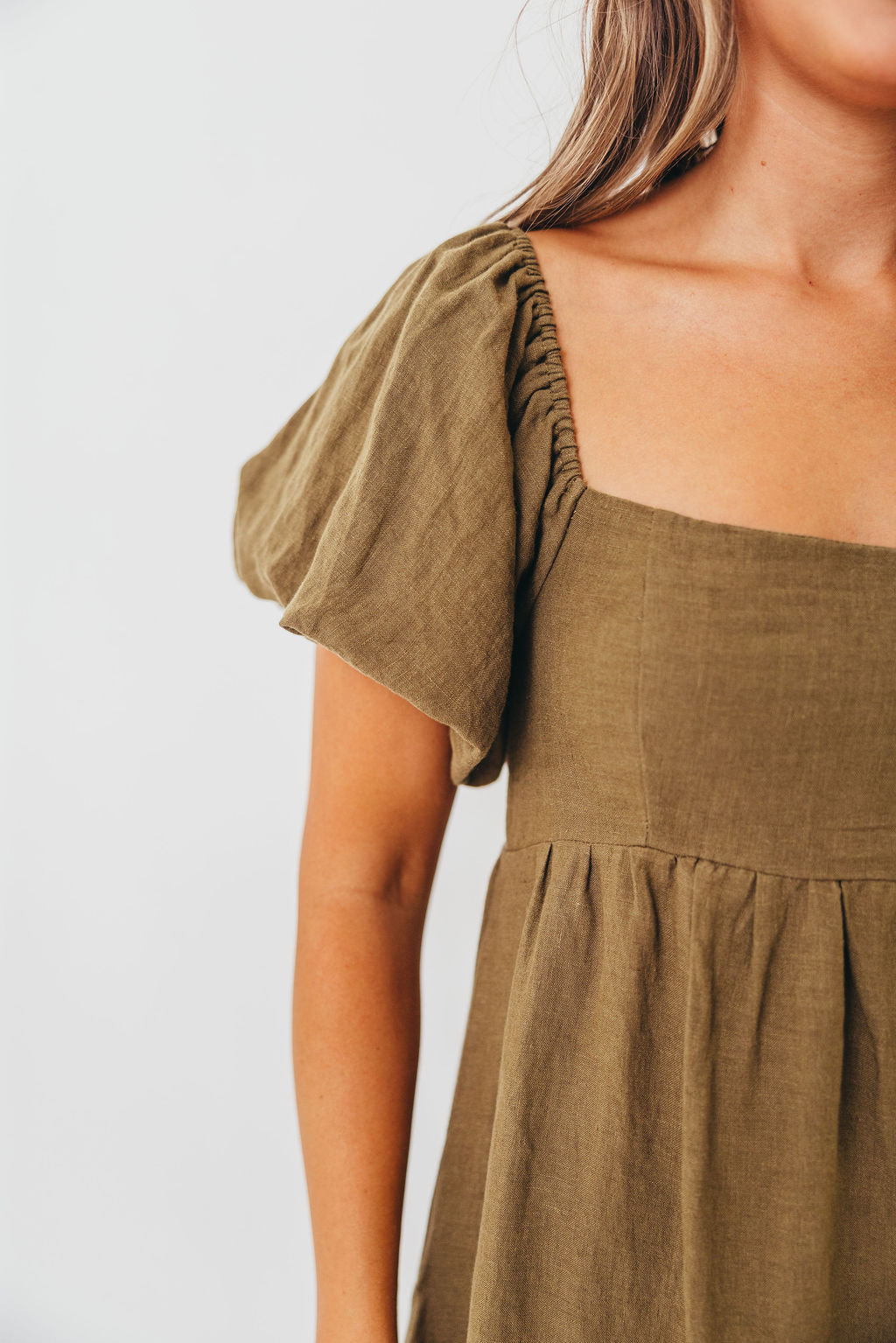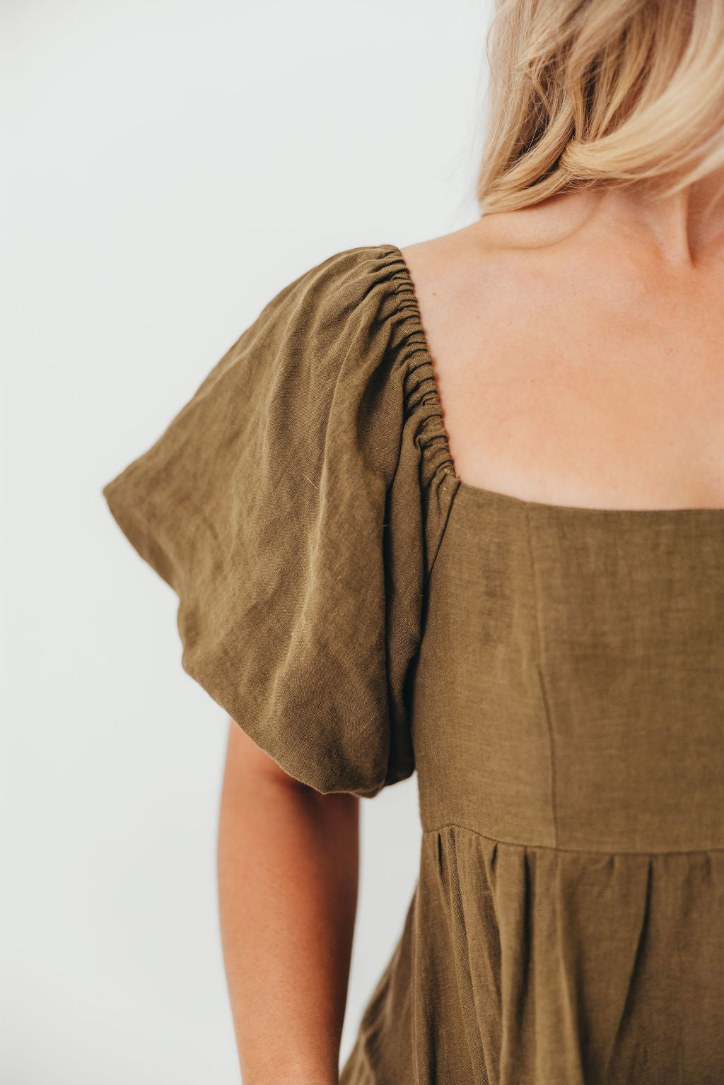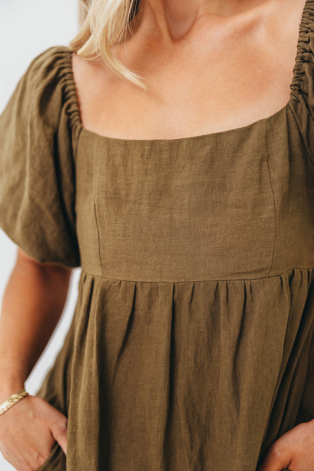 GARMENT DETAILS: Short-sleeved linen midi dress with an empire waist and full, flowing skirt. Features a square neckline, puffed sleeves that can be worn on or off the shoulder, and a structured bodice with stretchy smocking in the back. Finished with dual in-seam pockets.
