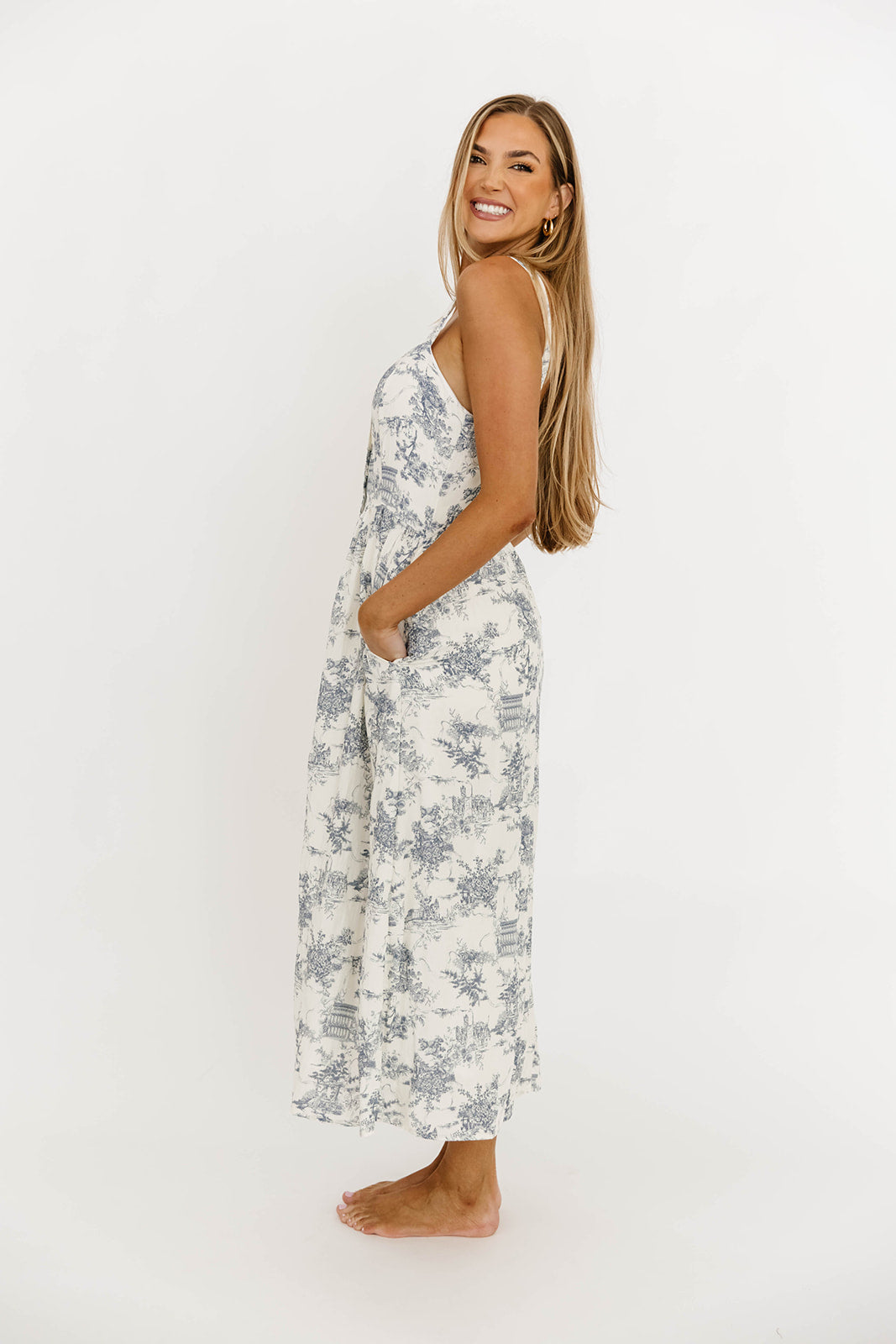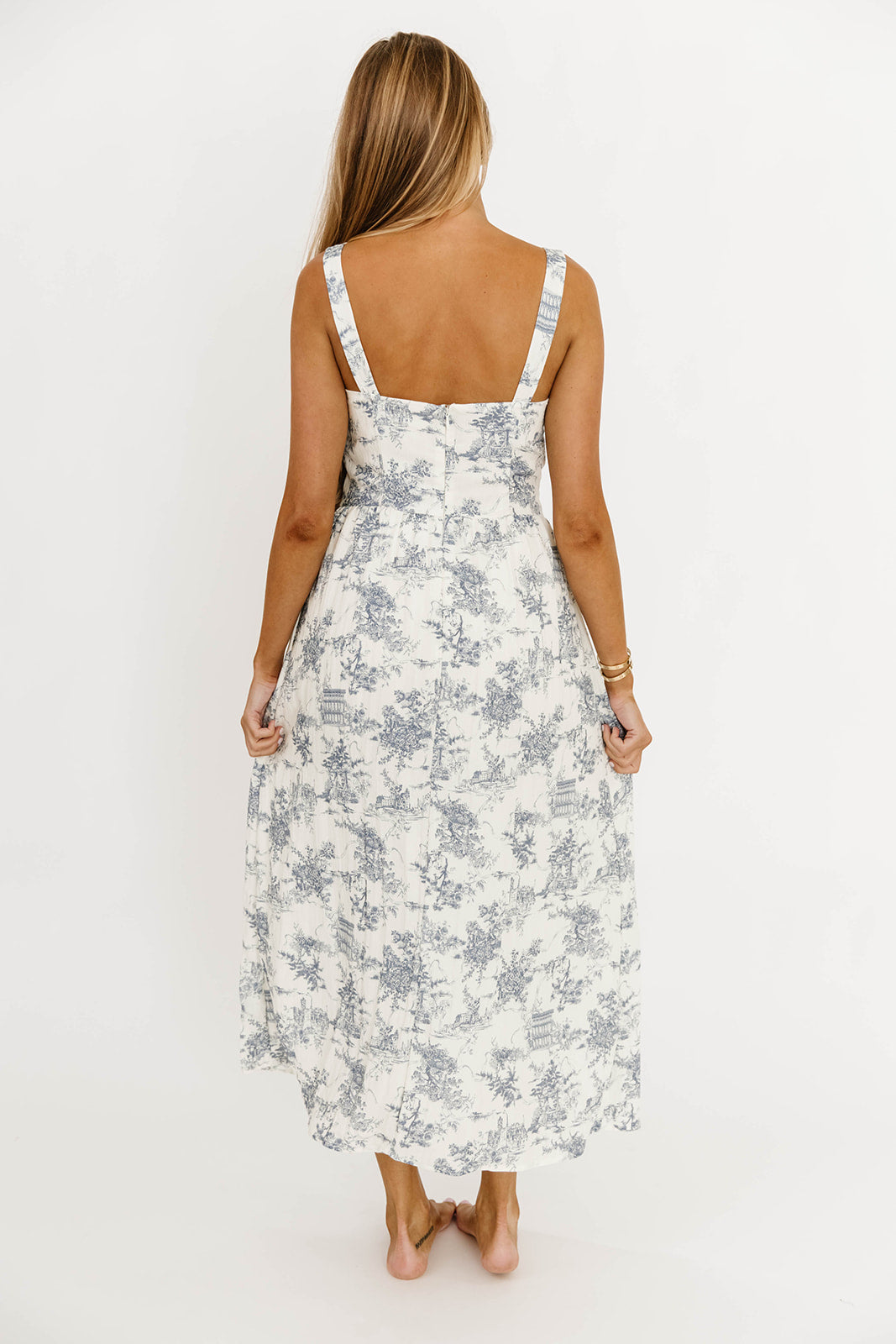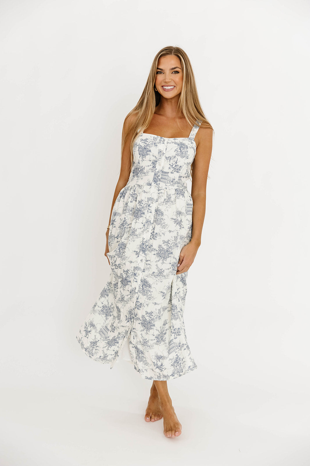 GARMENT DETAILS: Toile-print midi dress with square neckline, adjustable shoulder straps, and functional front button placket. Features a generous skirt and side pockets. Lined.