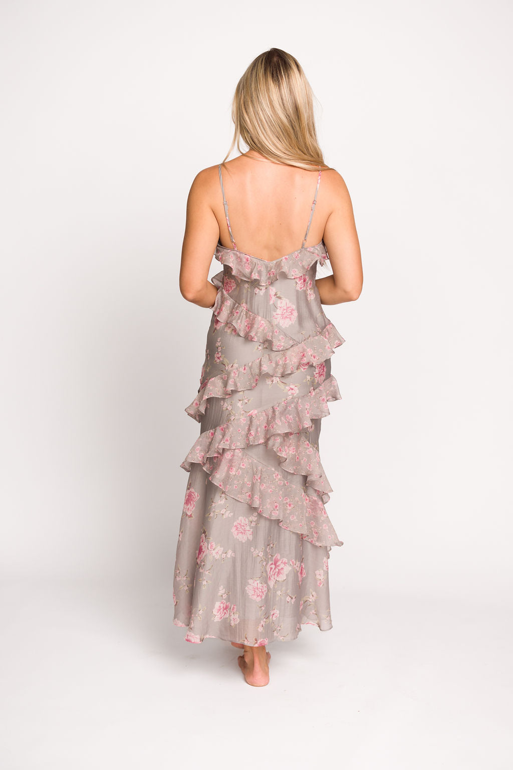 Amelia Ruffle Maxi Dress in Grey/Pink Floral *Final-Sale*