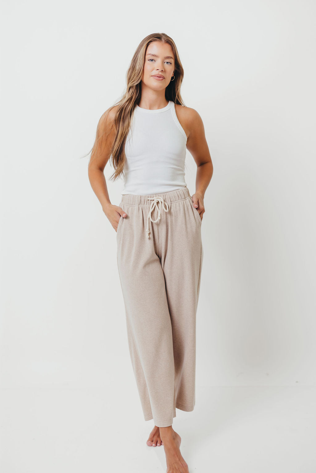 GARMENT DETAILS: Cozy knit sweatpants with elasticated waistband, drawstring detail, with side and back pockets.
