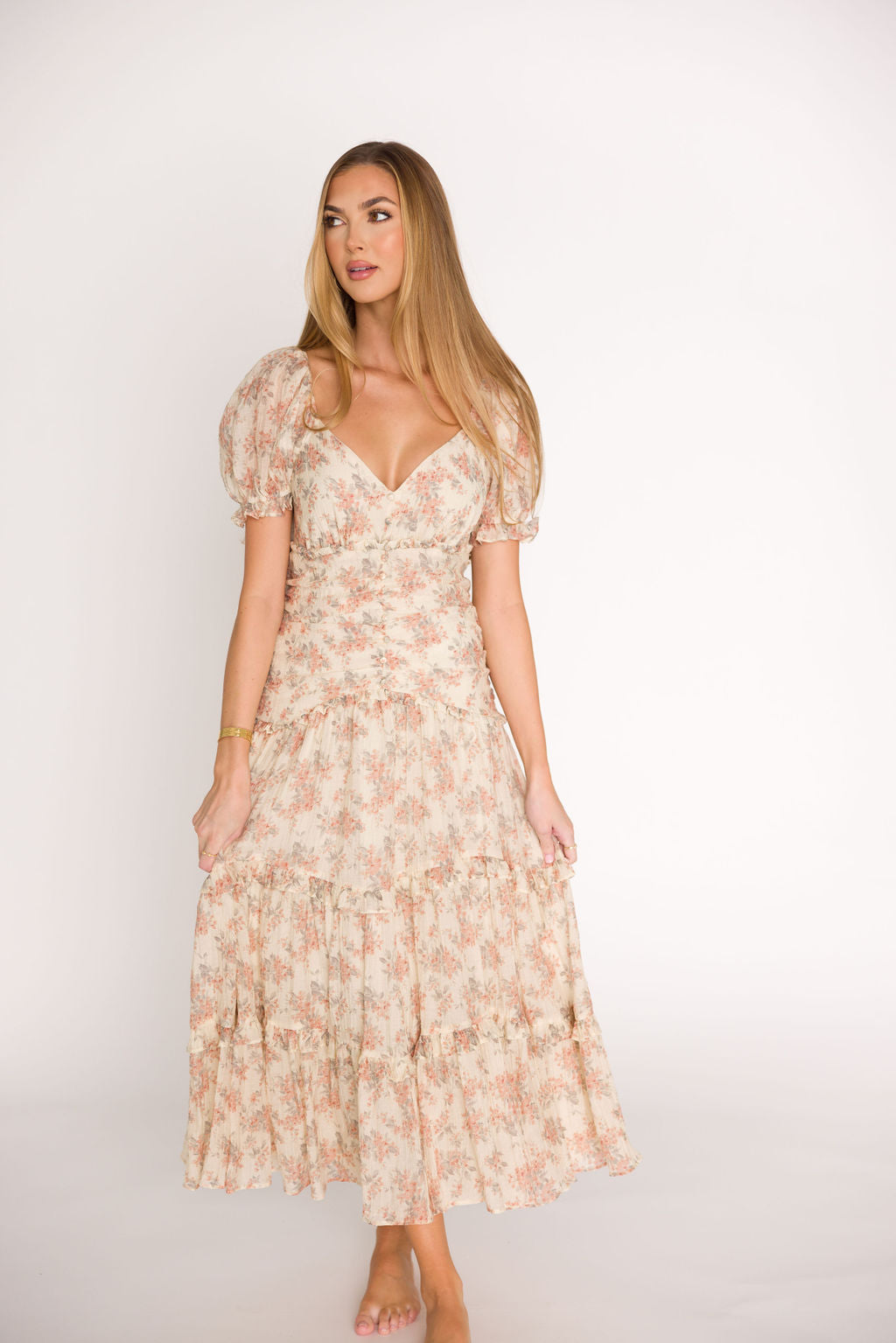 GARMENT DETAILS: Elegant maxi dress features sweetheart neckline, gathered bust, and dropped waist, with a ruched bodice with front button closure. Features short puffed sleeves and multi-tiered maxi skirt. Finished with ruffled accents.
