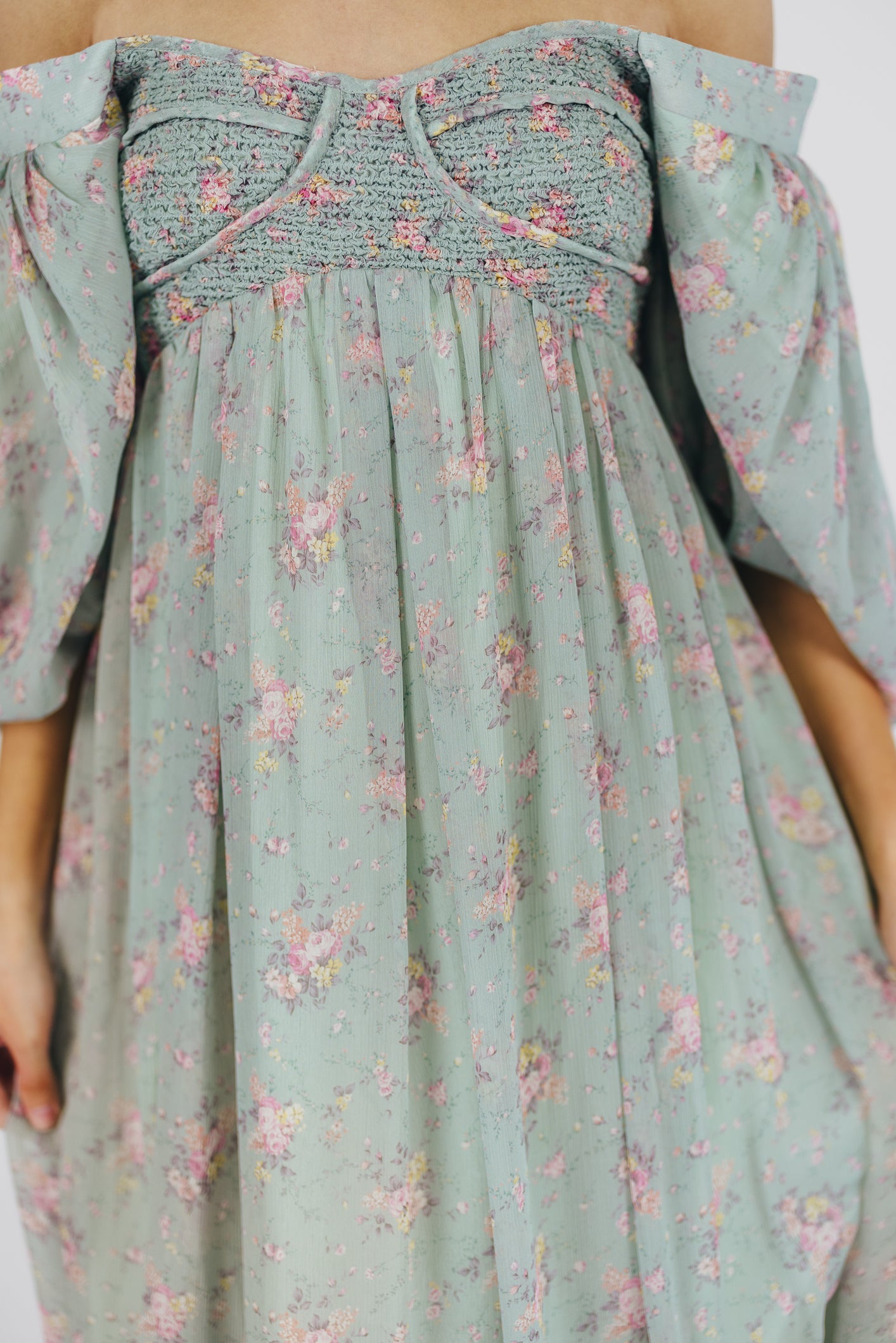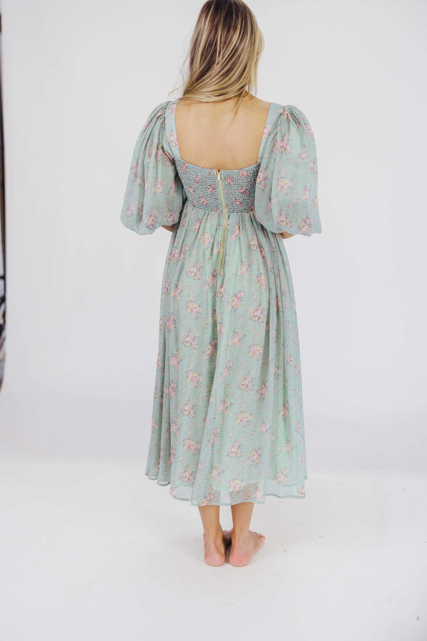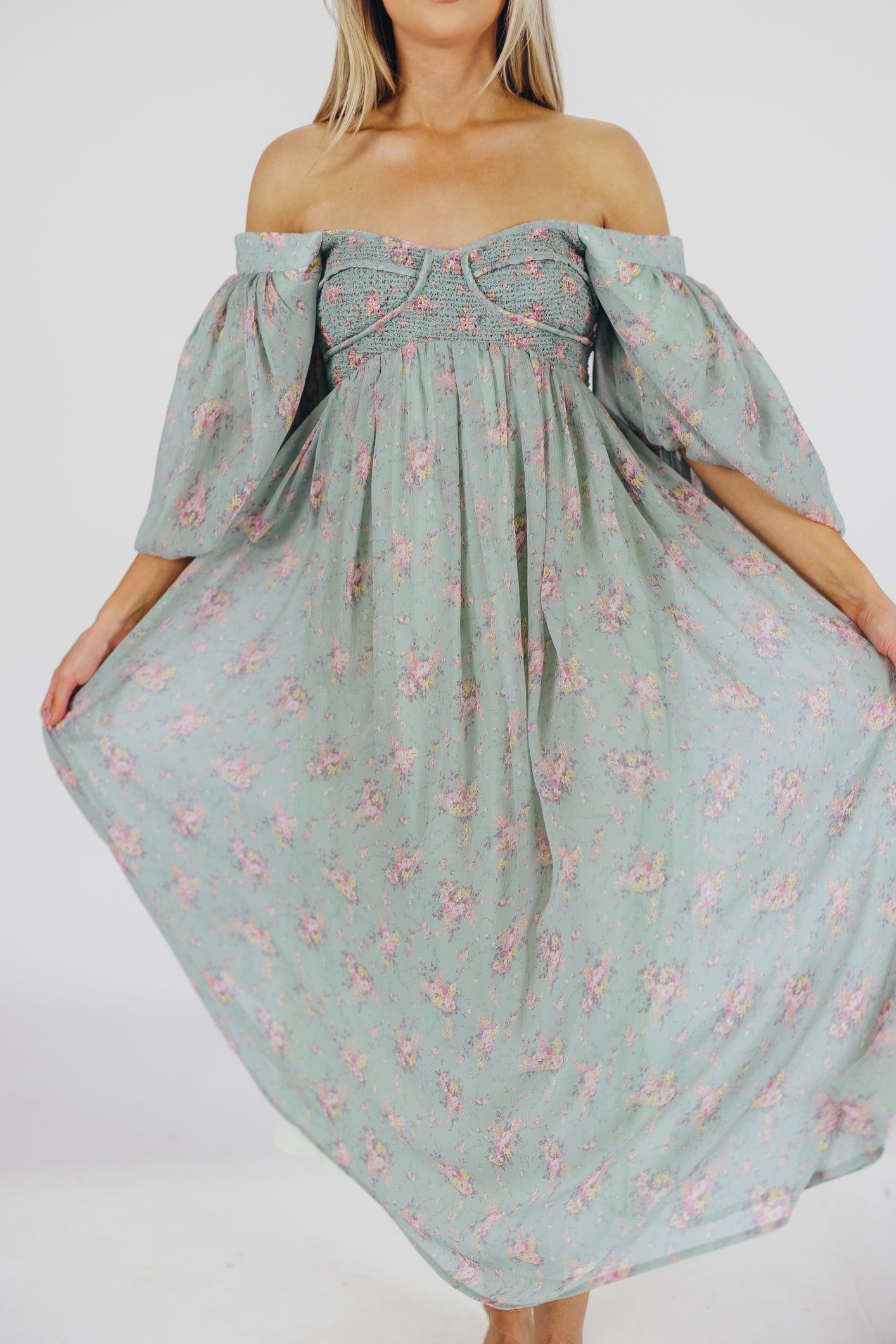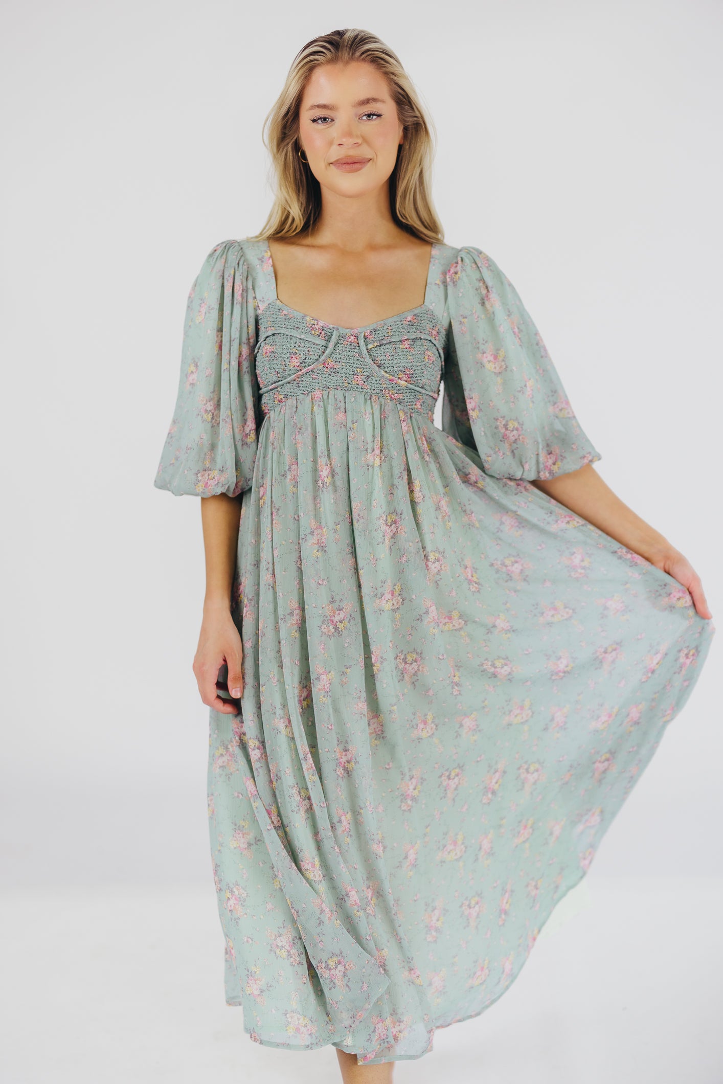 GARMENT DETAILS: Lightweight maxi in a floral print. Features an empire waist silhouette and structured bustier-style bodice, with smocking in the back. Finished with statement puffed sleeves, voluminous skirt, and back zipper. Lined.