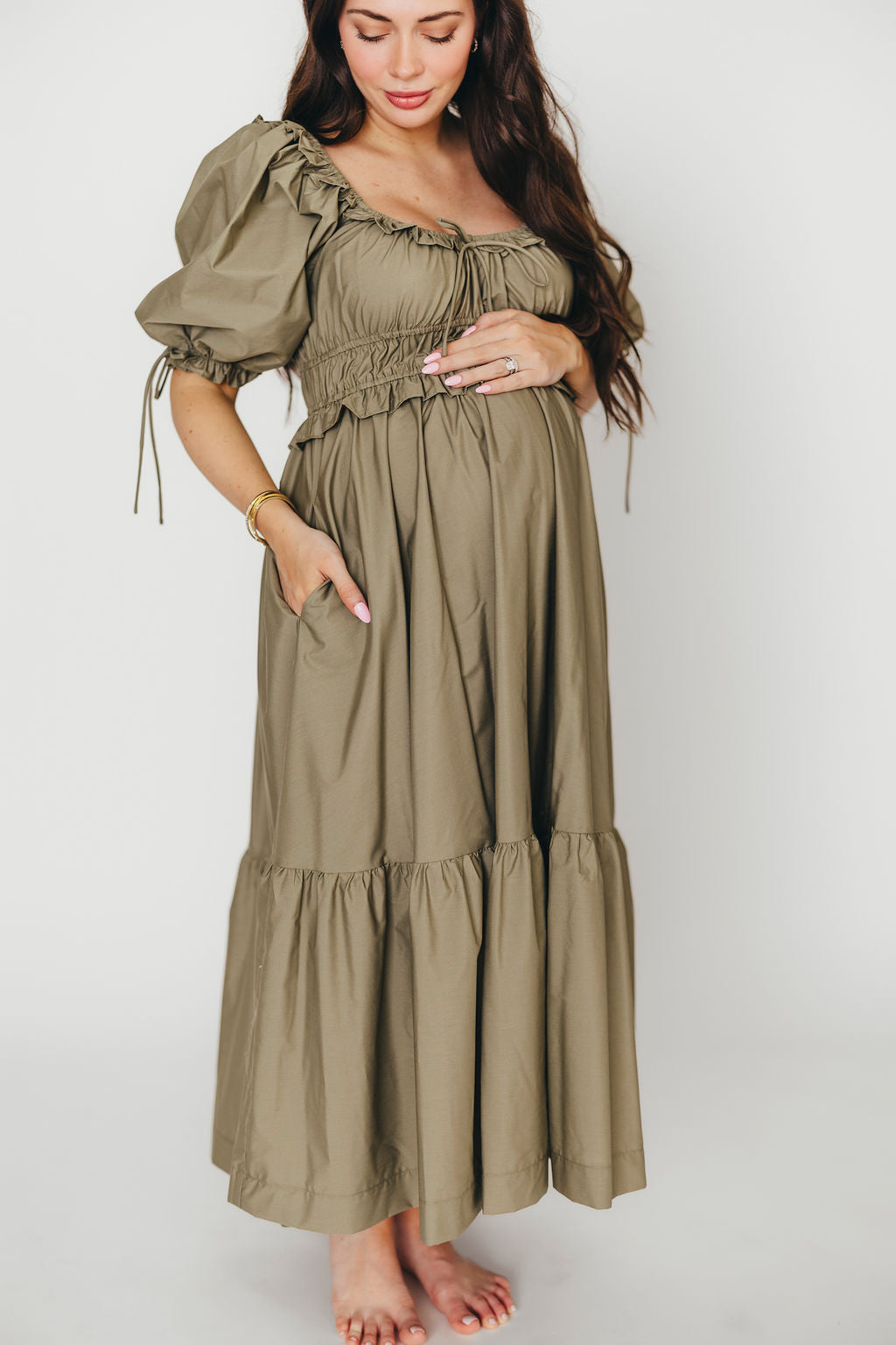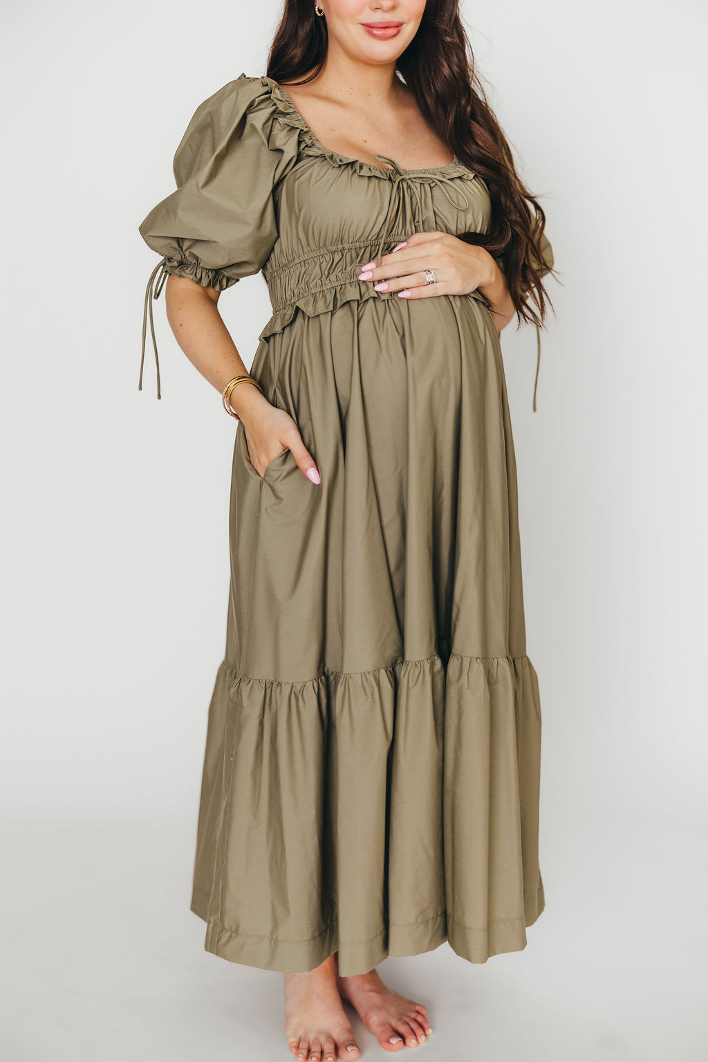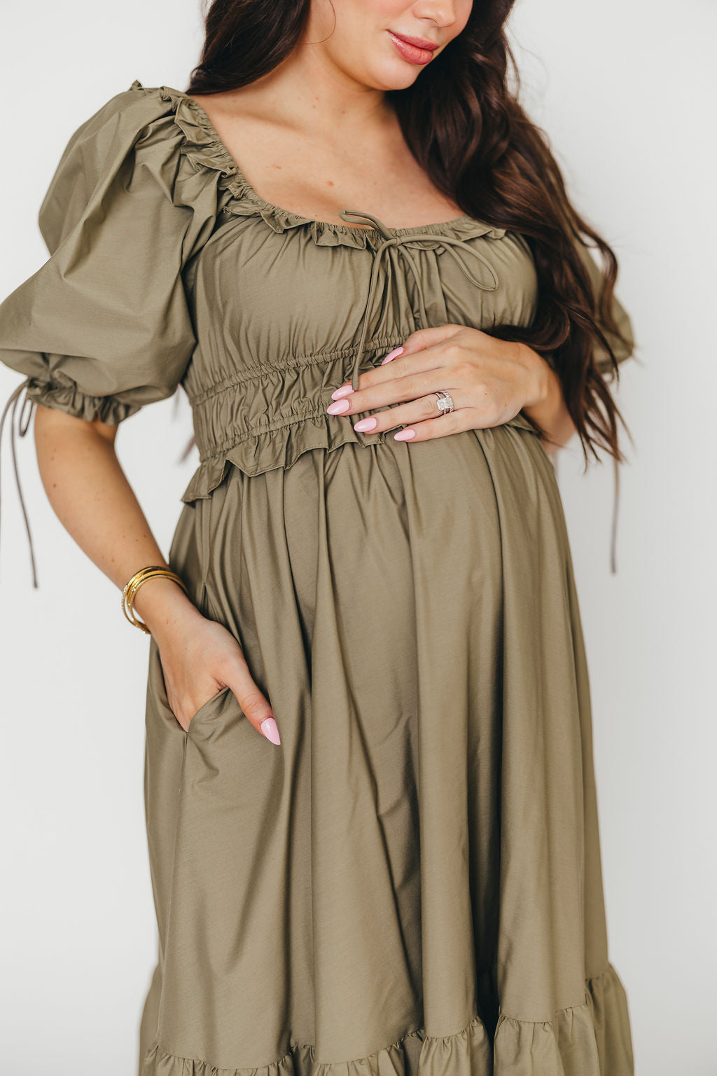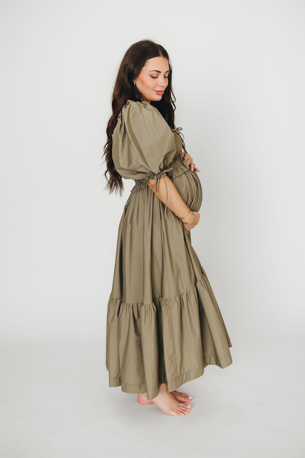 Crissy Ruched Midi Dress in Dusty Olive - Bump Friendly *Final Sale*
