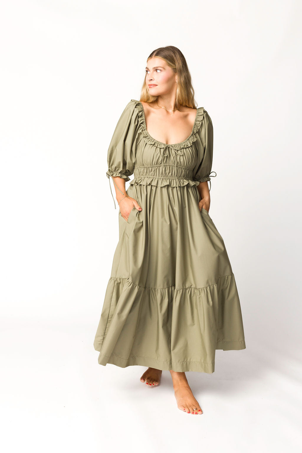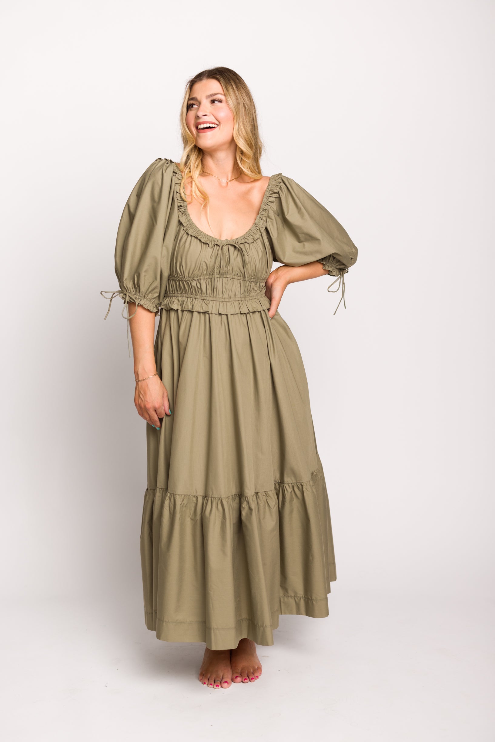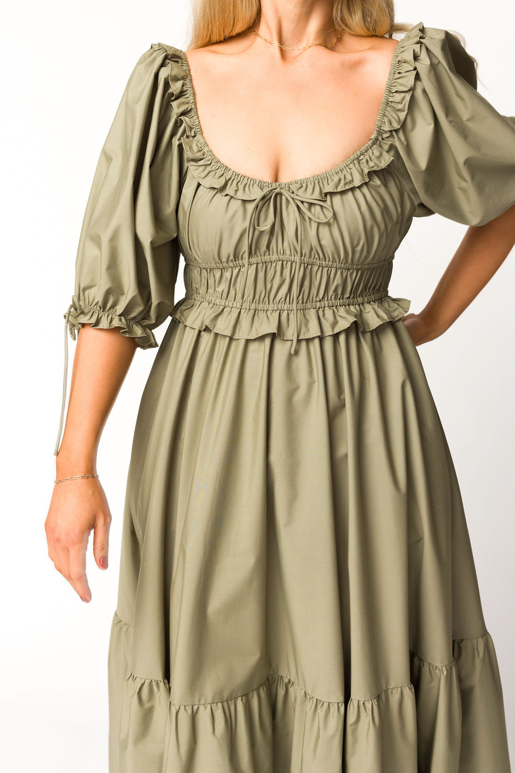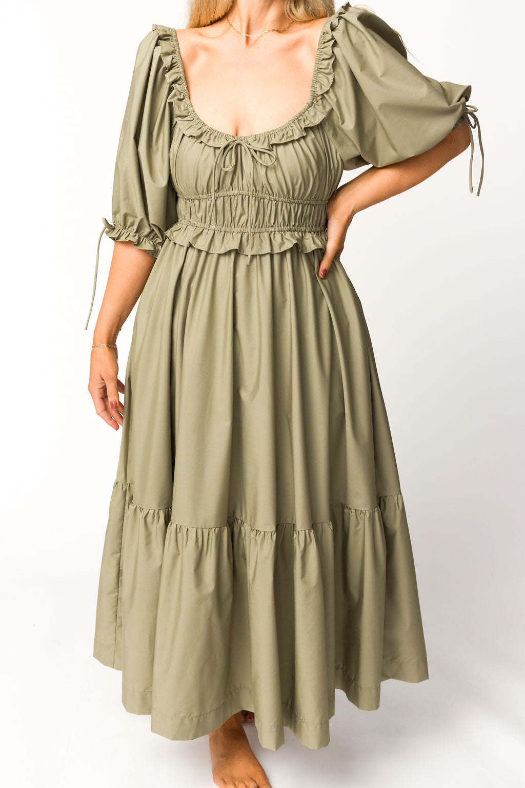 GARMENT DETAILS: Lightweight cotton-blend poplin dress in a long midi length. Features a scooped neckline with ruffle accents, statement puffed sleeves, and a gathered waist with ruching. Finished with a full, multi-tiered skirt. Sleeves may be worn on or off the shoulders.