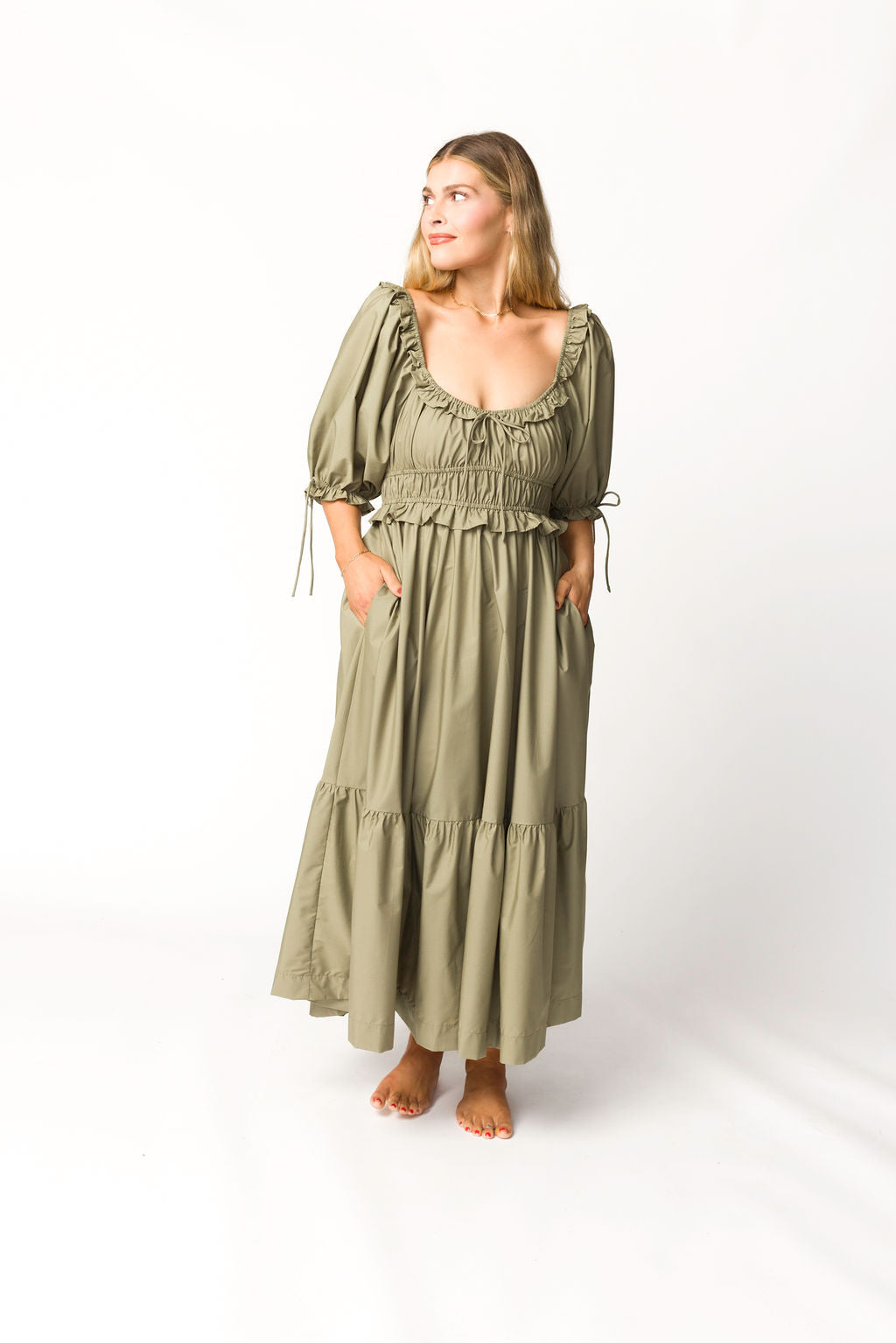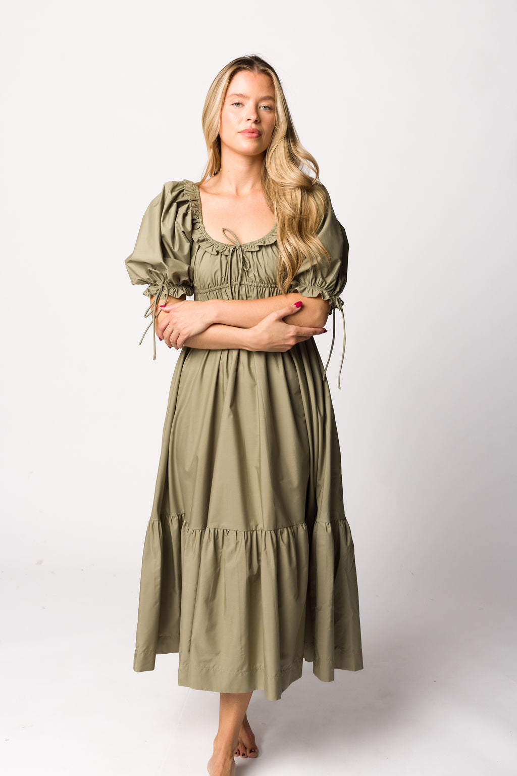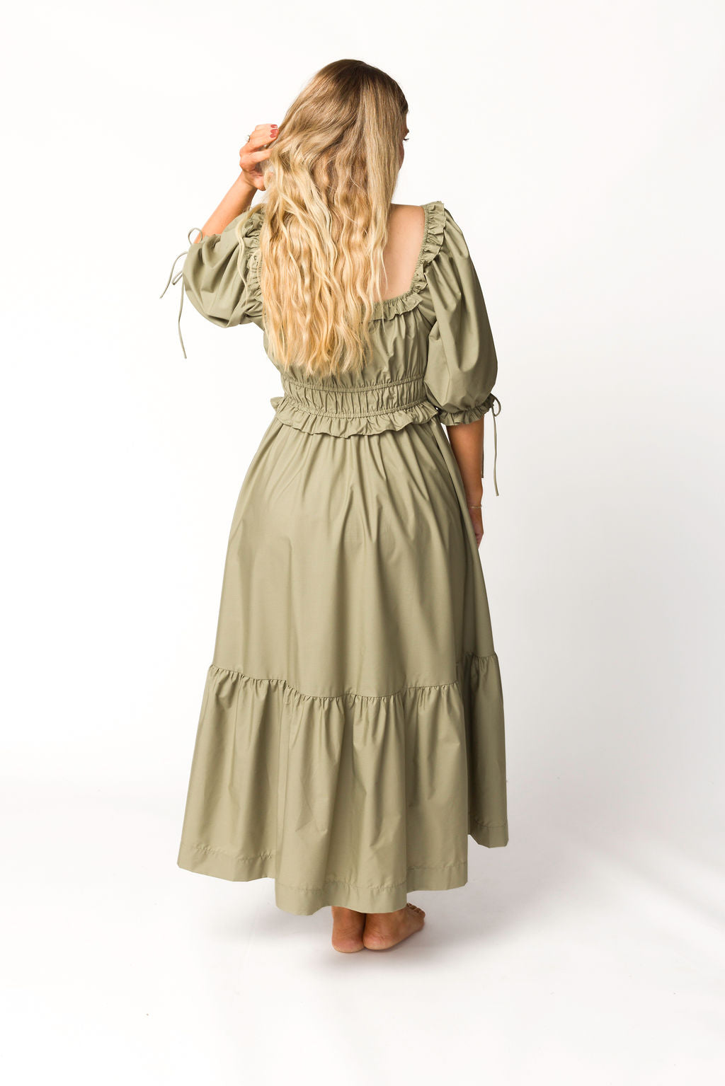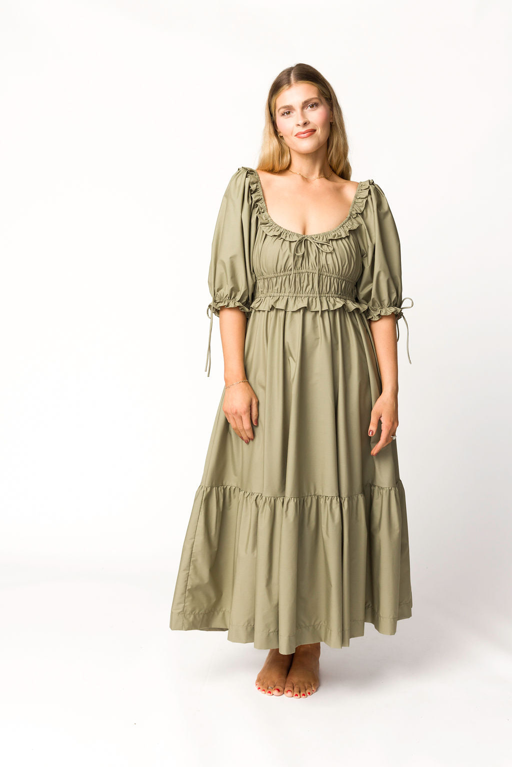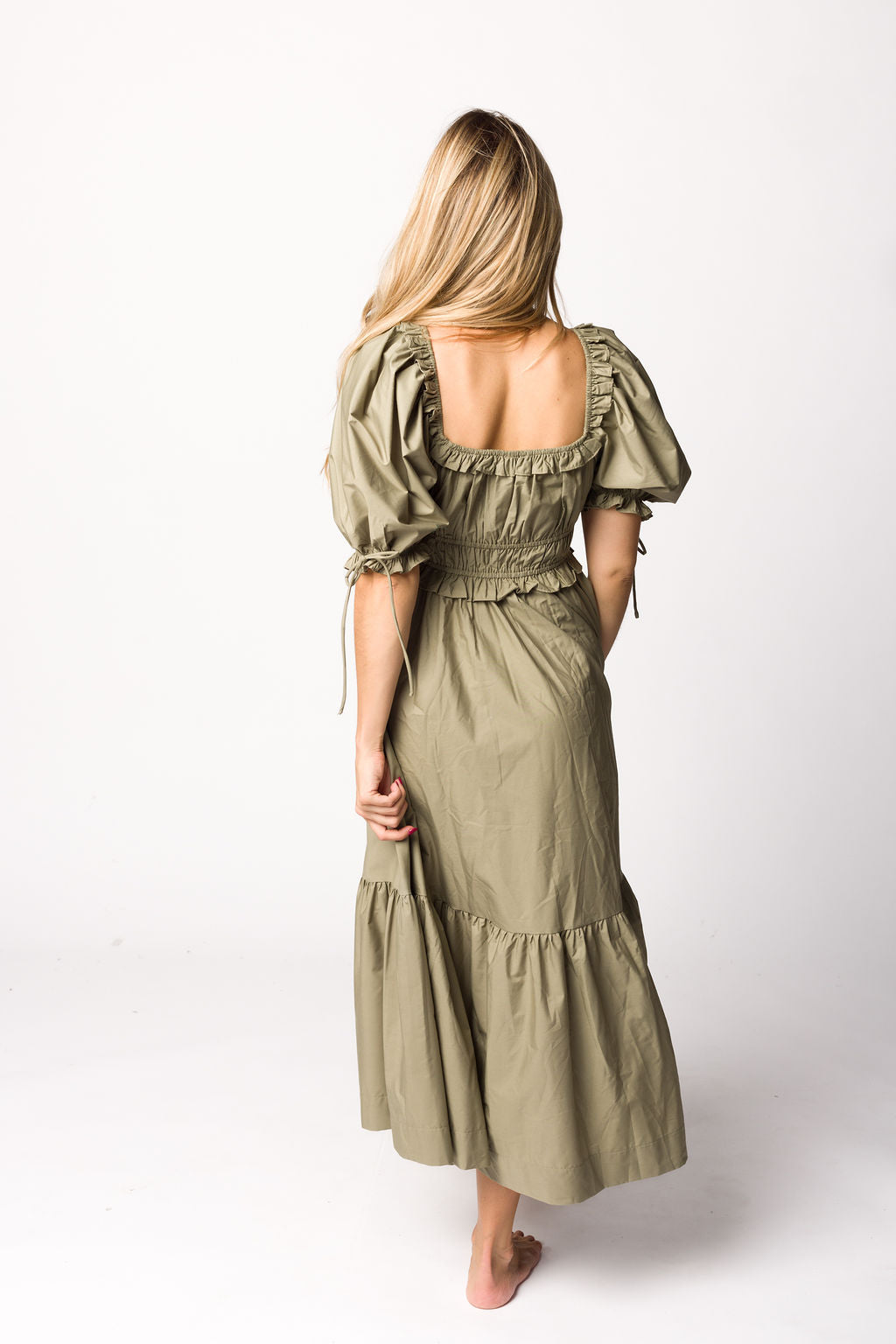 GARMENT DETAILS: Lightweight cotton-blend poplin dress in a long midi length. Features a scooped neckline with ruffle accents, statement puffed sleeves, and a gathered waist with ruching. Finished with a full, multi-tiered skirt. Sleeves may be worn on or off the shoulders.