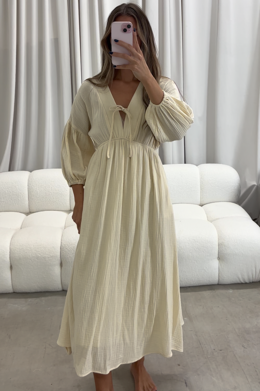 GARMENT DETAILS: Lightweight cotton maxi dress. Features V-neckline with self-tie detail, inverted empire waist, and full skirt with in-seam pockets. Finished with long balloon sleeves. This colorway is lined.