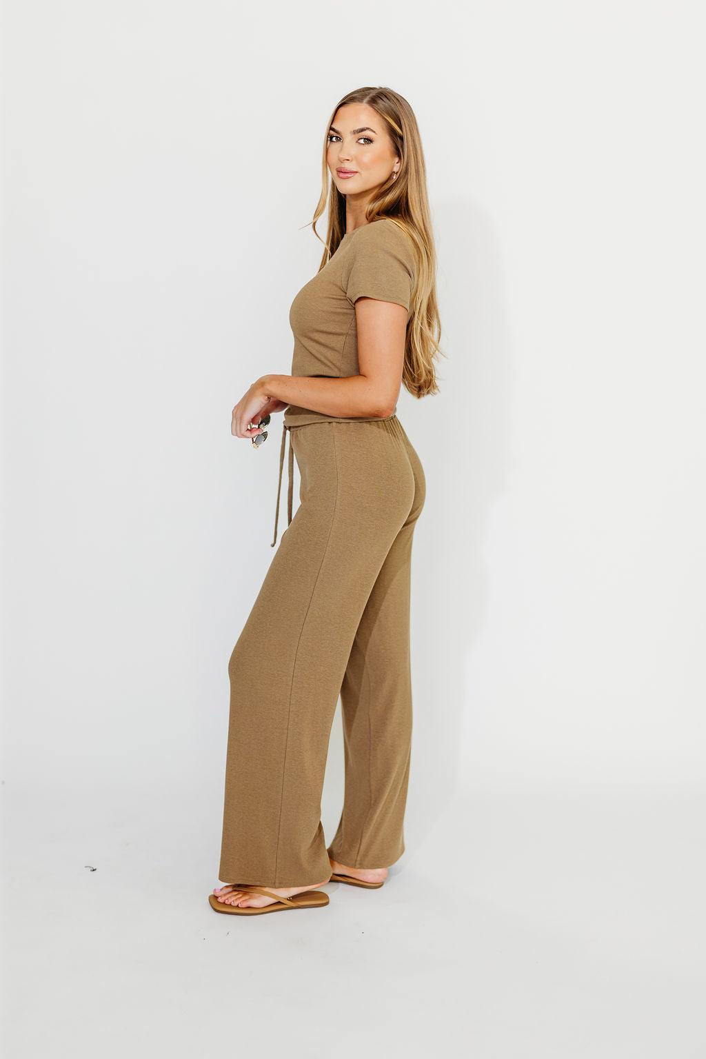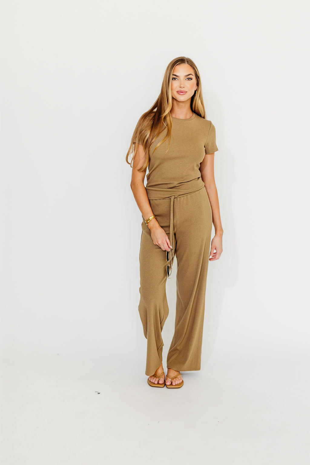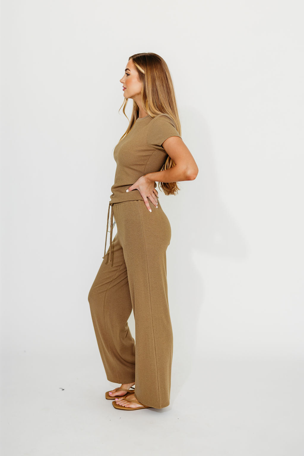 GARMENT DETAILS: Premium, buttery soft ribbed knit top and pants set. Top features a crew neckline and short sleeves; pants feature a full-length, wide leg, with drawstring waistband.