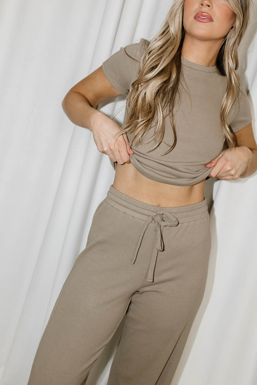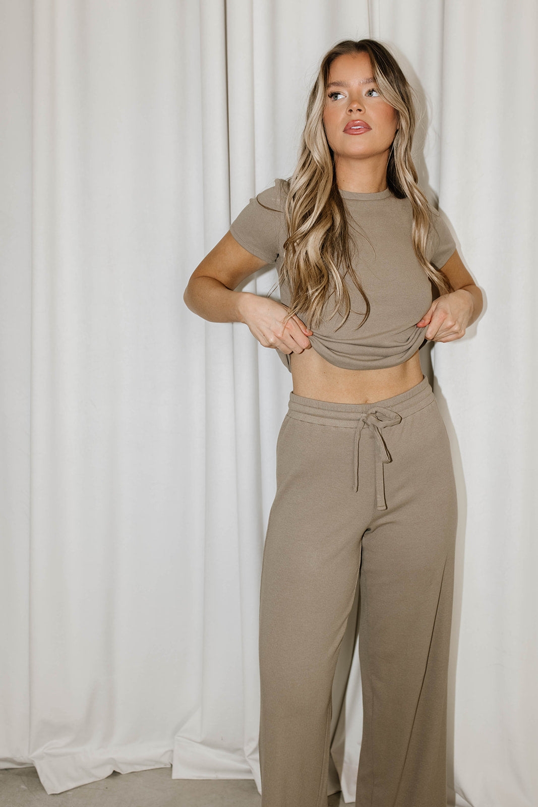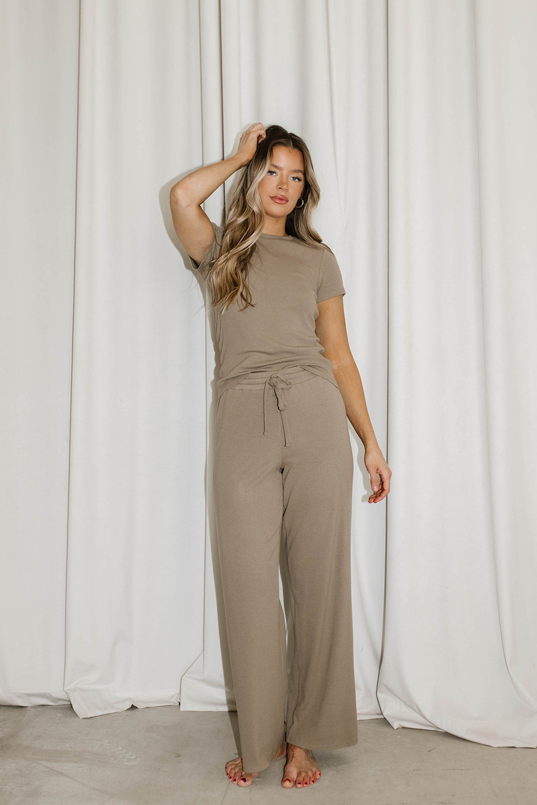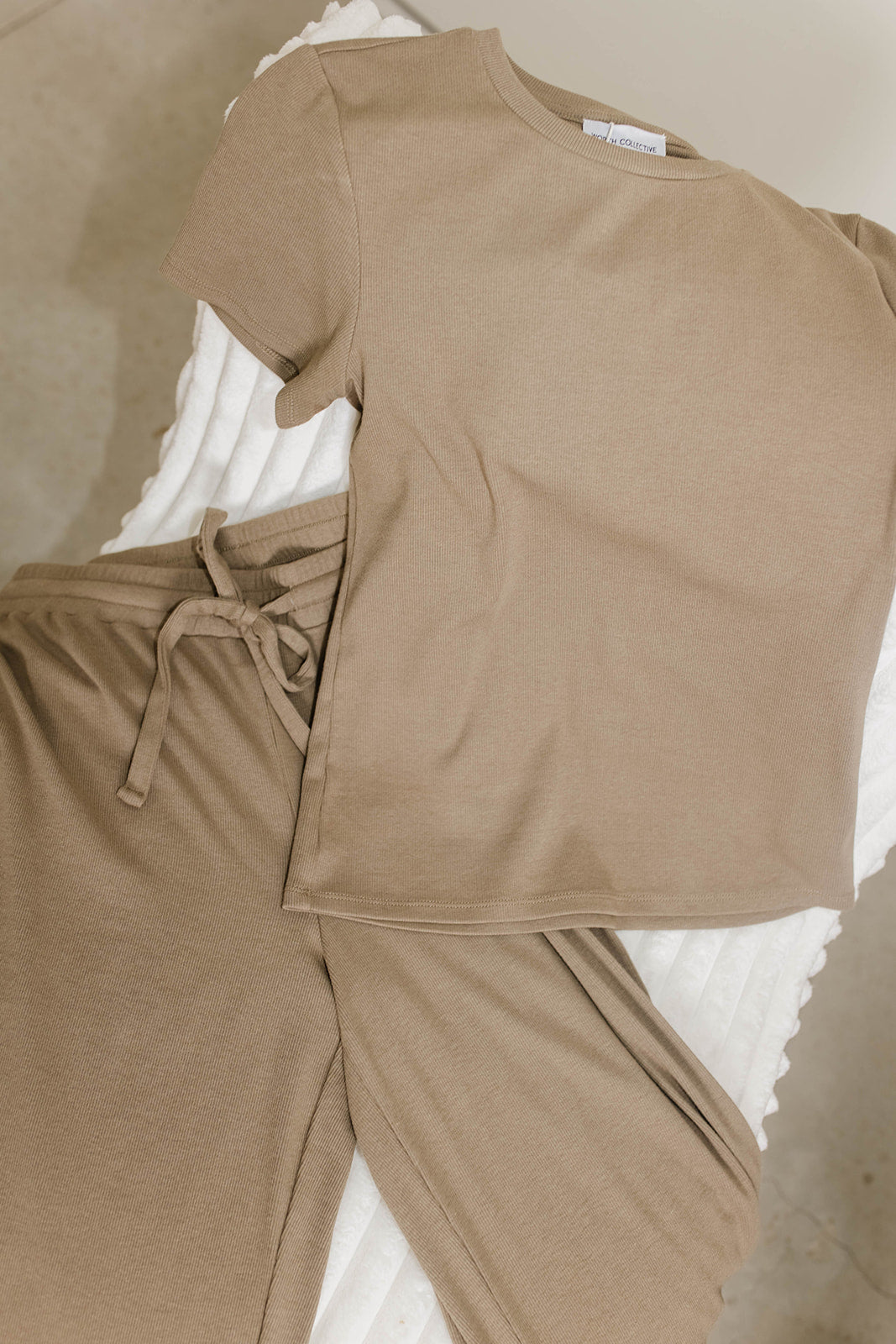 GARMENT DETAILS: Premium, buttery soft ribbed knit top and pants set. Top features a crew neckline and short sleeves; pants feature a full-length, wide leg, with drawstring waistband.