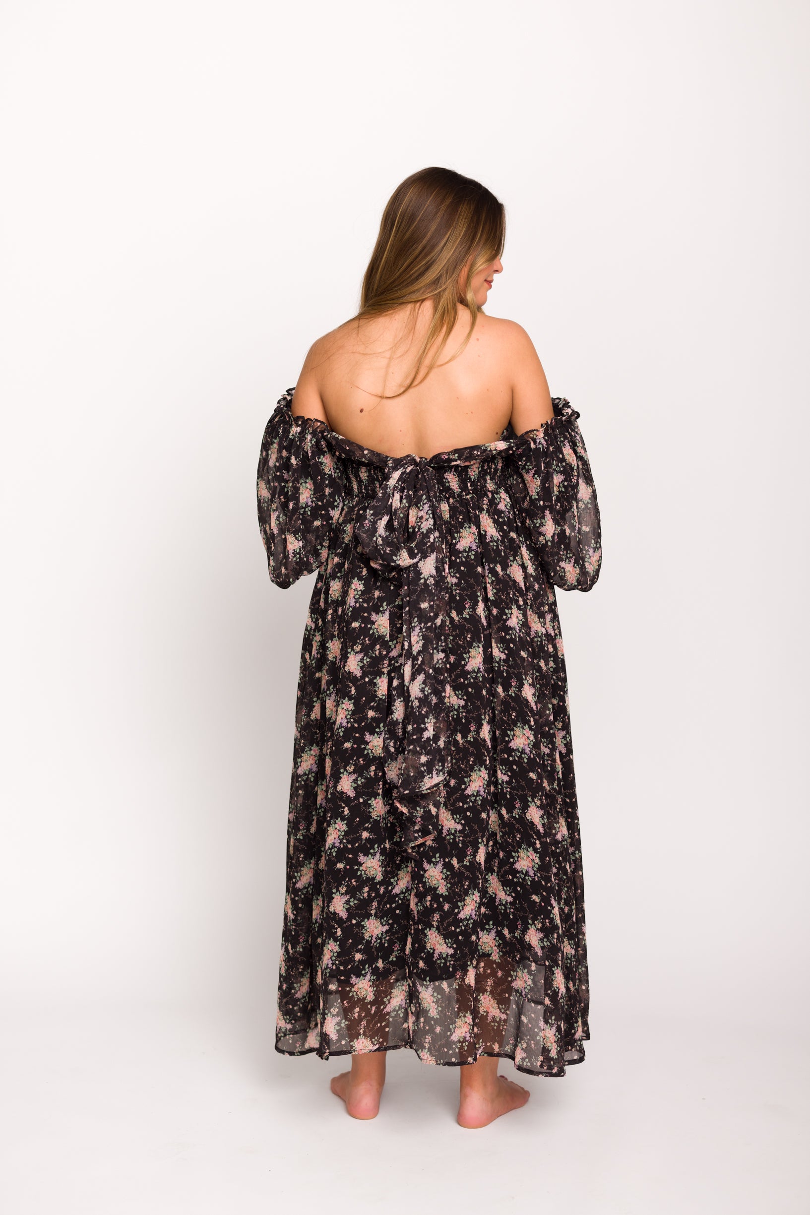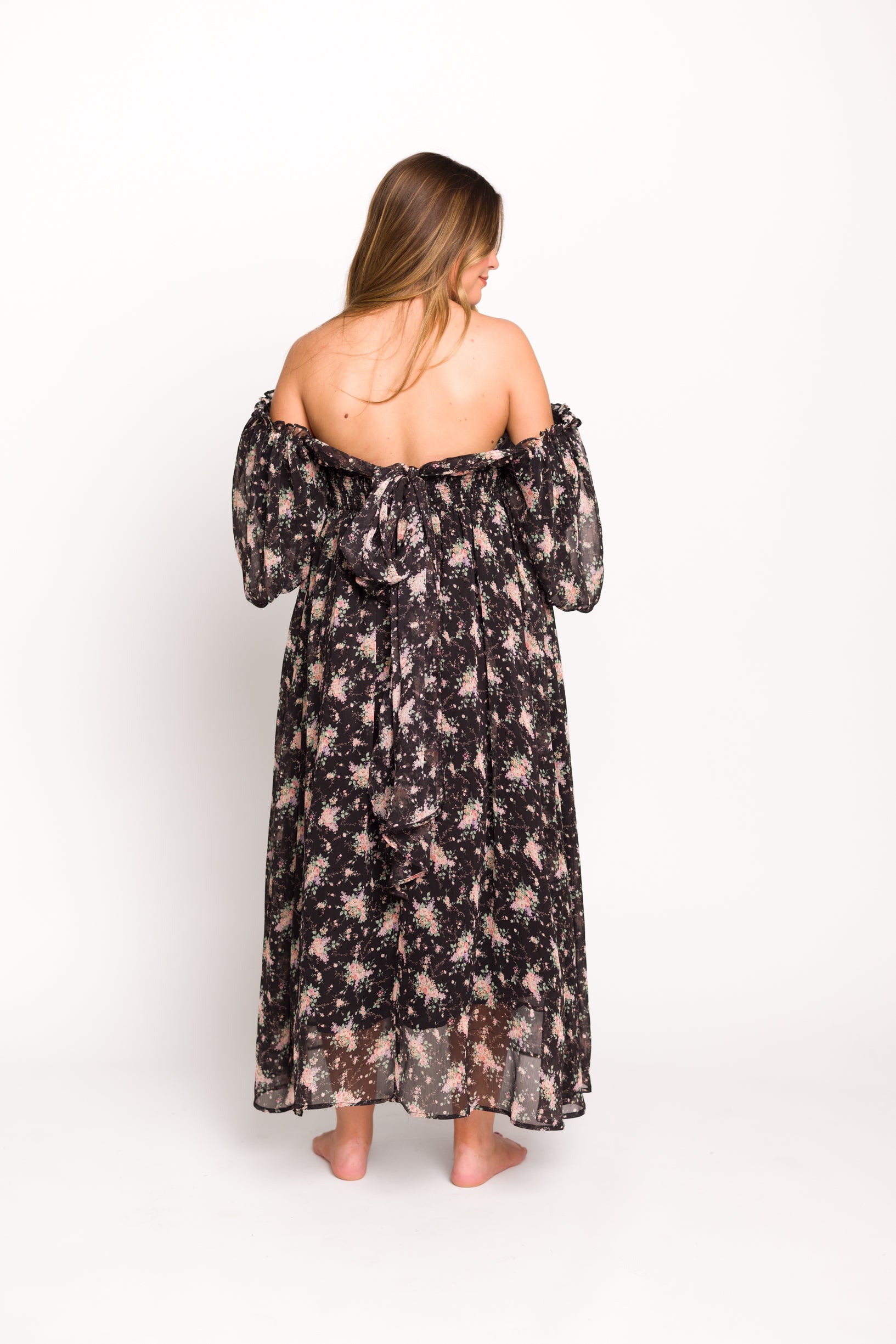 GARMENT DETAILS: Maxi dress with empire waist silhouette, square neckline, and pleated bodice with smocked back panel. Finished with 1/2 length balloon sleeves that can be worn on or off the shoulder, and a low, dramatic back with self-tie bow detail.