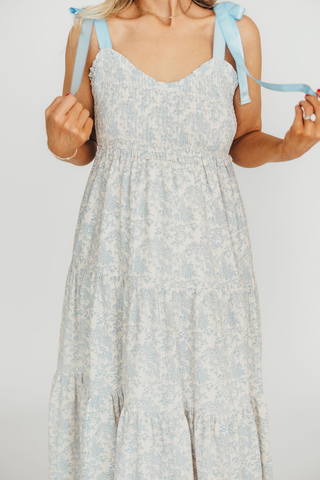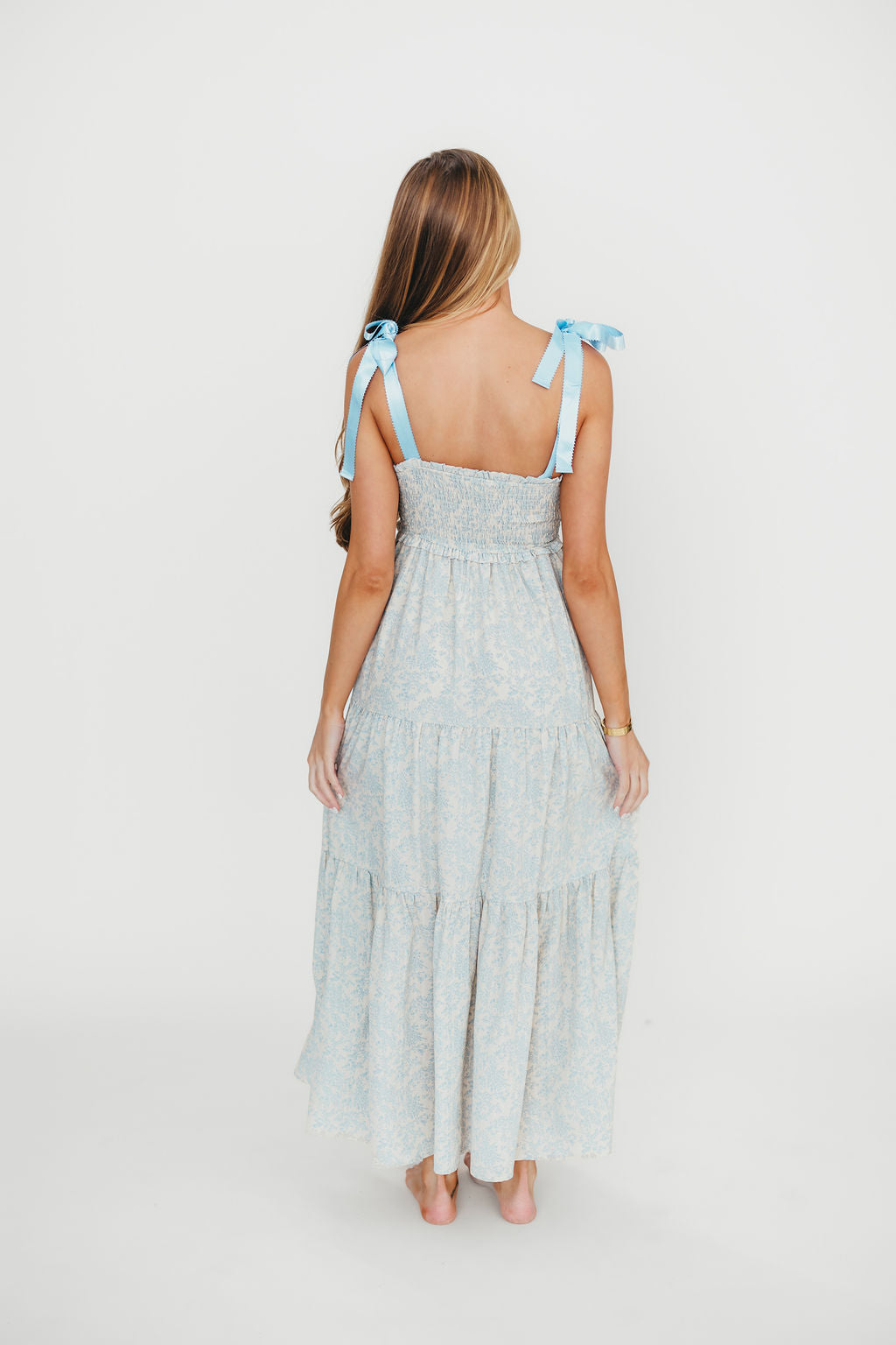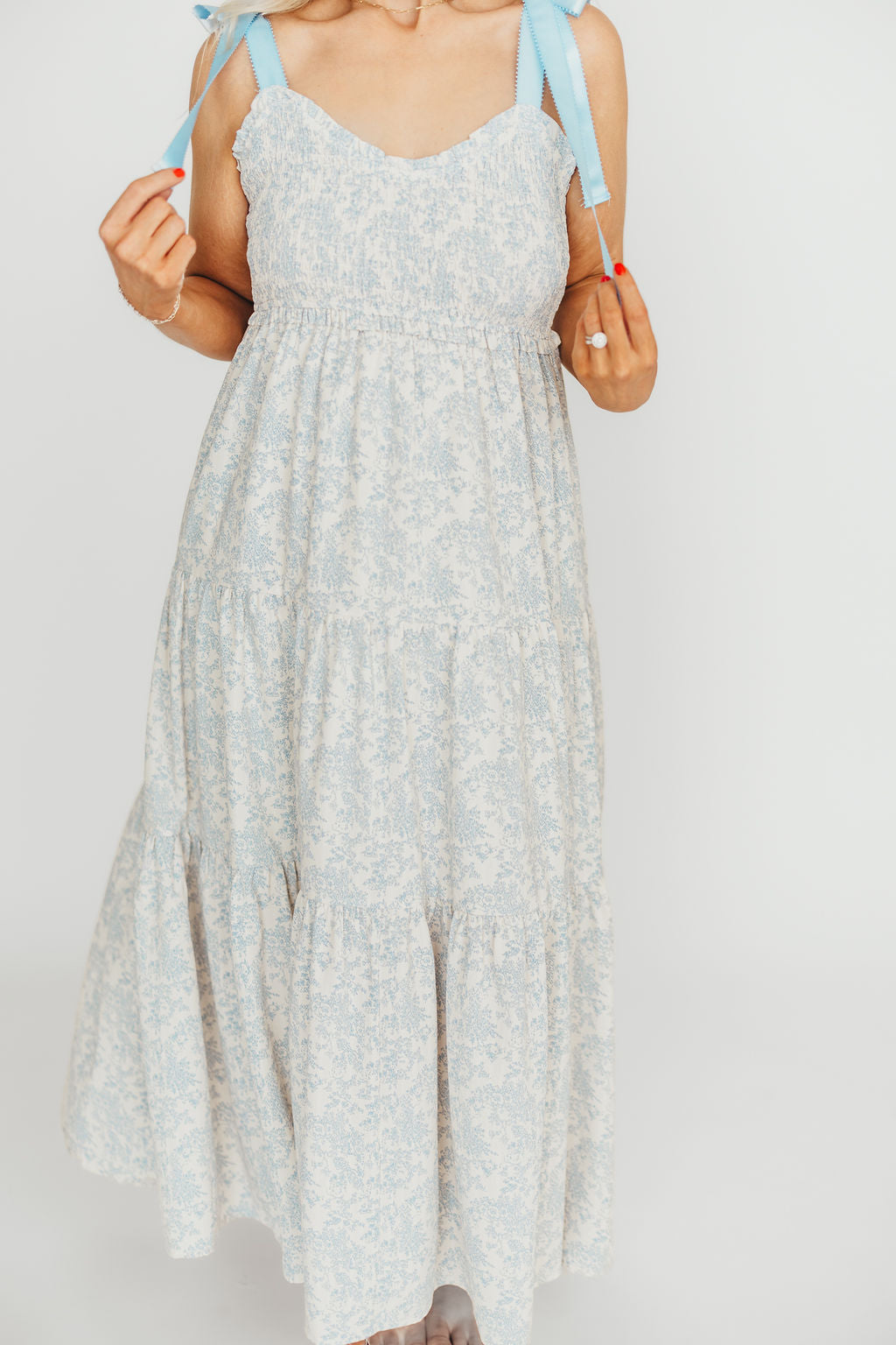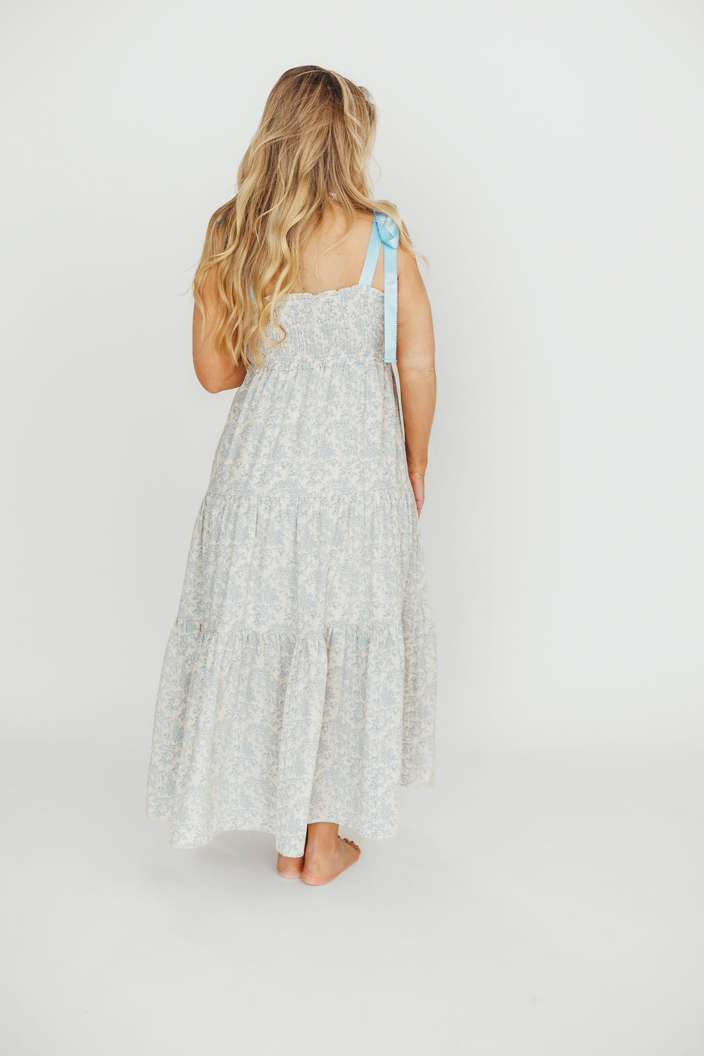GARMENT DETAILS: Lightweight, sleeveless maxi dress with sweetheart neckline, adjustable tie straps, and fully smocked bodice. Features a multi-tiered skirt and ruffled accents.