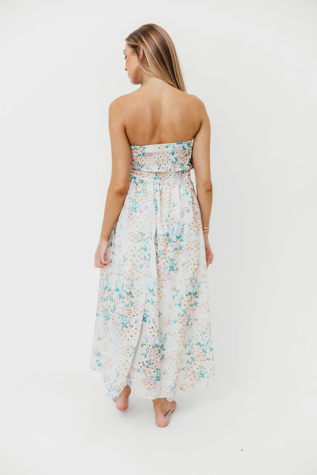 Rosella Floral Eyelet Lace Ruched Tube Maxi Dress in Spring Bloom