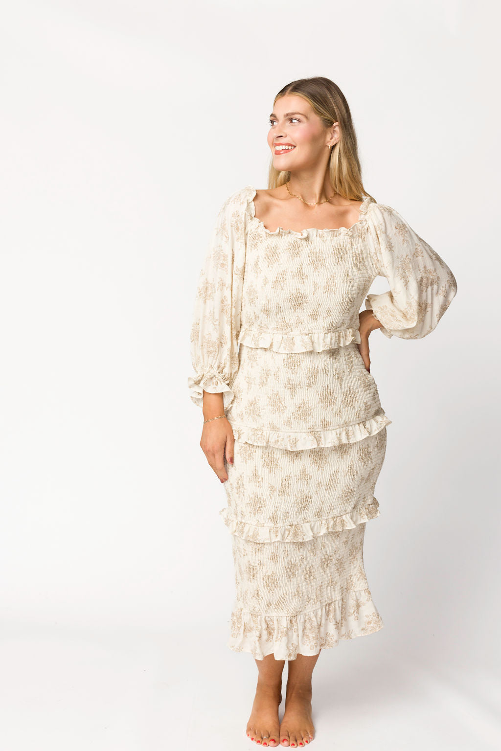 The search is over, babe--you've found the perfect special-event dress for year round wear. The new Chloe Midi Dress has all the details you've come to expect from premium Worth Collective dresses. It features ruffles, elegant sleeves, and a flattering neckline, plus comfort, thanks to its smocked design that cinches you for that hourglass silhouette. You do not want to miss out on this gem of a dress that you can wear in all four seasons (and with many compliments, might we add!)