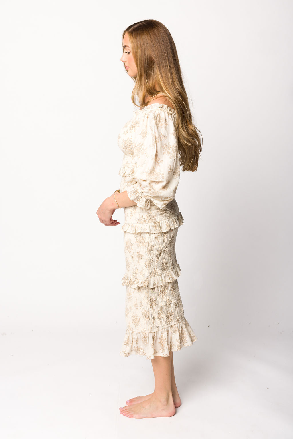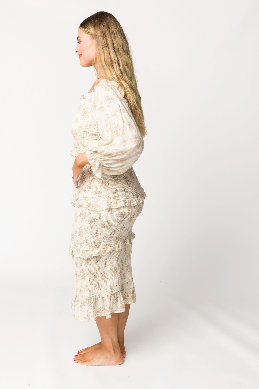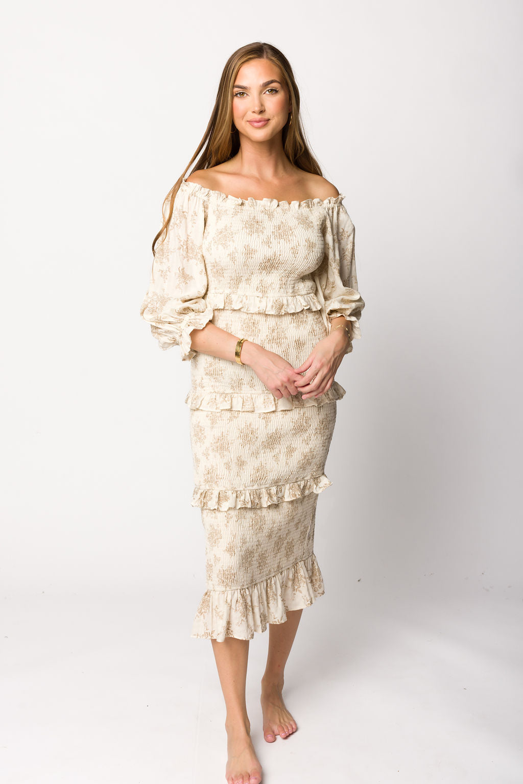 GARMENT DETAILS: Fully smocked midi dress in a comfortable, stretchy design, with 3/4 length sleeves, off-the-shoulder neckline, and multi-tiered skirt. Features ruffle accents throughout, and a fitted, flattering silhouette.