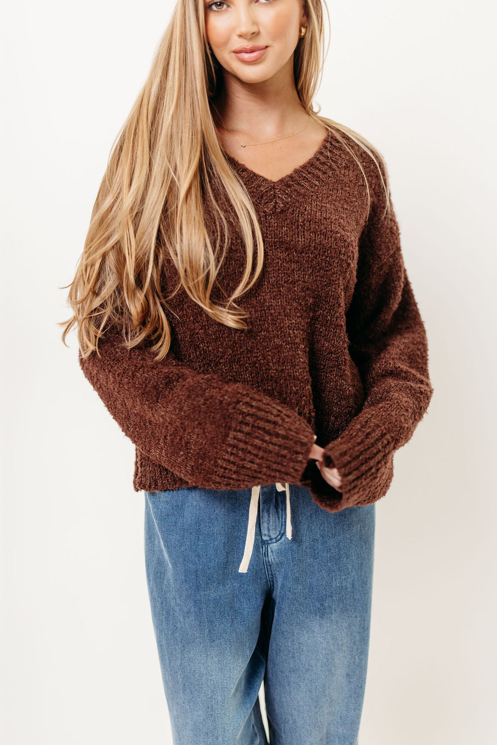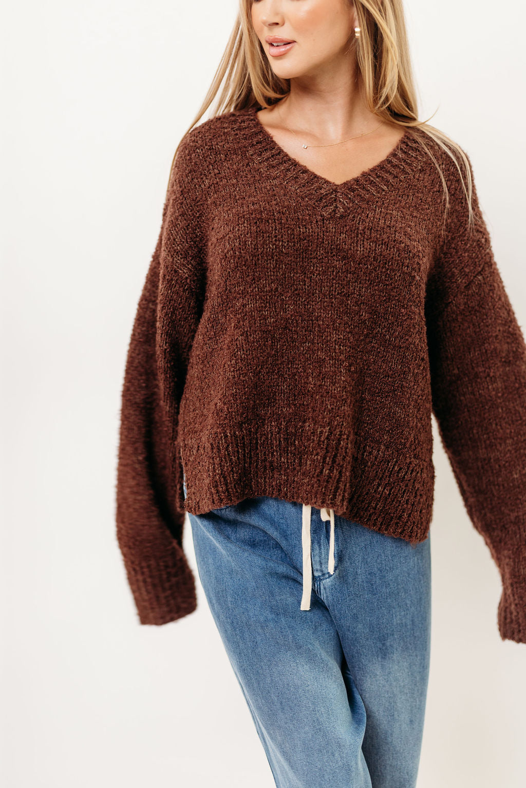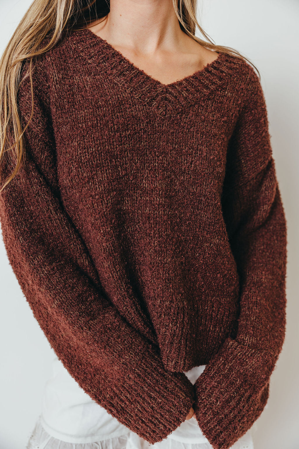 GARMENT DETAILS: Soft knit pullover sweater with V-neckline, ribbed trim, and relaxed fit.