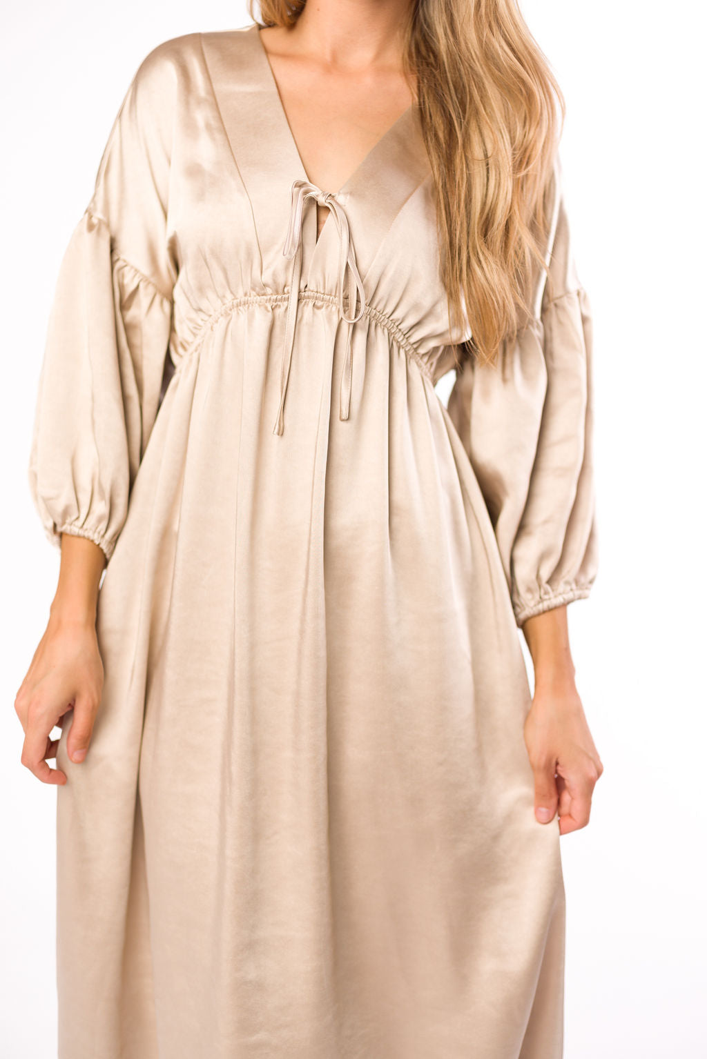 GARMENT DETAILS: Heavyweight, premium quality satin midi dress. Features V-neckline with self-tie detail, inverted empire waist, and full skirt with in-seam pockets. Finished with long balloon sleeves.