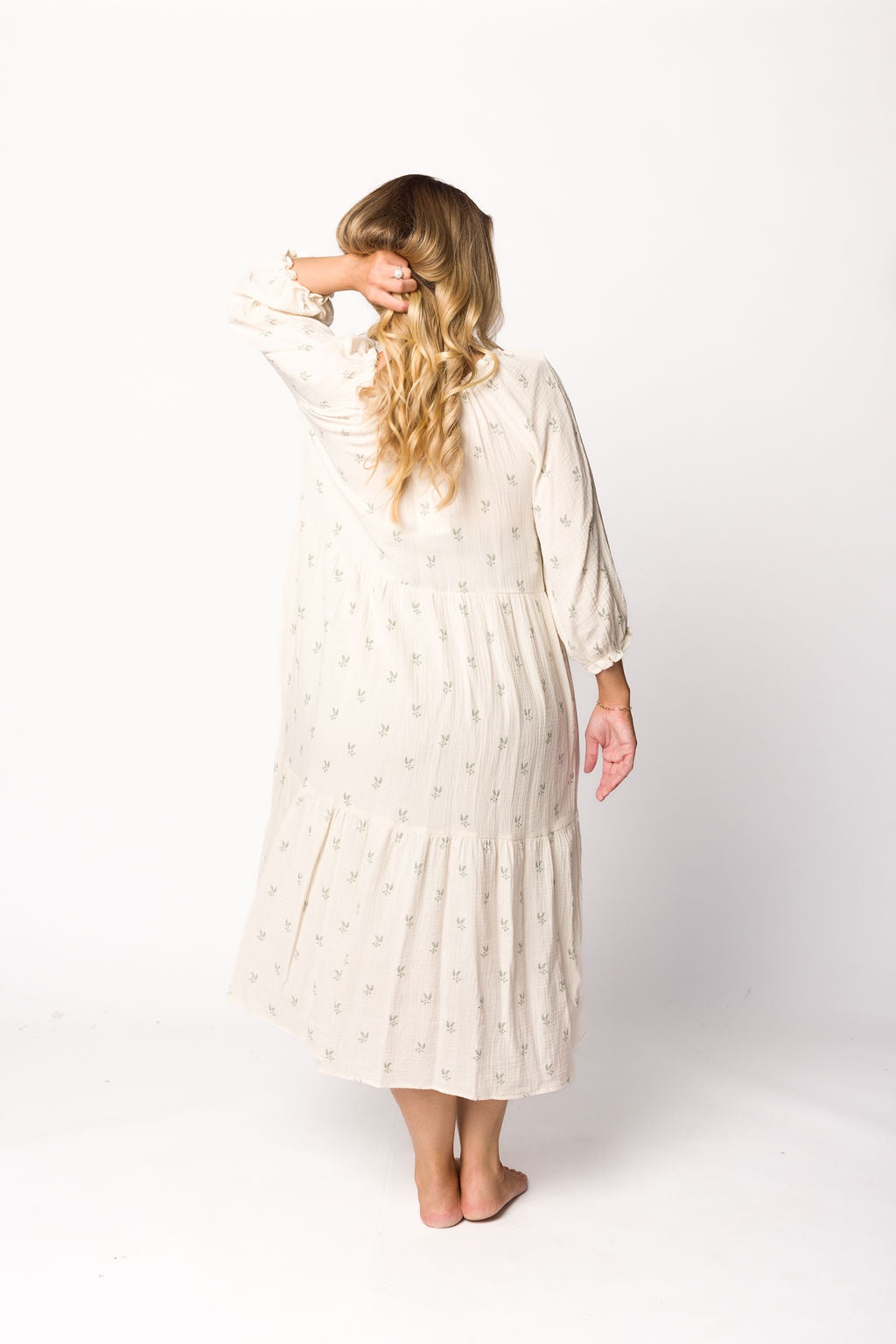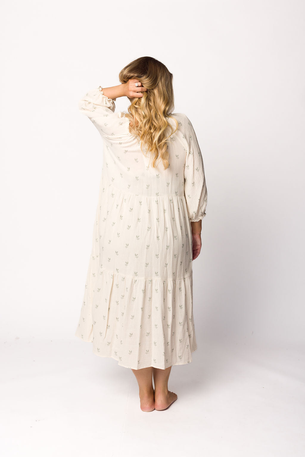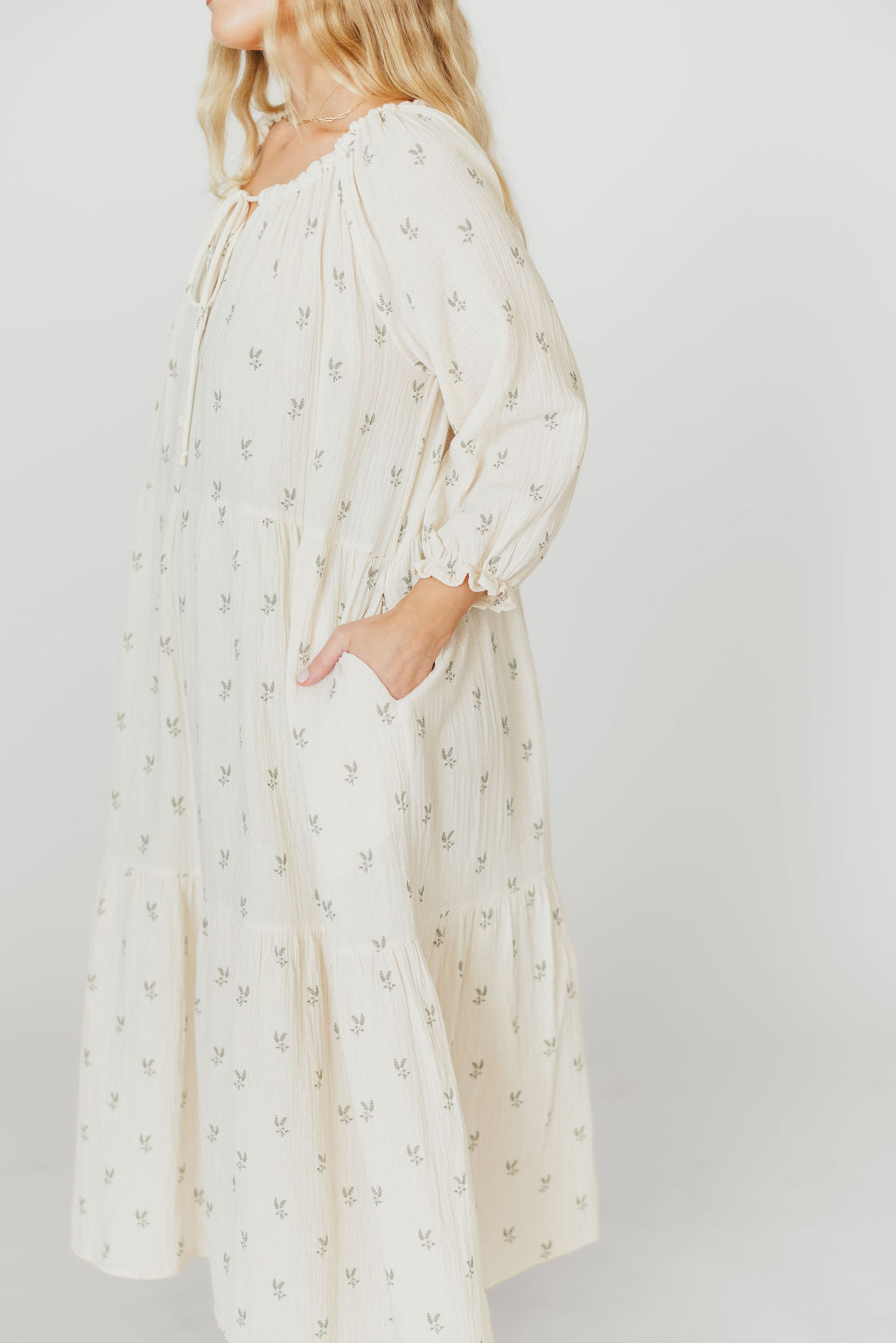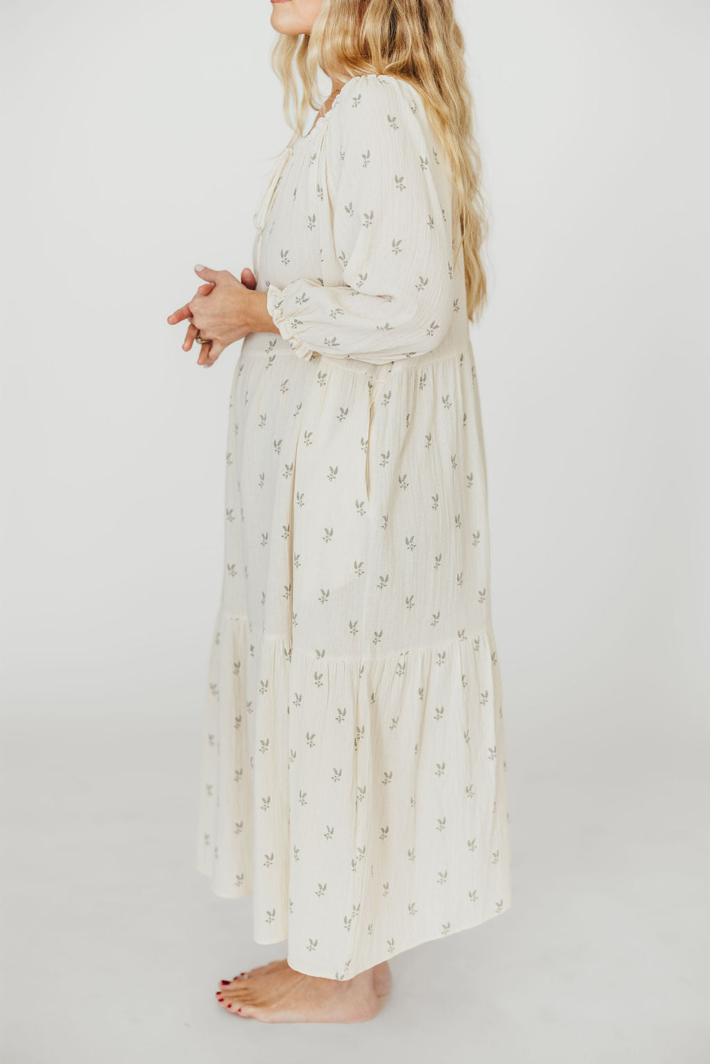 Avery Tiered Linen-Blend Midi Dress in Soy/Sage Foliage - Bump Friendly and Inclusive Sizing *Final-Sale*