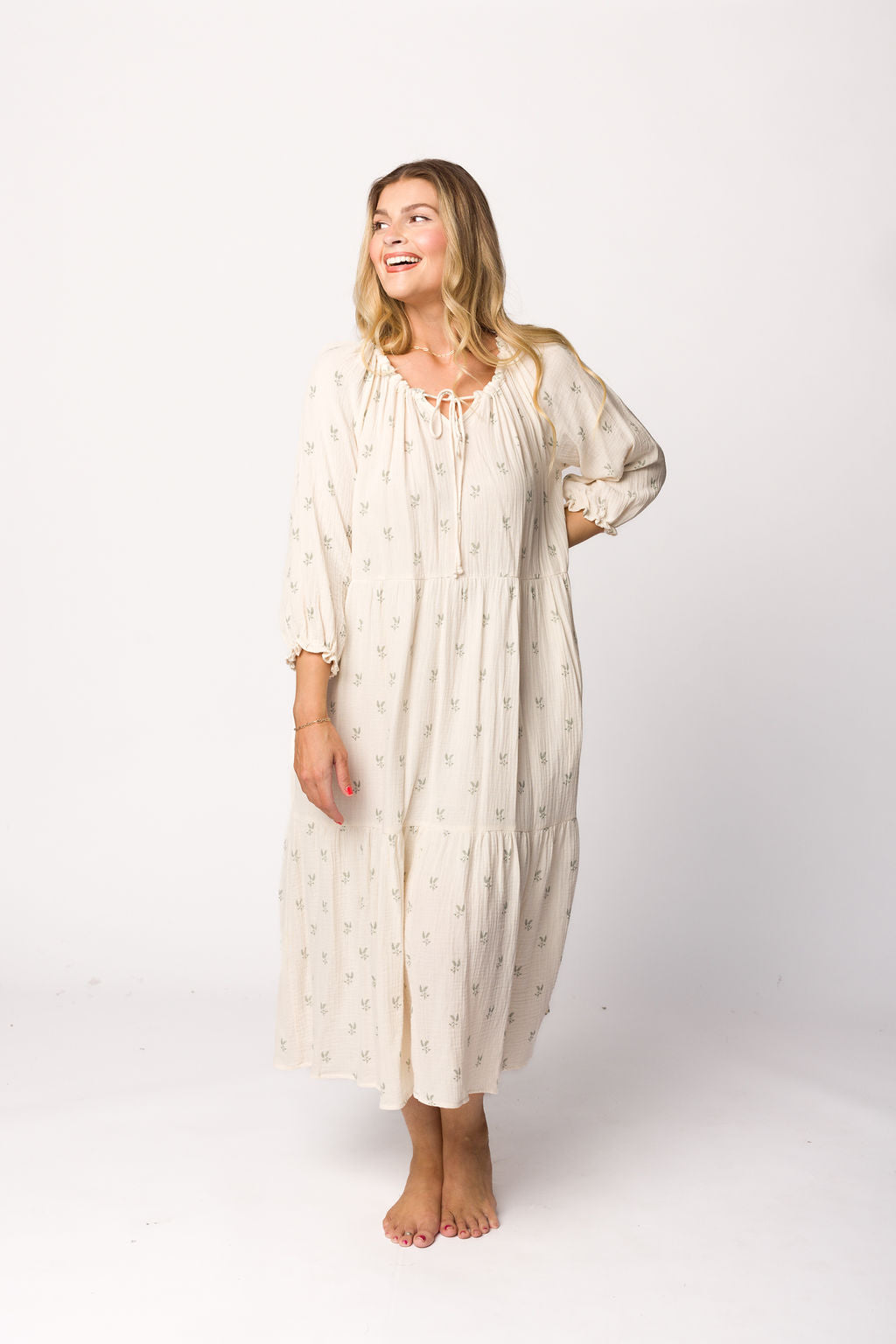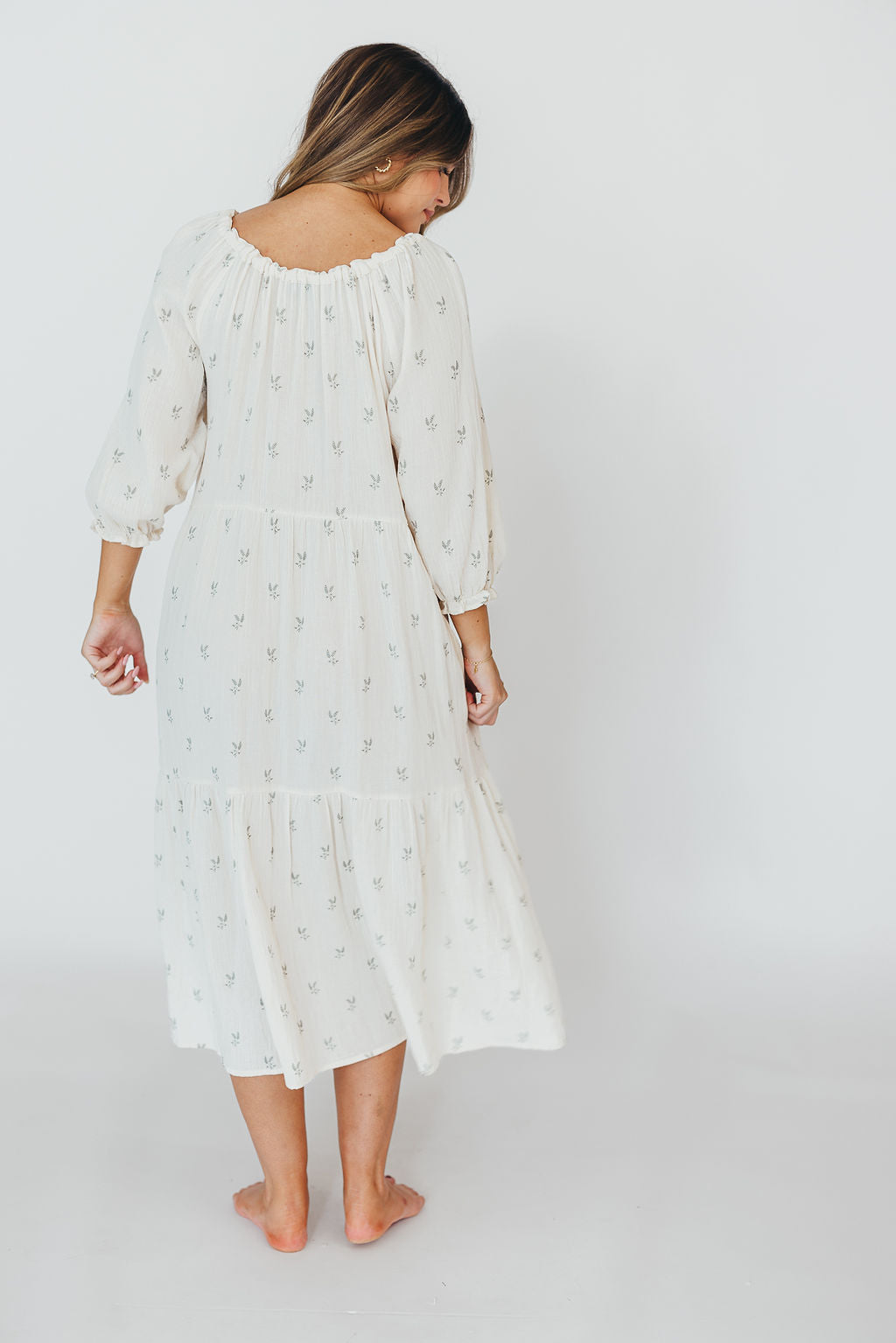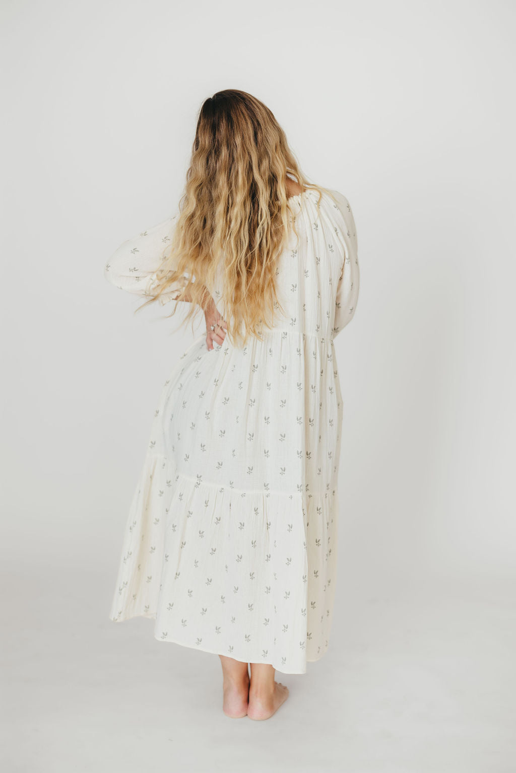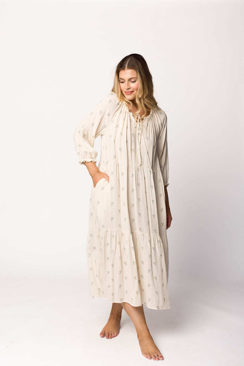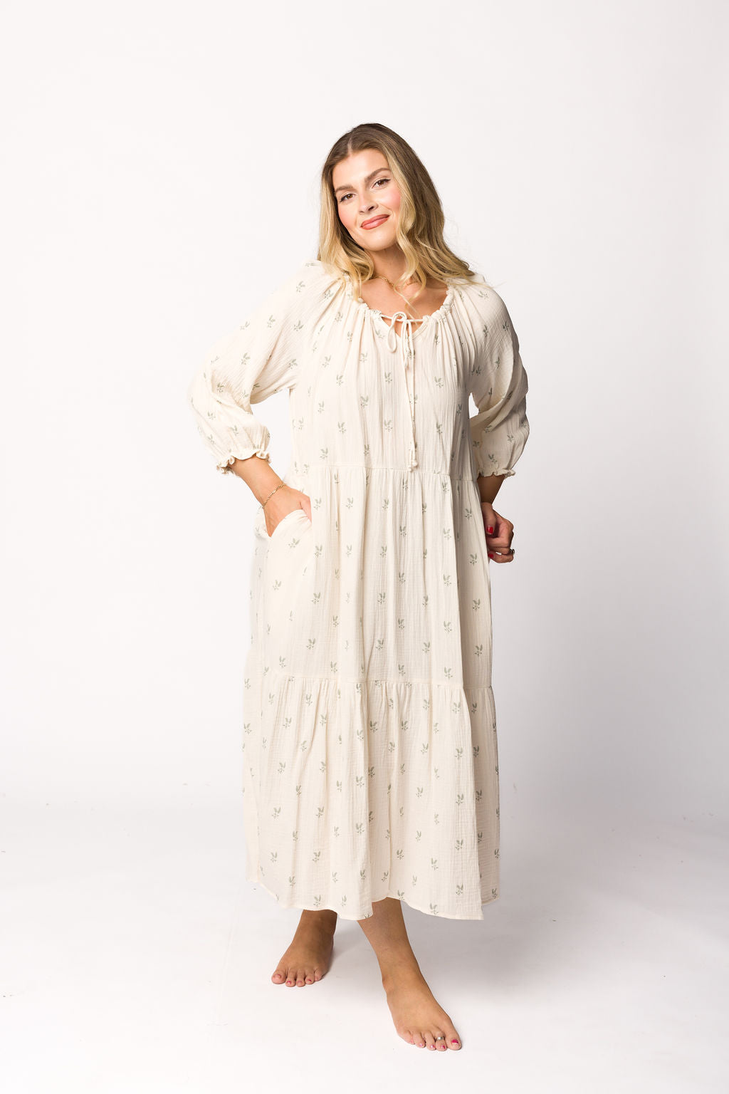 Avery Tiered Linen-Blend Midi Dress in Soy/Sage Foliage - Bump Friendly and Inclusive Sizing *Final-Sale*