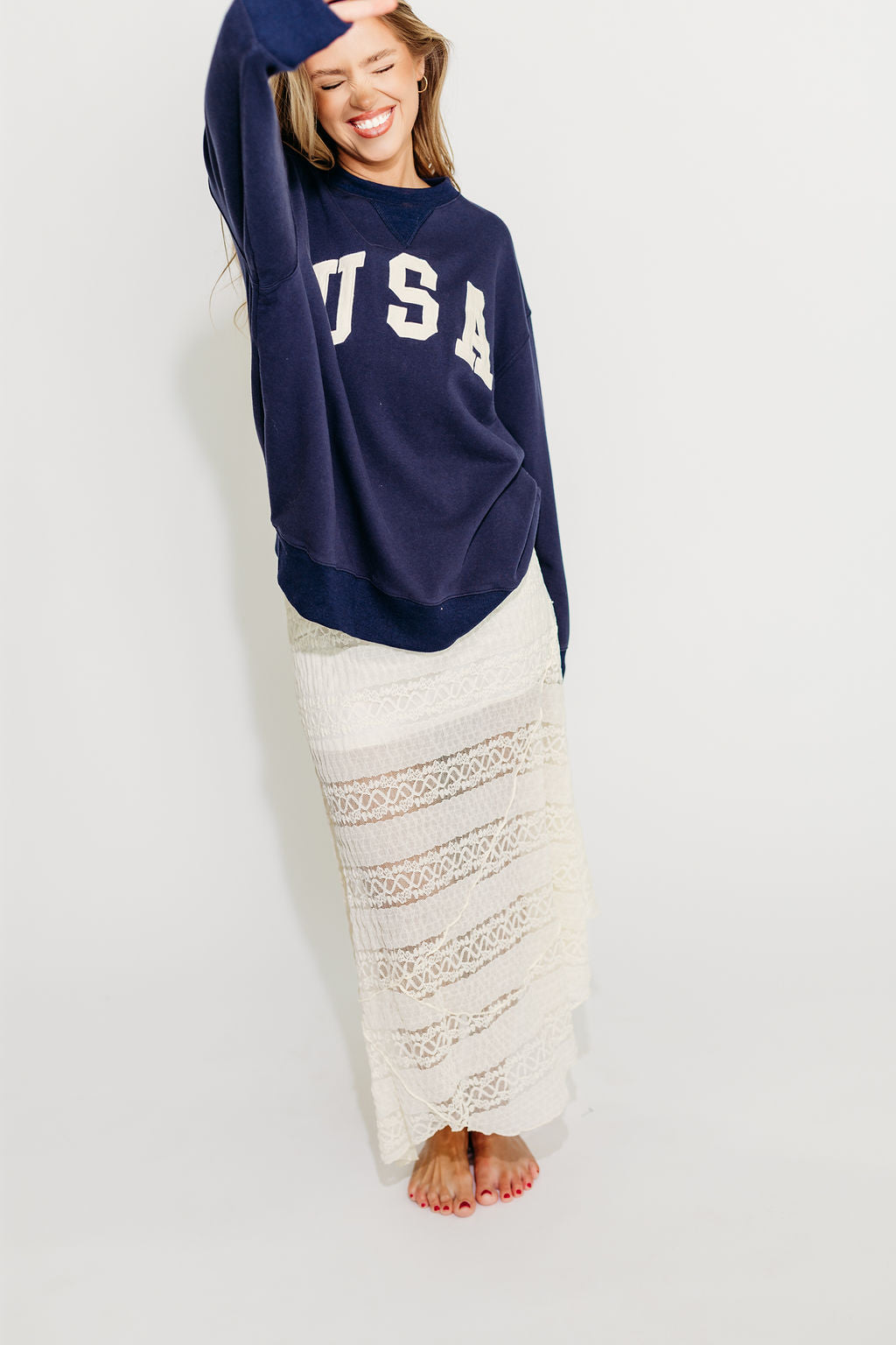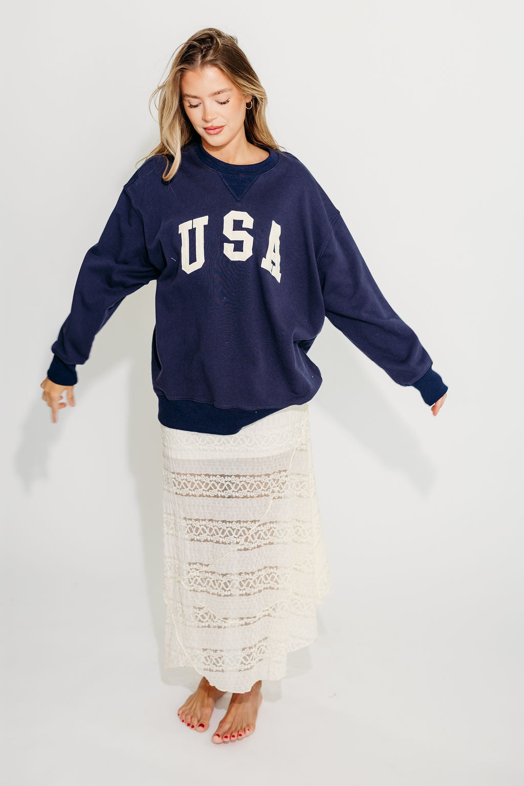 GARMENT DETAILS: Relaxed French terry cotton pullover with embroidered USA graphic, dropped shoulders, and ribbed edges.
