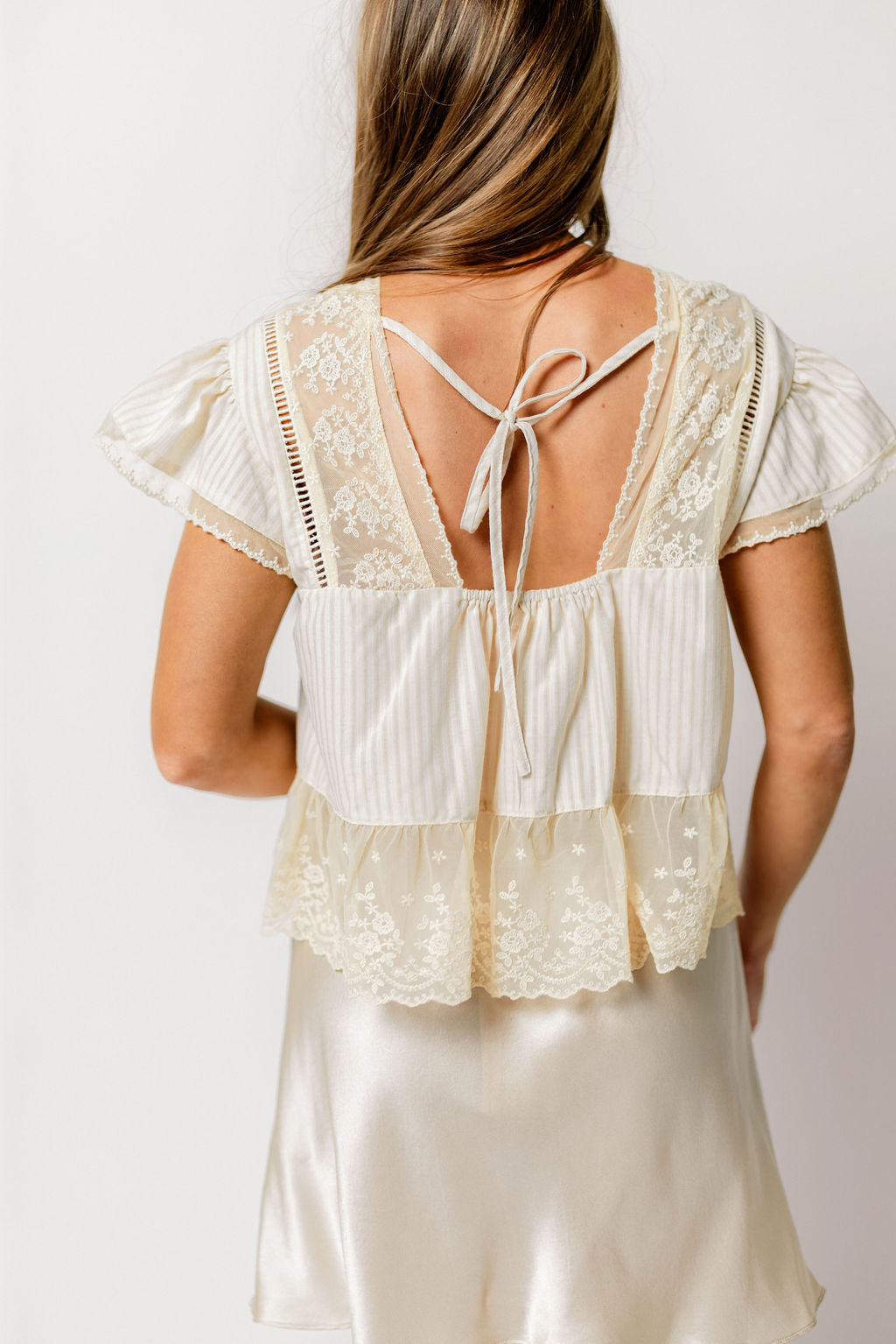 GARMENT DETAILS: Elegant short-sleeved blouse with V-neckline and adjustable front tie, with dainty lace trim and an open back with self-tie accent.