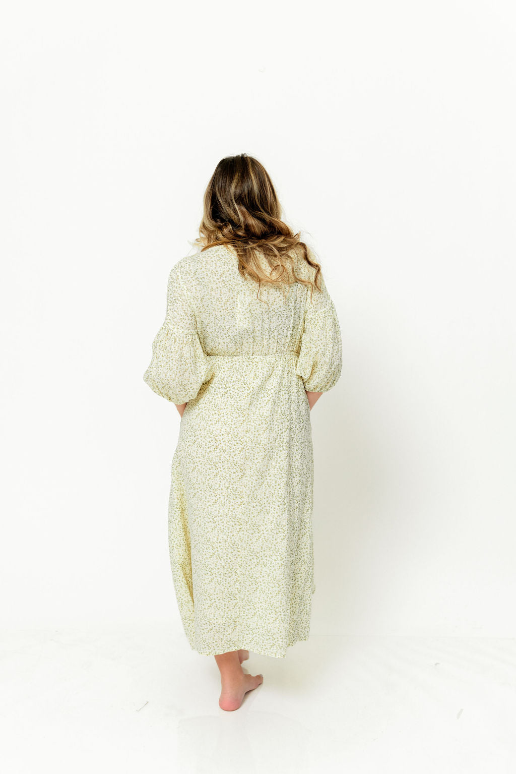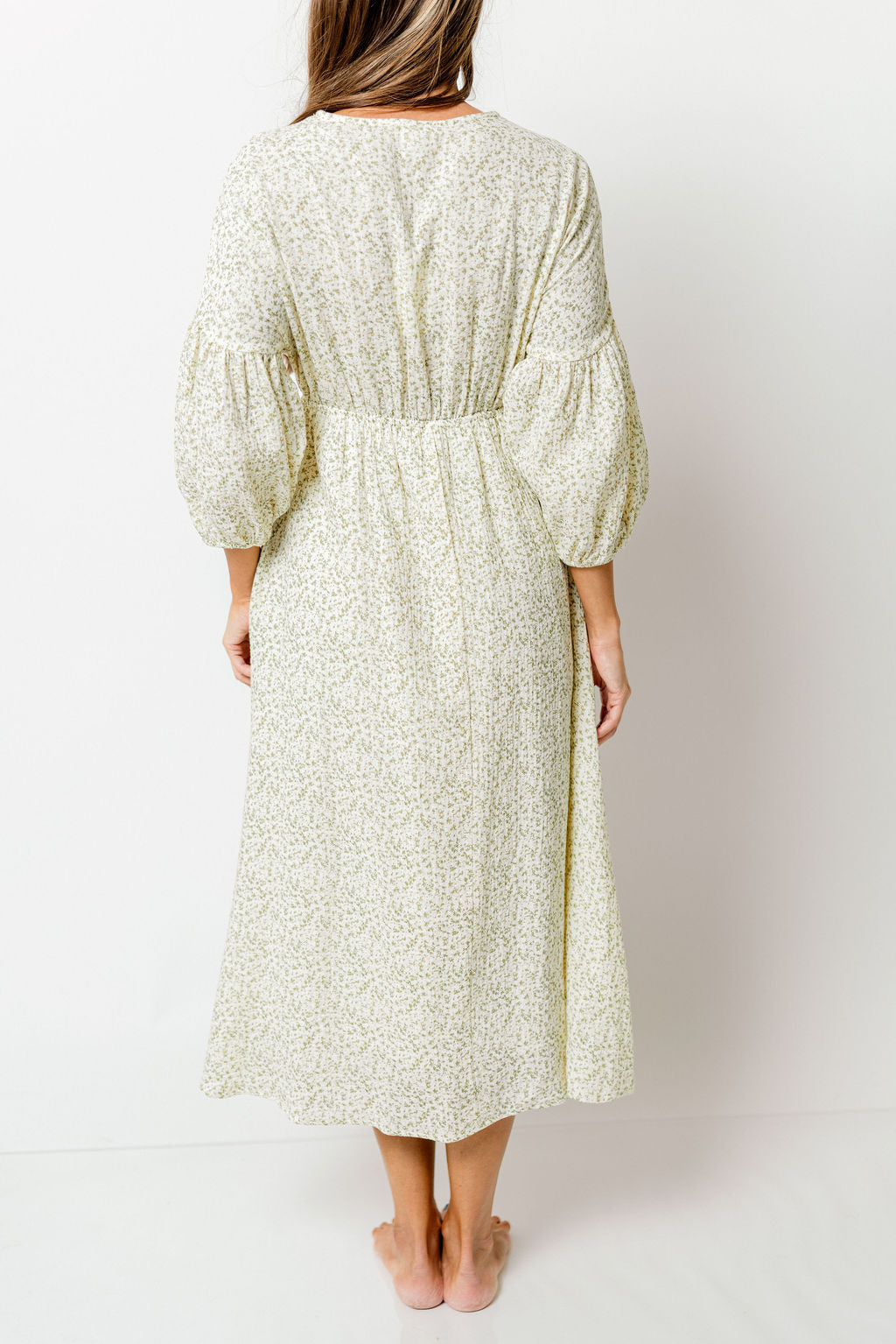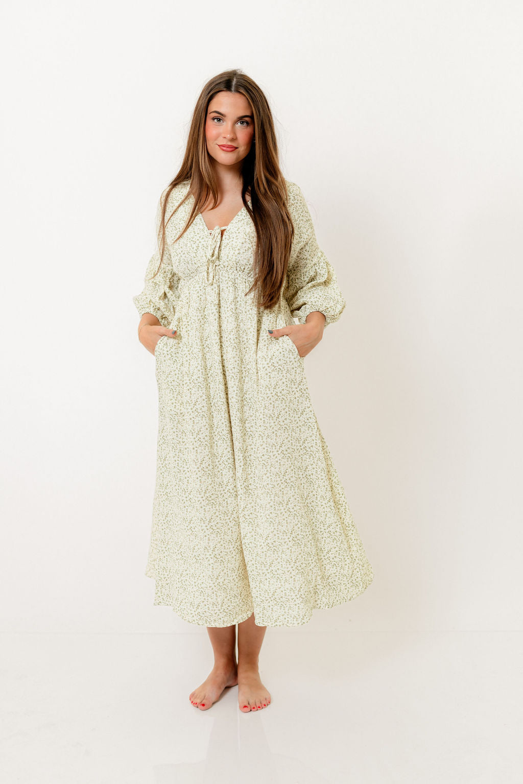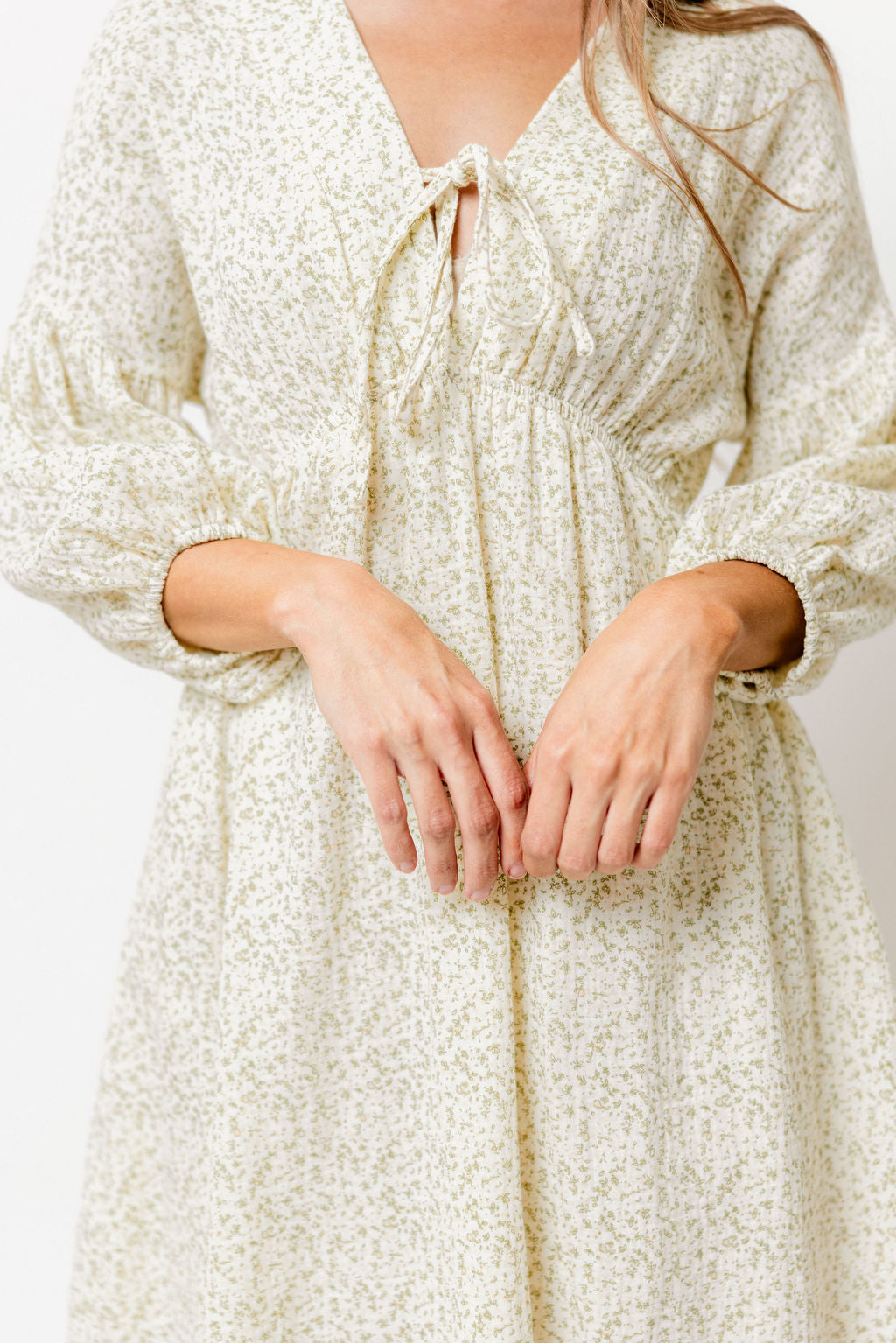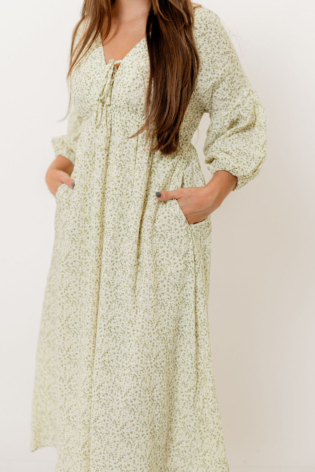 GARMENT DETAILS: Lightweight cotton midi dress. Features V-neckline with self-tie detail, inverted empire waist, and full skirt with in-seam pockets. Finished with long balloon sleeves.