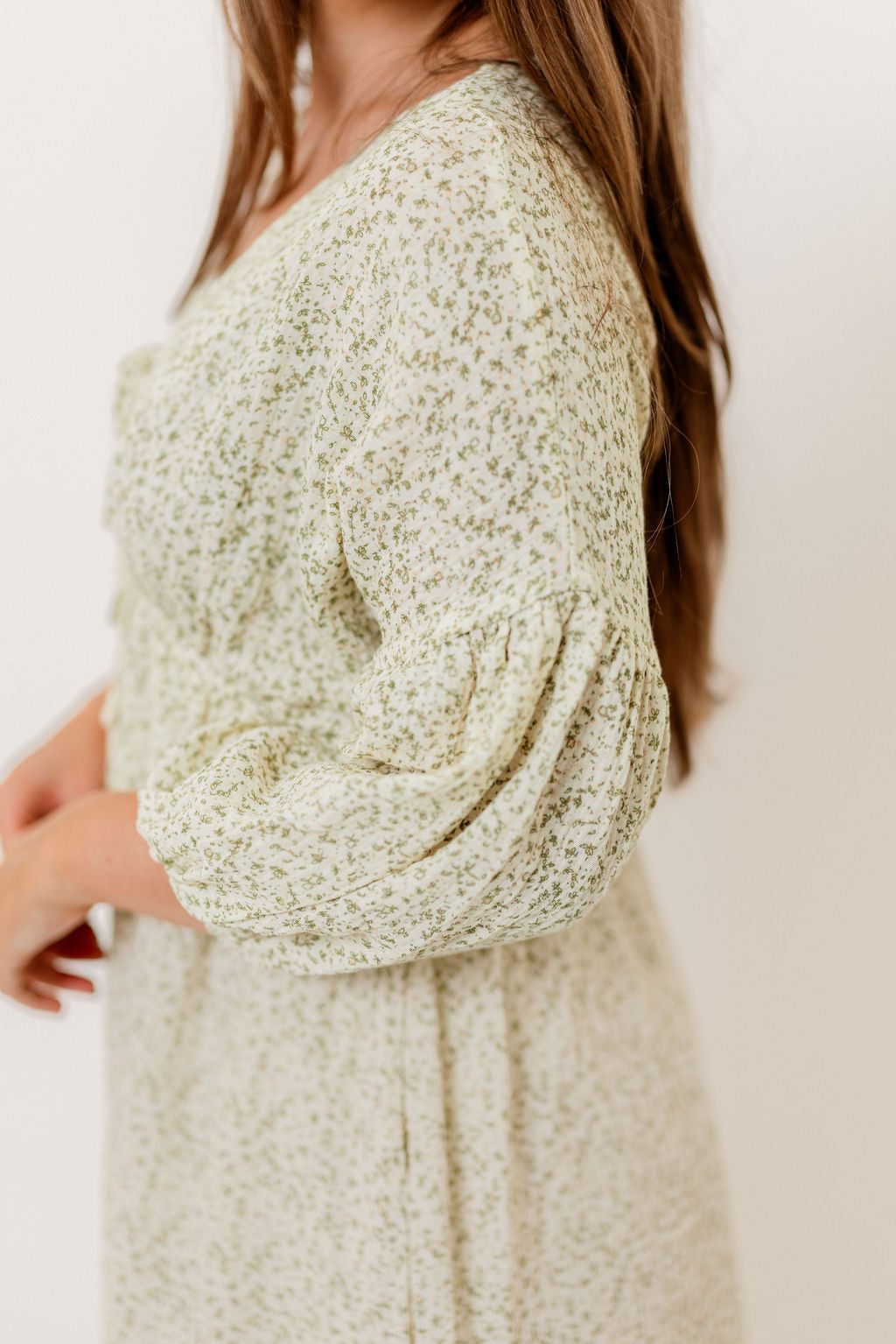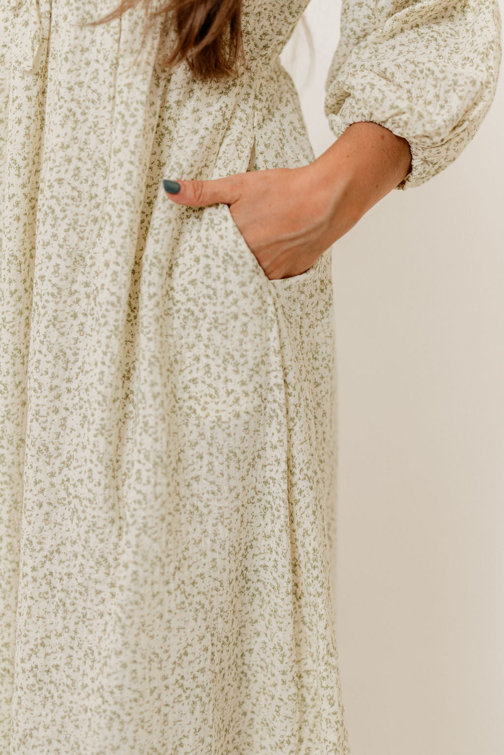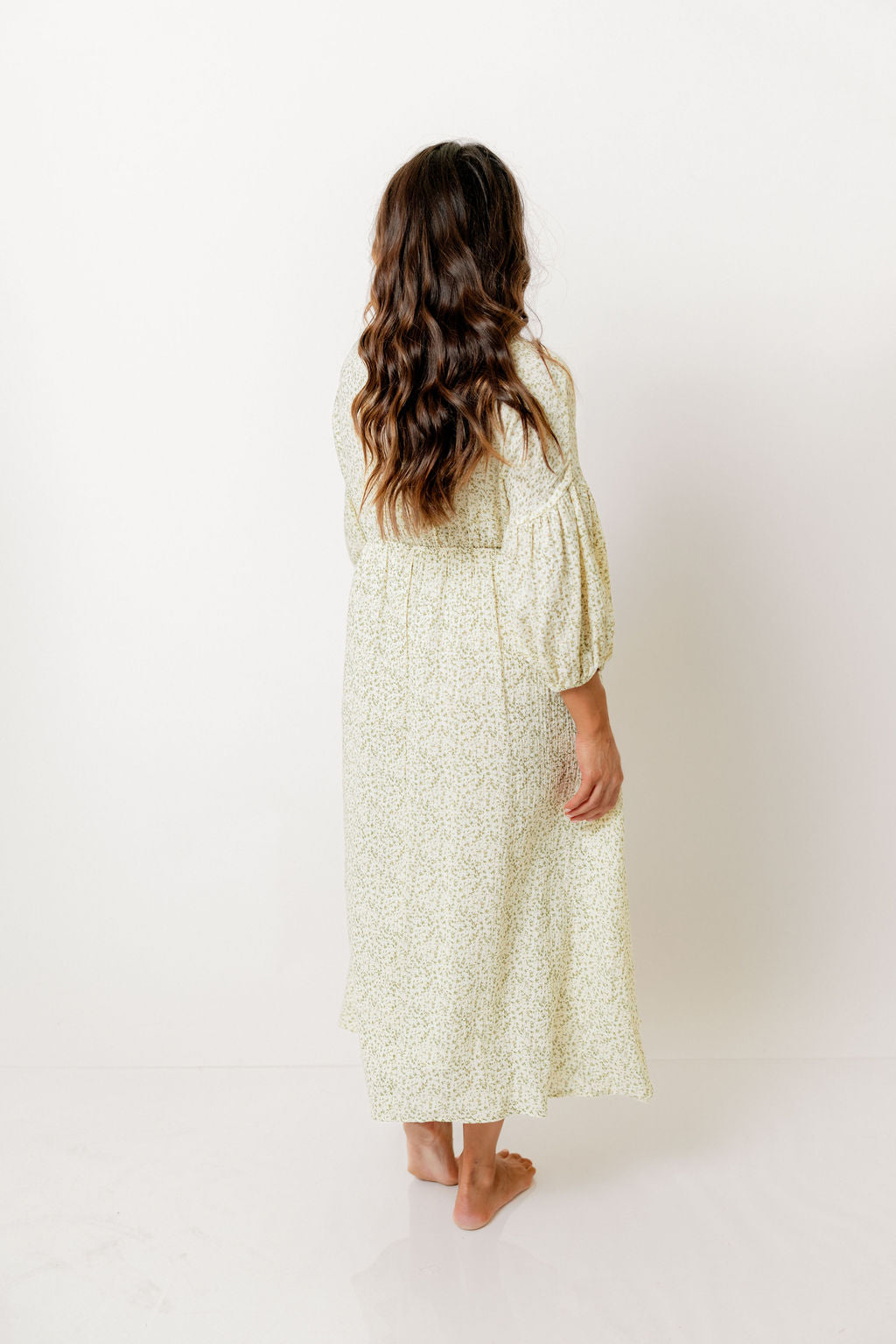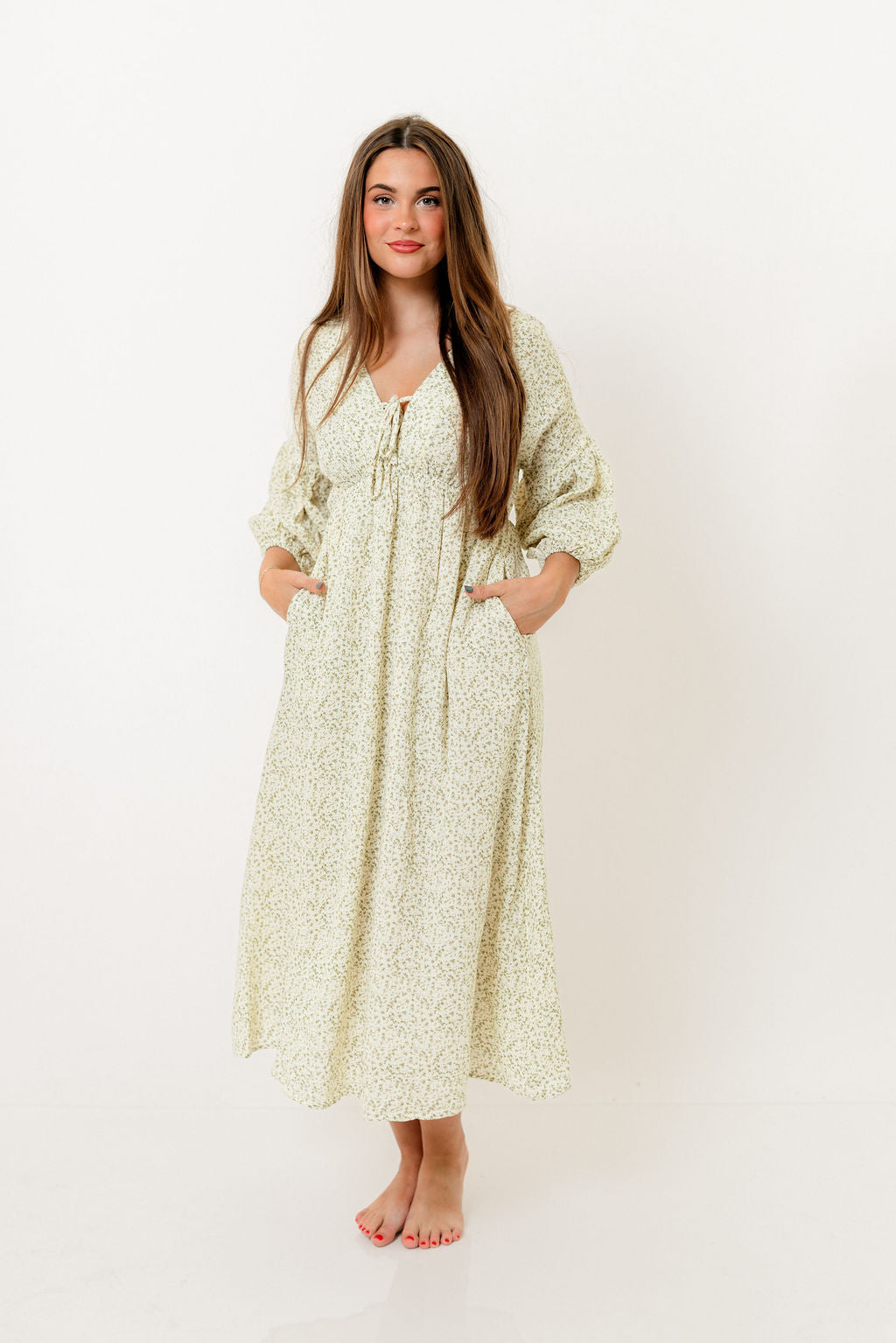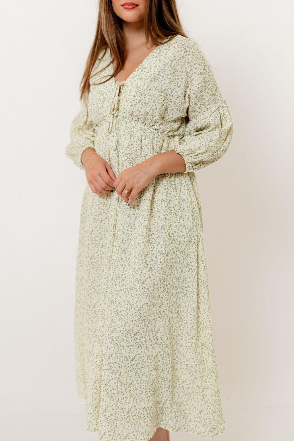 GARMENT DETAILS: Lightweight cotton midi dress. Features V-neckline with self-tie detail, inverted empire waist, and full skirt with in-seam pockets. Finished with long balloon sleeves.
