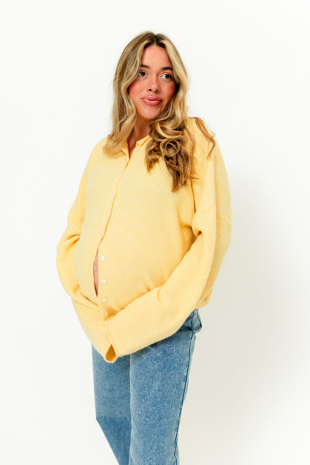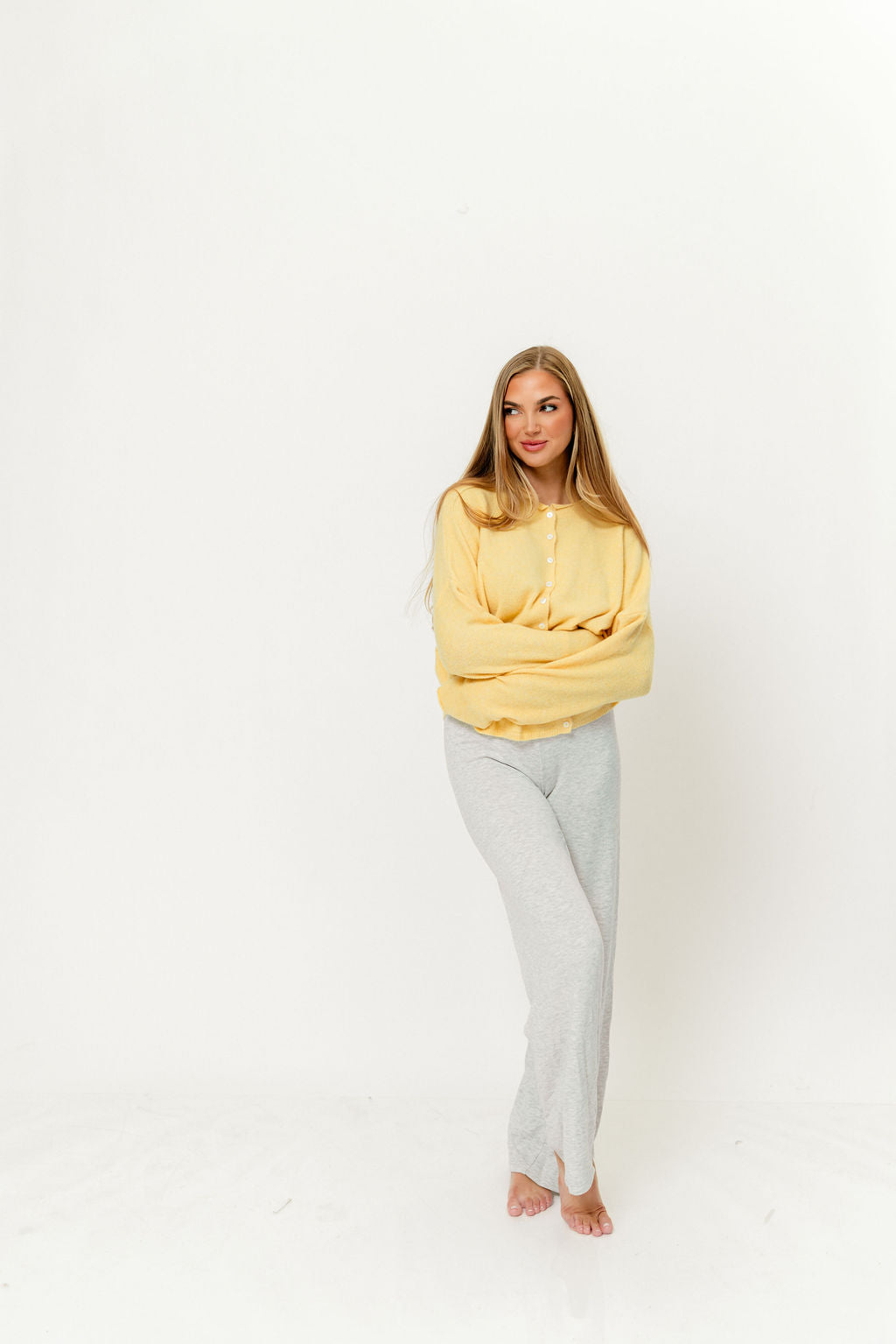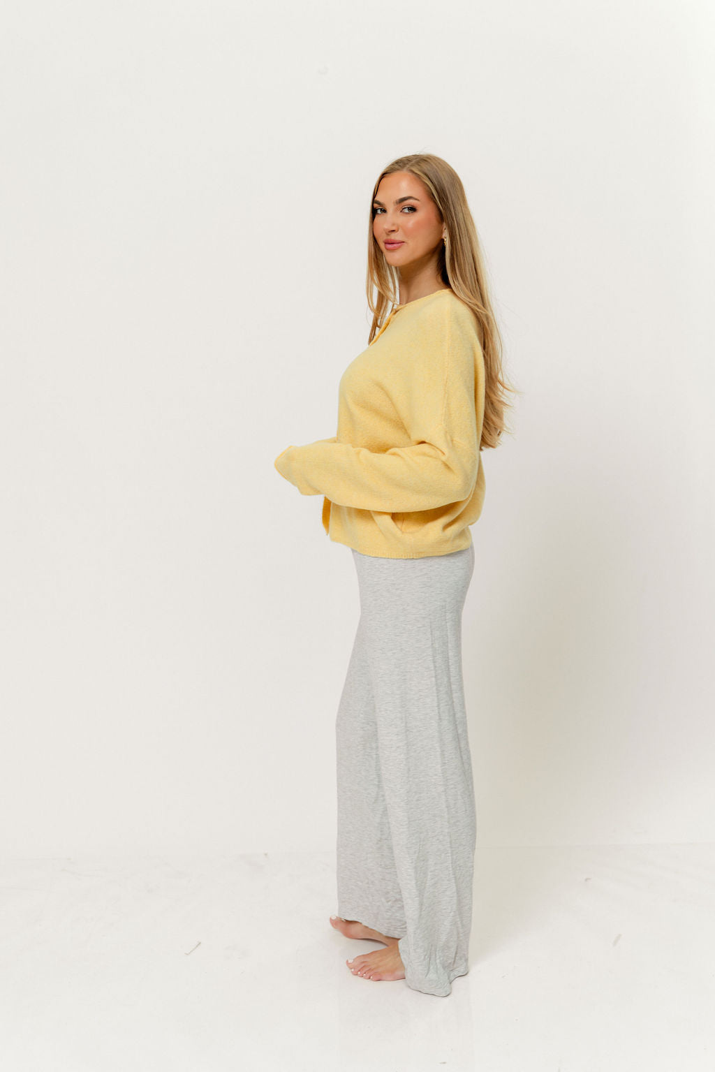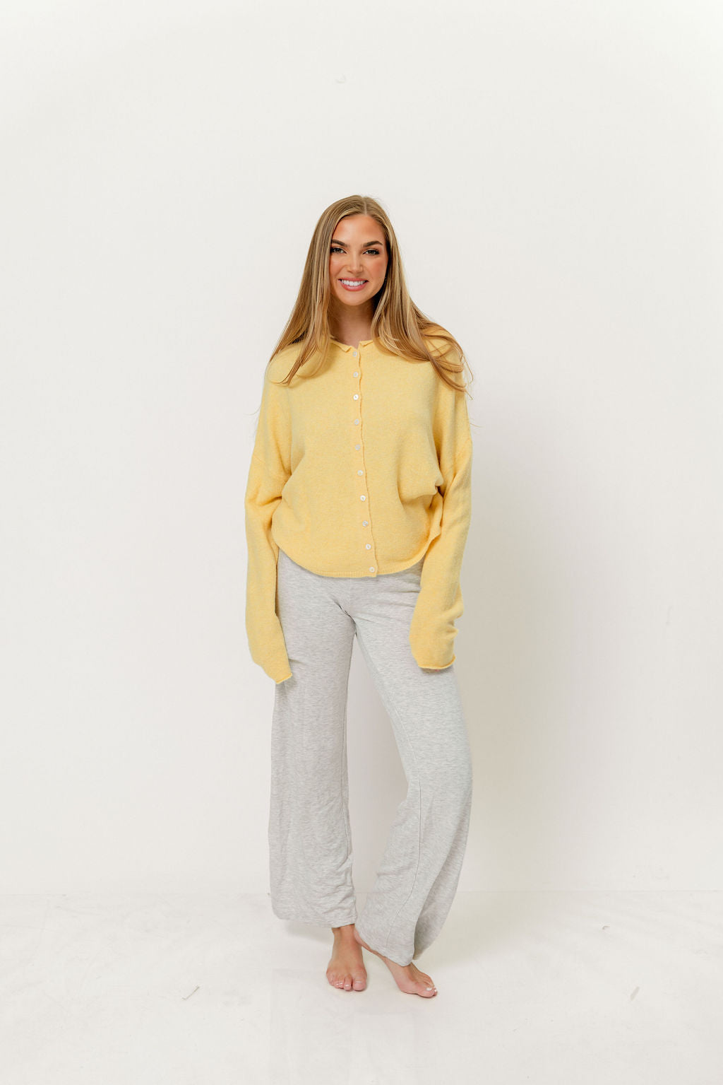 GARMENT DETAILS: Soft and feminine cardigan with long sleeves and rolled hem. Features dainty button front closure.