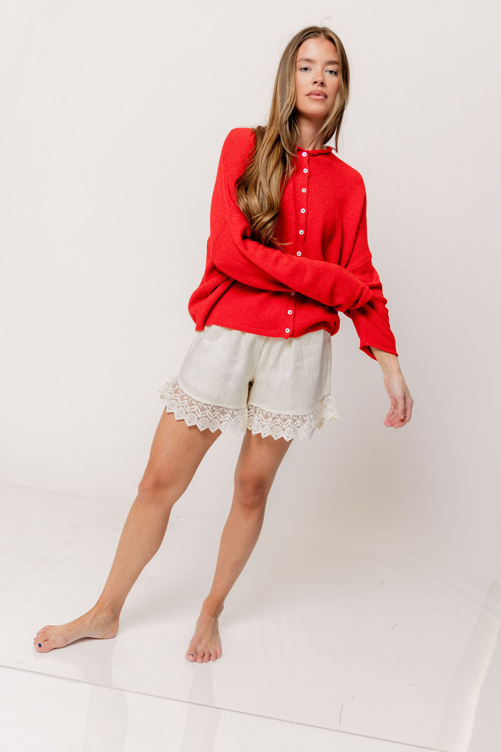 GARMENT DETAILS: Soft and feminine cardigan with long sleeves and rolled hem. Features dainty button front closure.