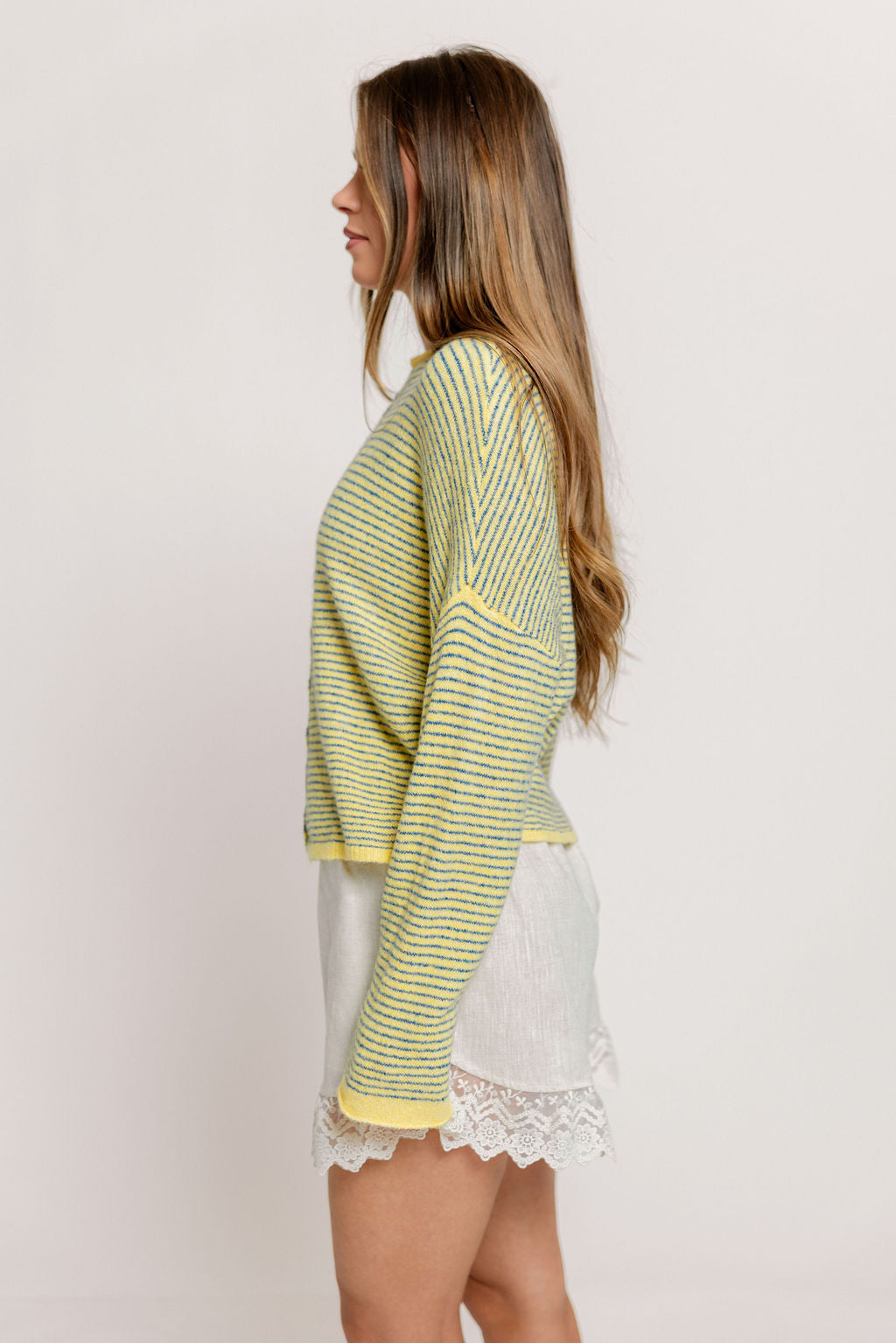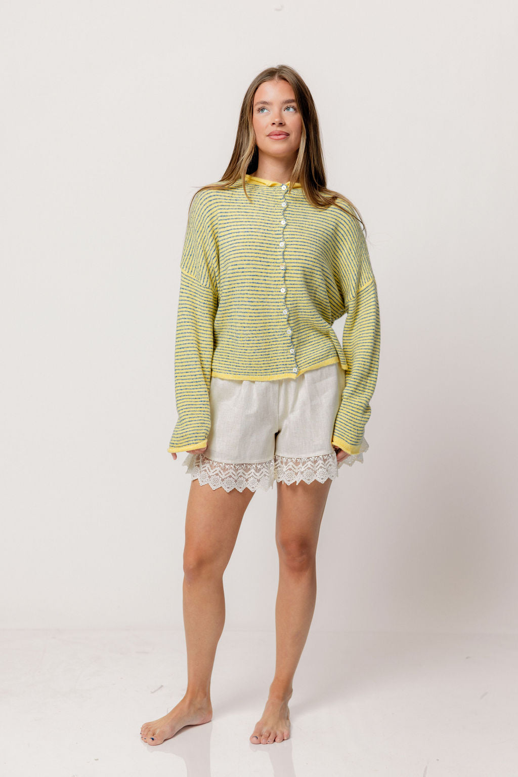 Whether you're wearing this adorable striped cardigan solo, layering over a tank or camisole, or styling it tied over your shoulders, the Piper will wear beautifully season after season. We love the dainty pinstripe and rolled edge detail that gives this cardigan a sweet and casual vibe.