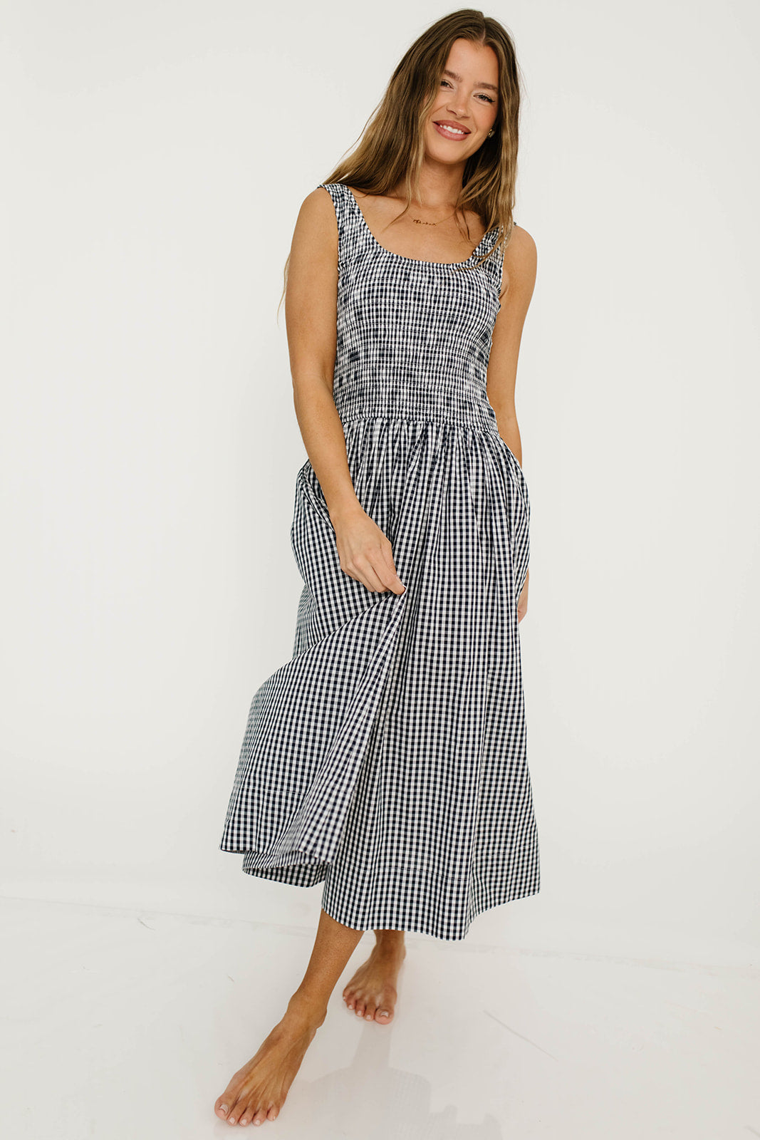 Janice 100% Cotton Gingham Smocked Midi Dress in Navy
