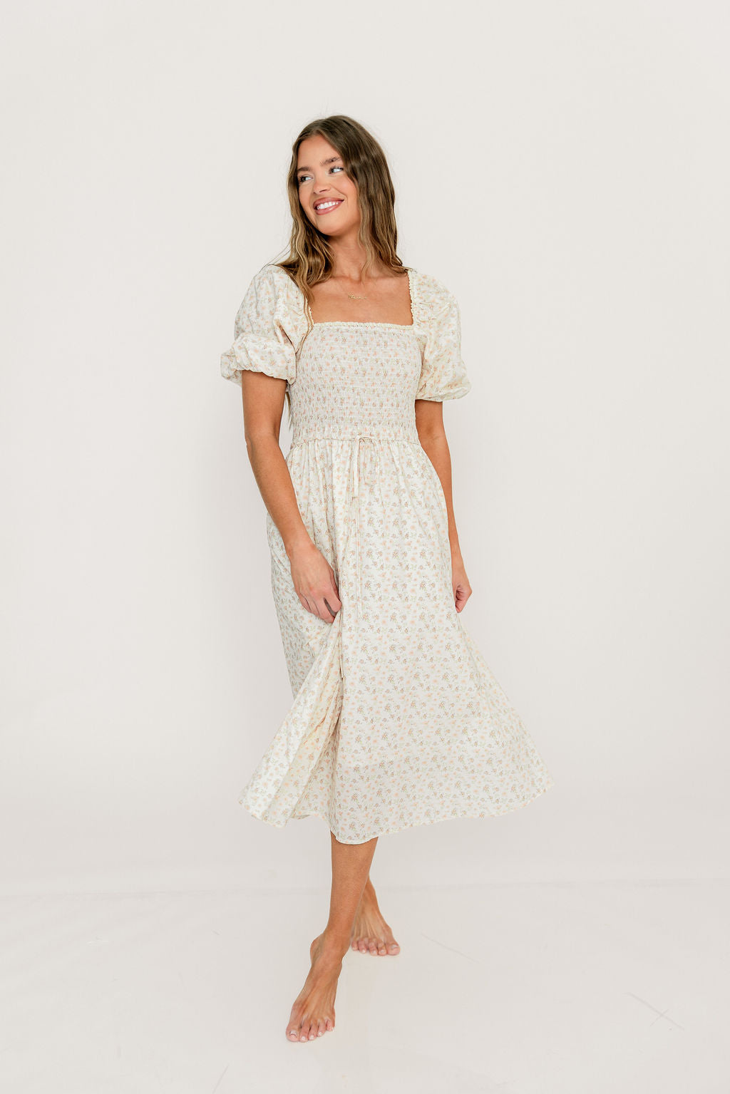 Solena Floral Smocked Midi Dress in Ivory/Blue