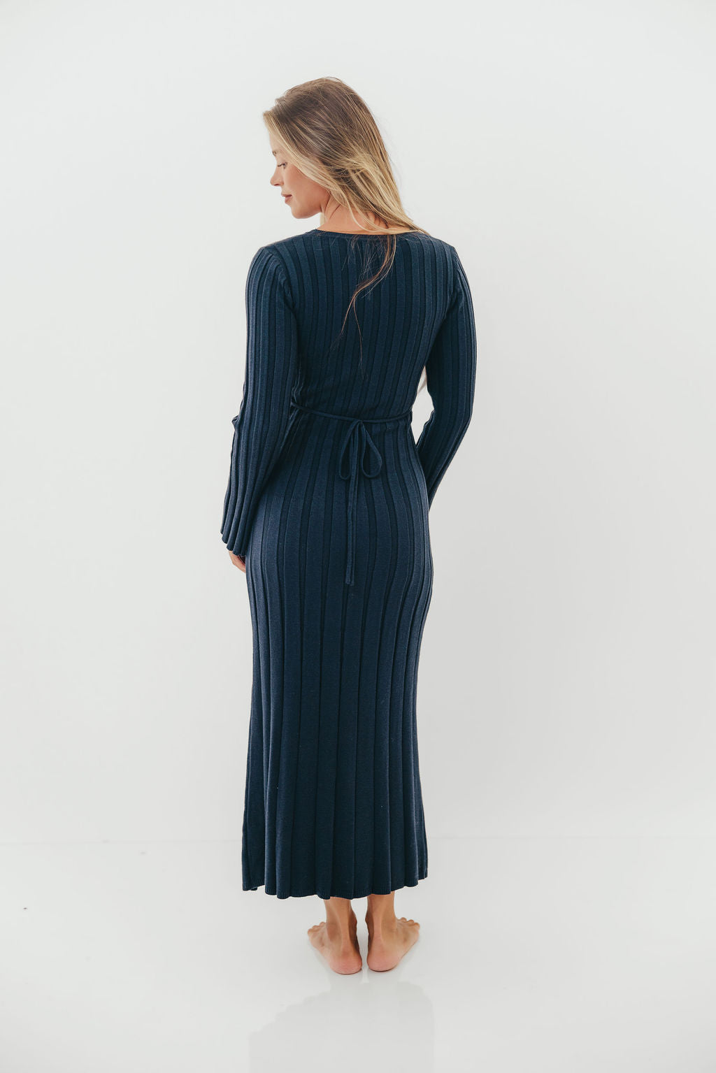 GARMENT DETAILS: Designer quality thick ribbed knit maxi dress, with high rounded neckline and long sleeves. Features a full skirt and comfortable, fitted silhouette. Features an adjustable tie-back detail.