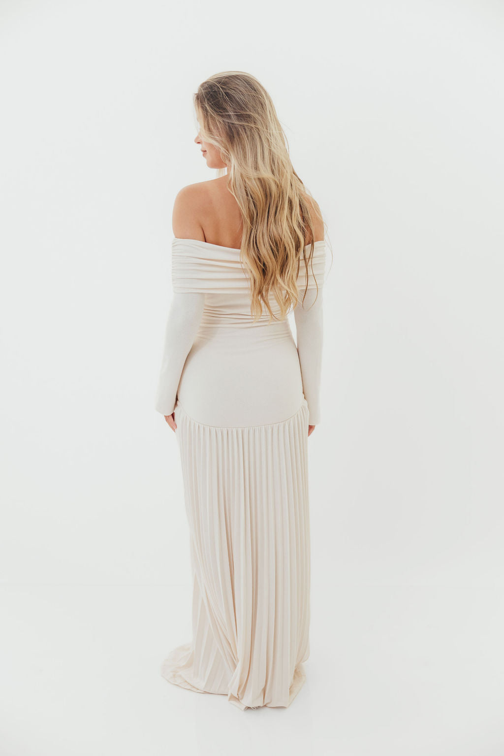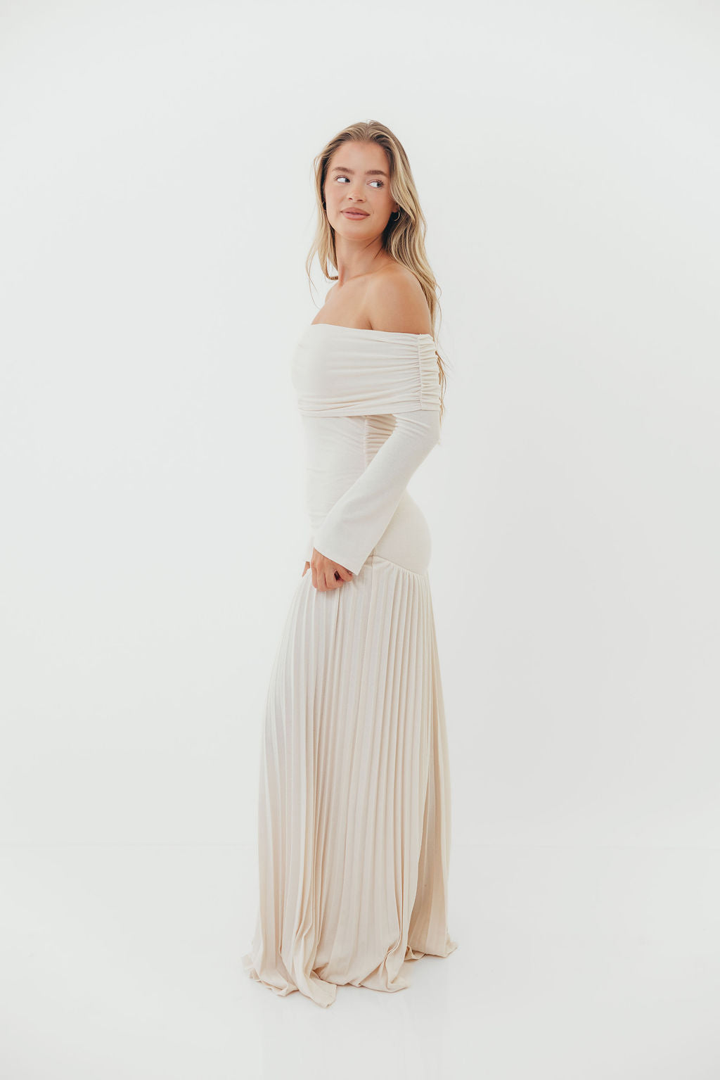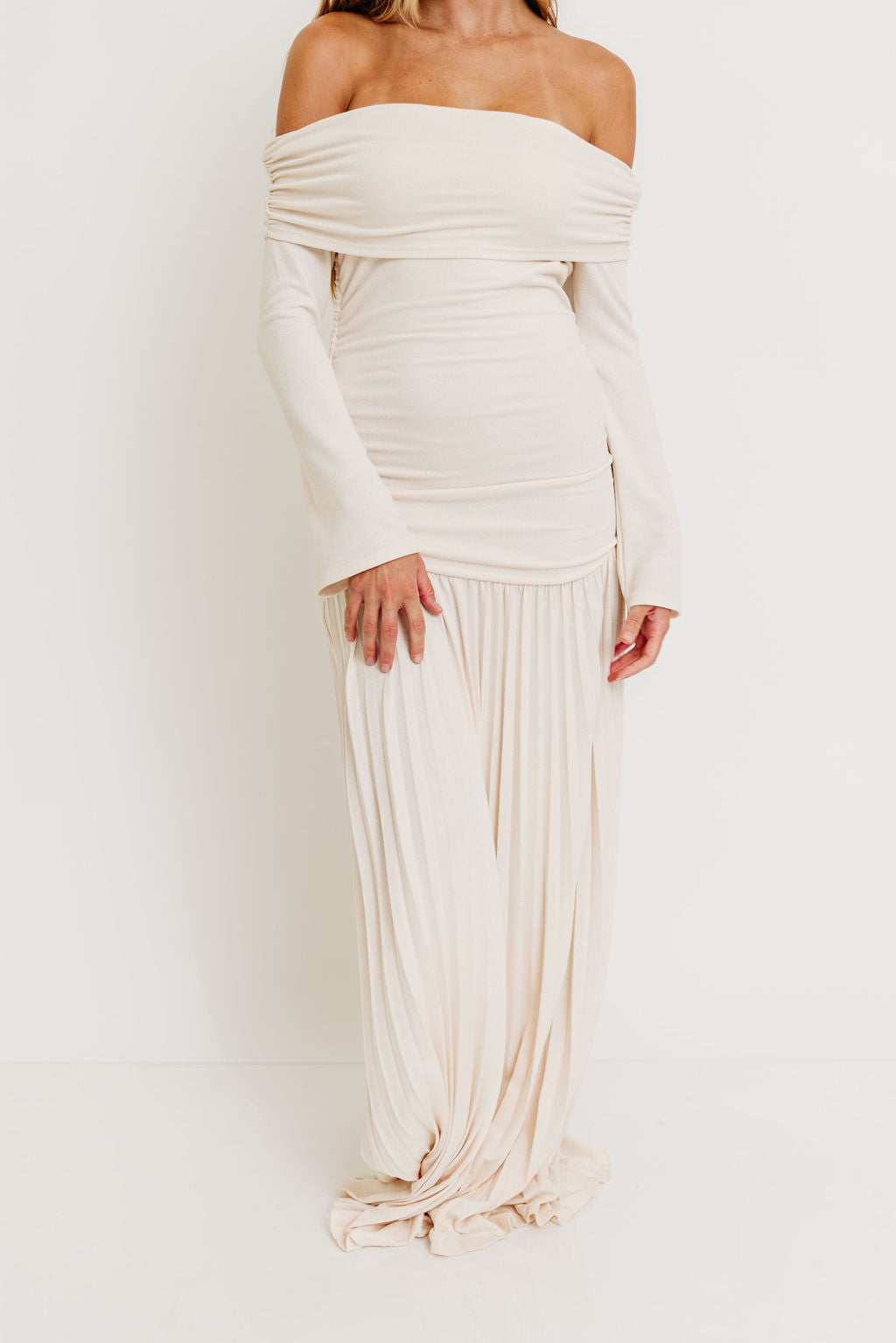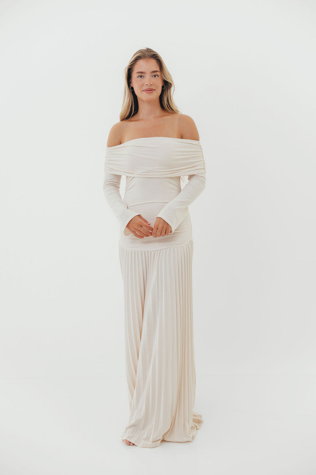 GARMENT DETAILS: Elegant maxi dress with a folded off-the-shoulder neckline, long sleeves, and full pleated maxi skirt. Finished with a dropped waist and full lining.