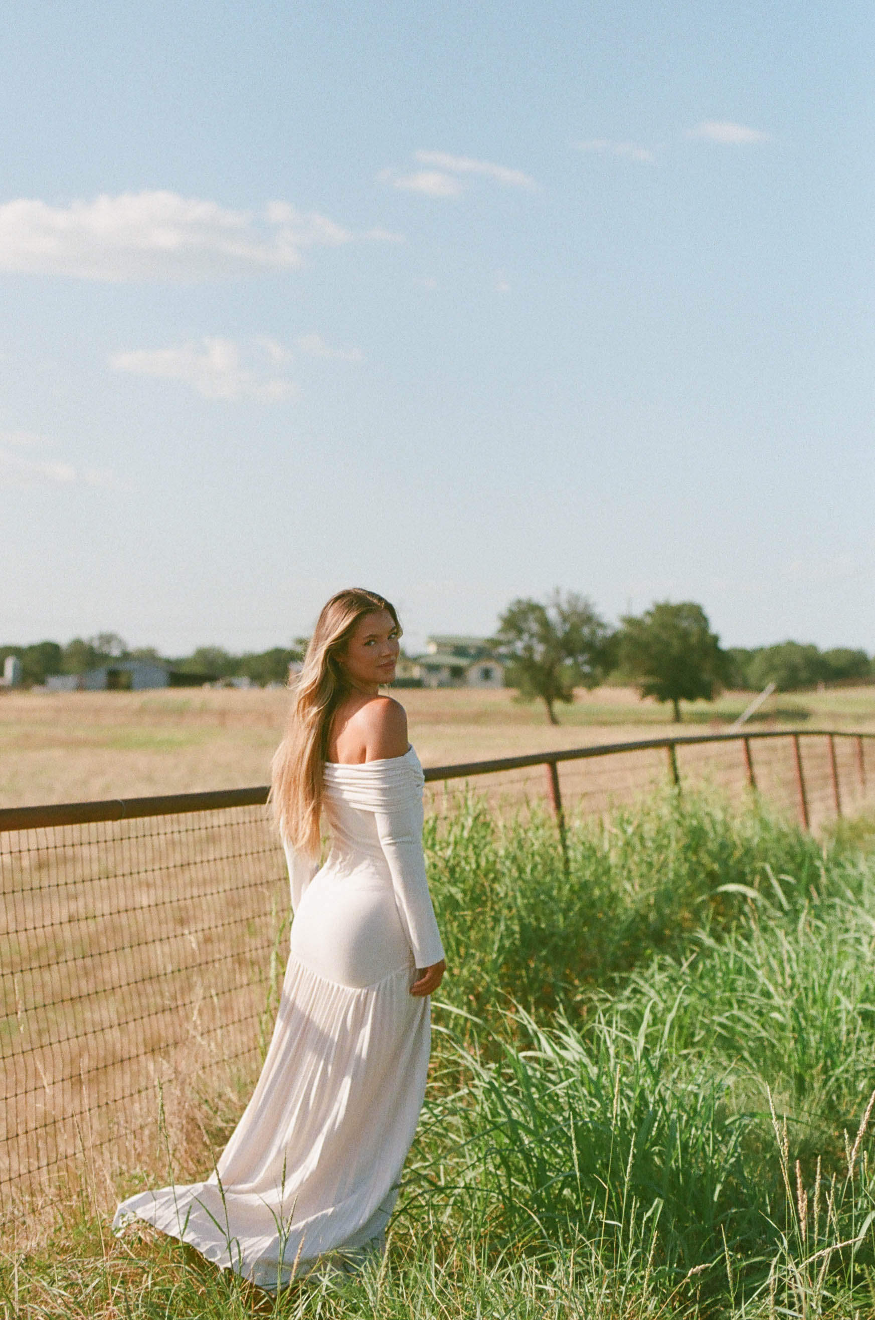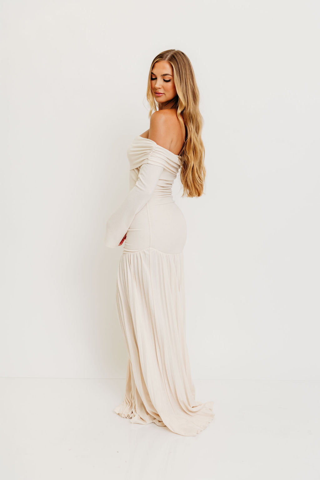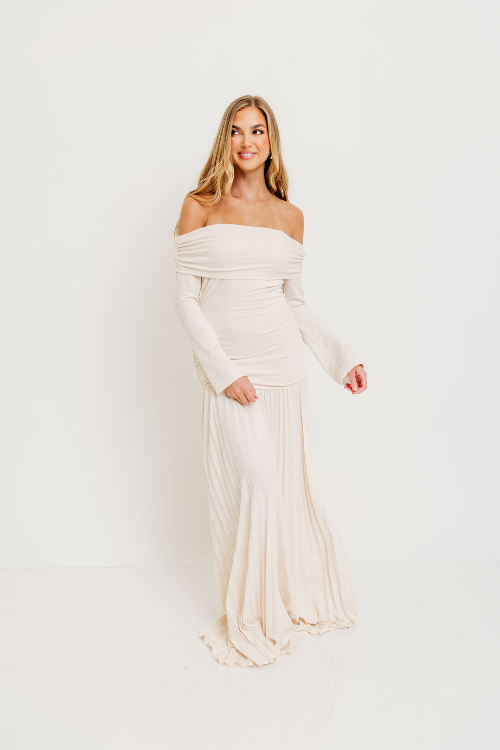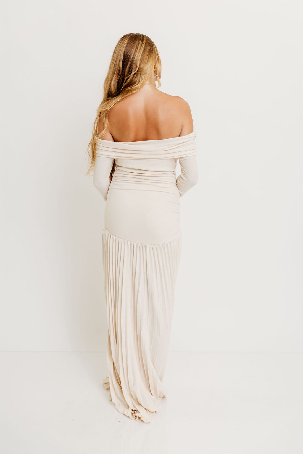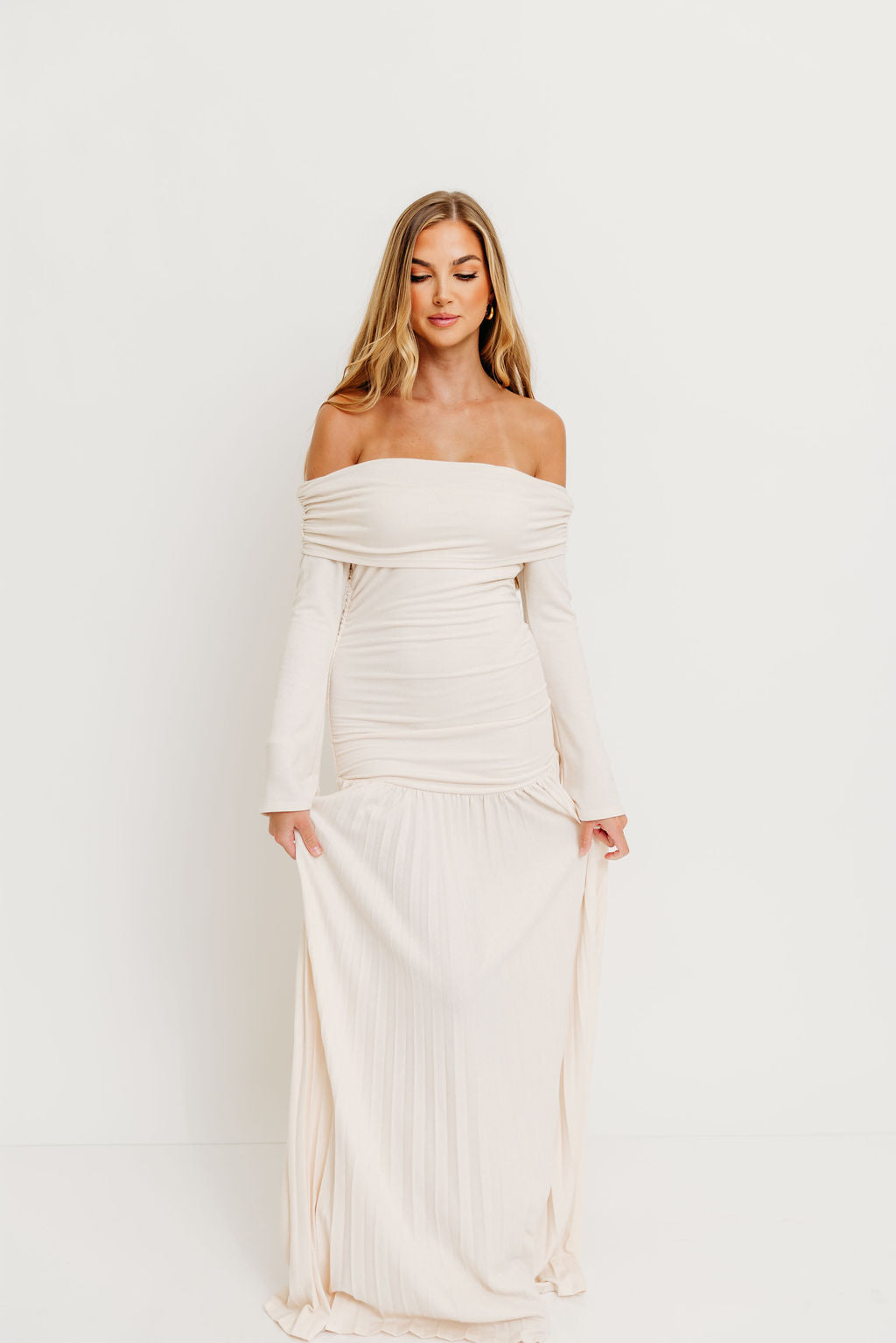 GARMENT DETAILS: Elegant maxi dress with a folded off-the-shoulder neckline, long sleeves, and full pleated maxi skirt. Finished with a dropped waist and full lining.