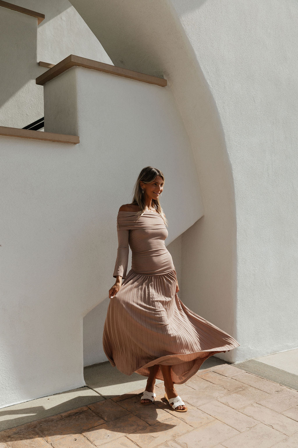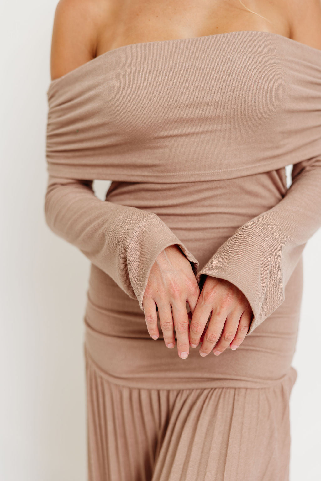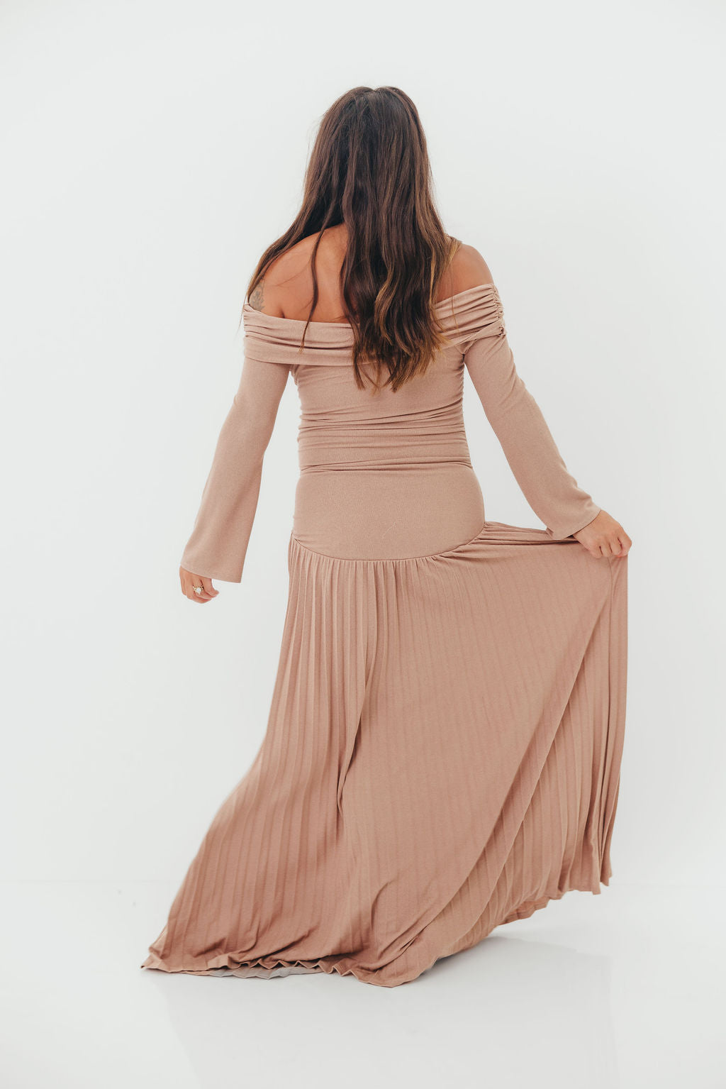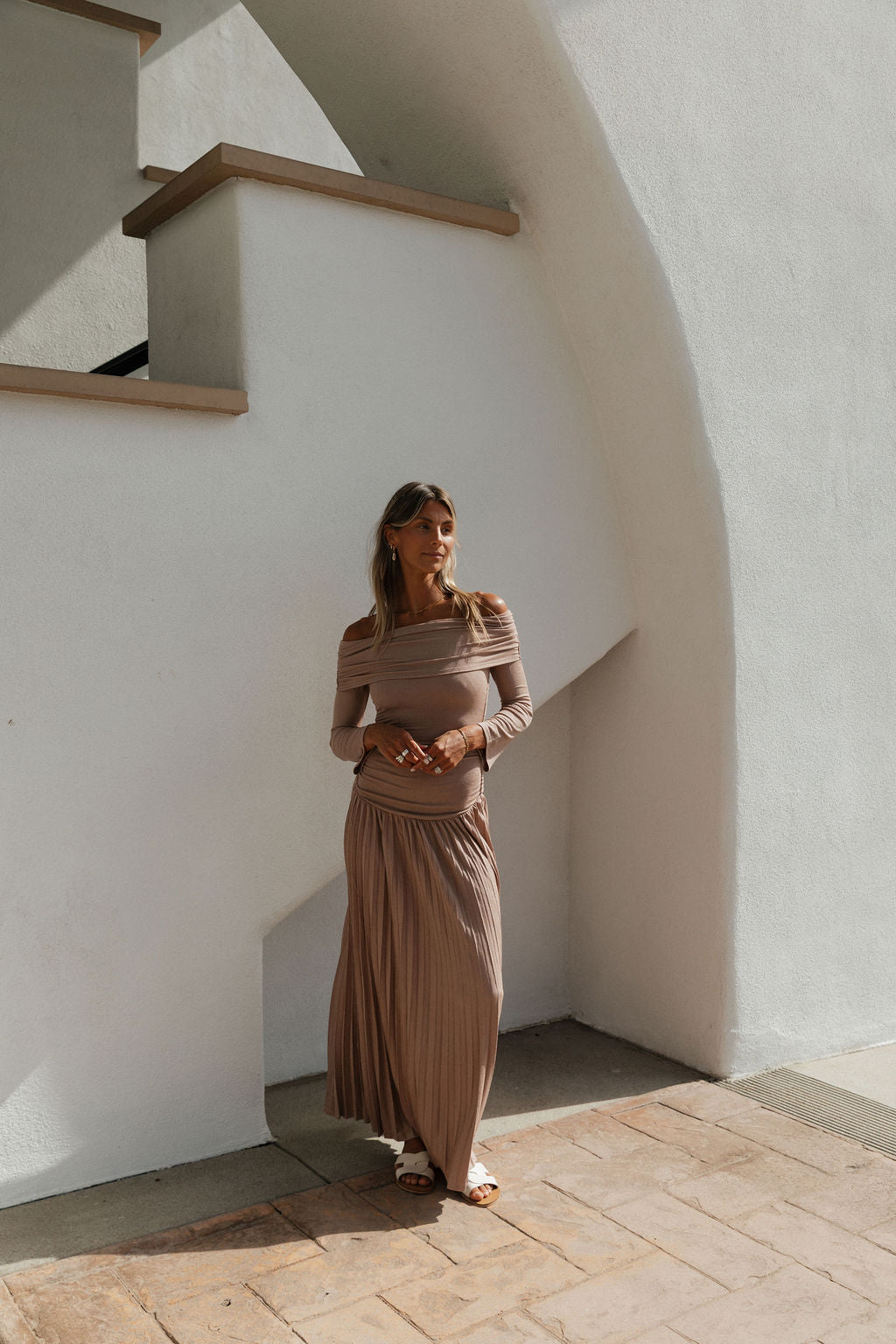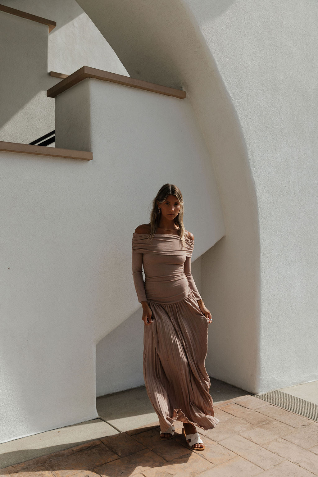 GARMENT DETAILS: Elegant maxi dress with a folded off-the-shoulder neckline, long sleeves, and full pleated maxi skirt. Finished with a dropped waist and full lining.