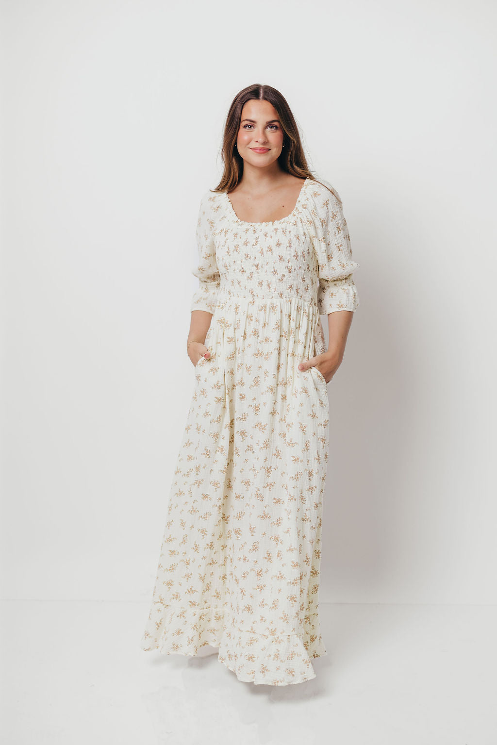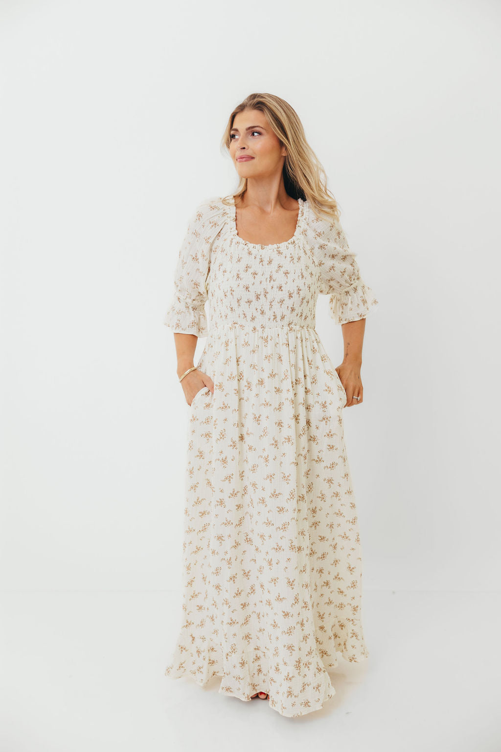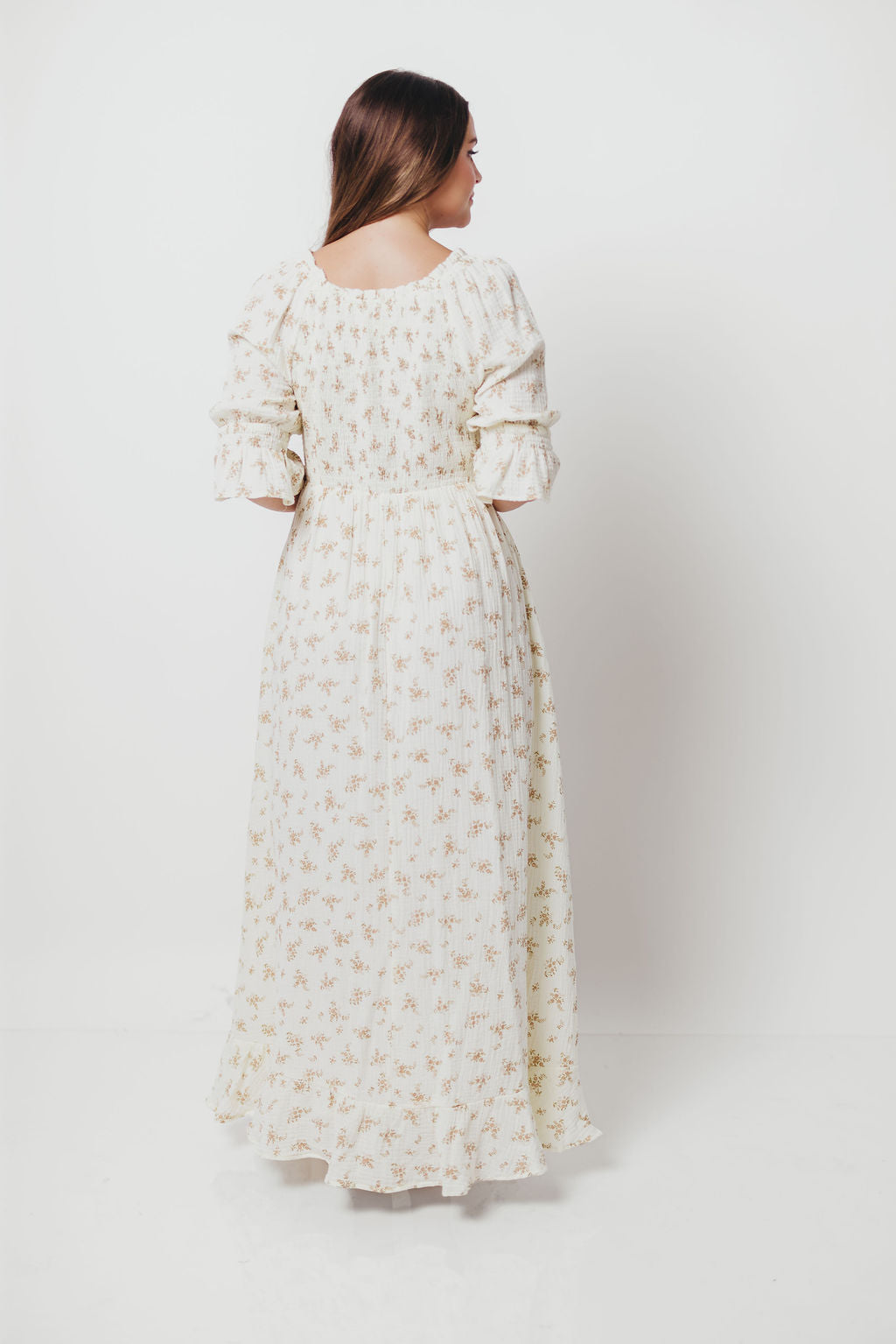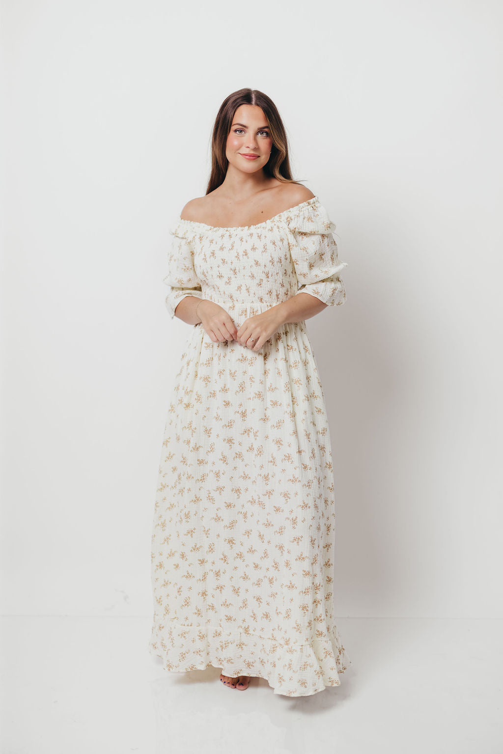 GARMENT DETAILS: Elegant, lightweight maxi dress in a darling floral print, with stretchy neckline that can be worn on or off the shoulder. Features 3/4 length puffed sleeves with ruffle, and a stretchy, smocked bodice. This colorway features a full lining.