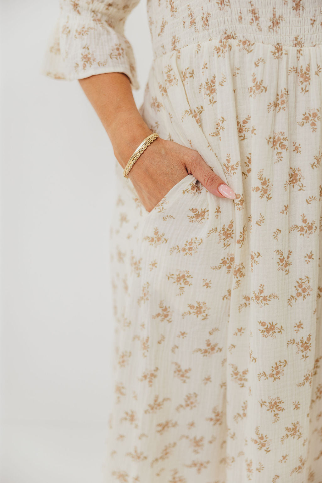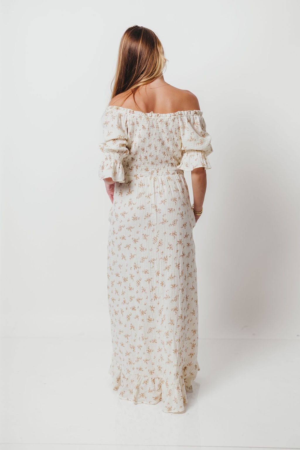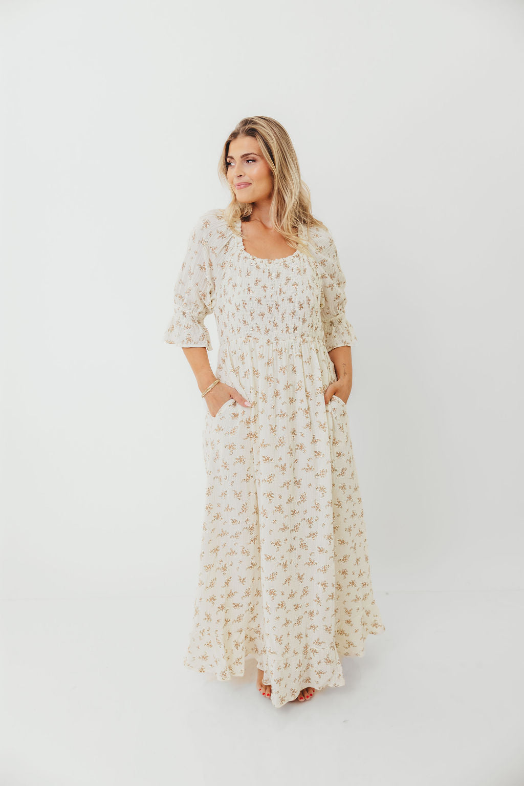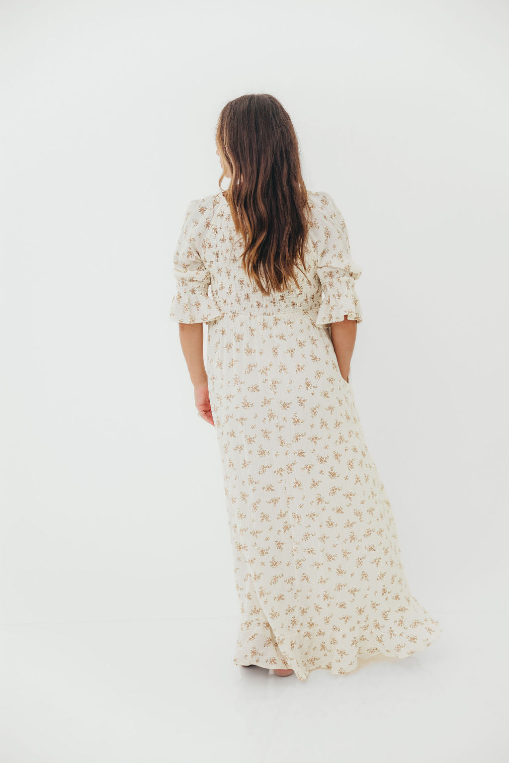 GARMENT DETAILS: Elegant, lightweight maxi dress in a darling floral print, with stretchy neckline that can be worn on or off the shoulder. Features 3/4 length puffed sleeves with ruffle, and a stretchy, smocked bodice. This colorway features a full lining.