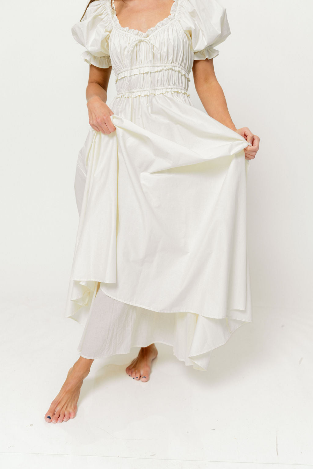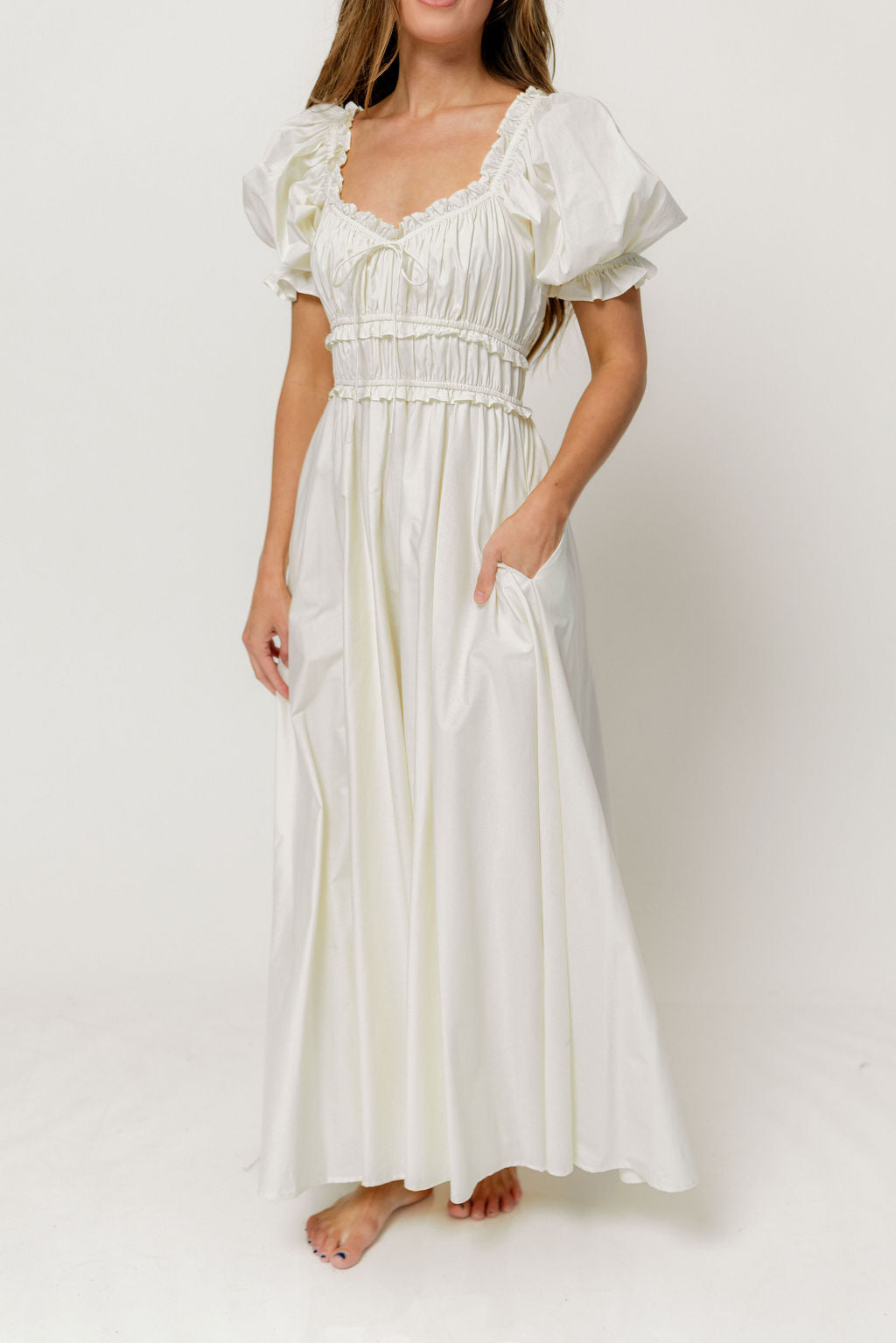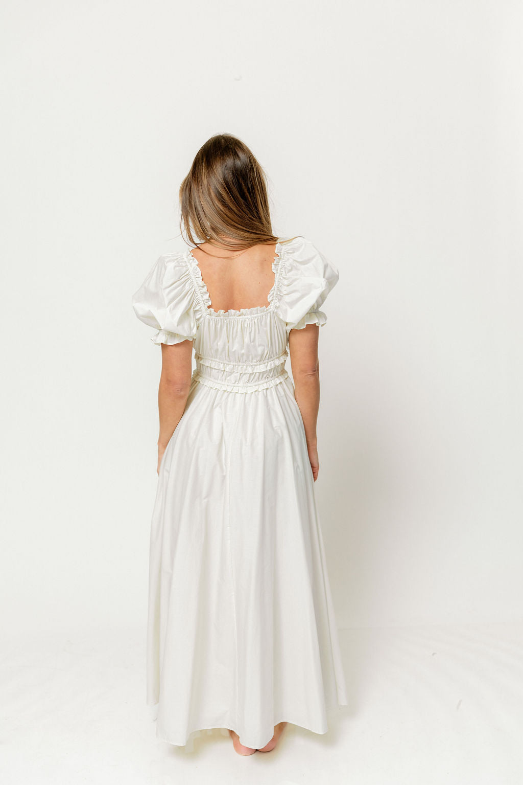 GARMENT DETAILS: Elegant maxi dress in 100% cotton, with short puffed sleeves, tiered and gathered bodice with adjustable tie detail, and ruffle accents throughout. Finished with a full lining. Elasticated neckline can be worn on or off the shoulders.
