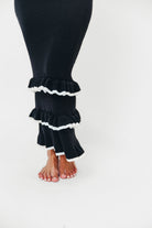 GARMENT DETAILS: Lightweight knit maxi dress with a bodycon-style silhouette, square neckline, and adjustable spaghetti straps. Features a multi-tiered ruffle hem with contrast color trim.