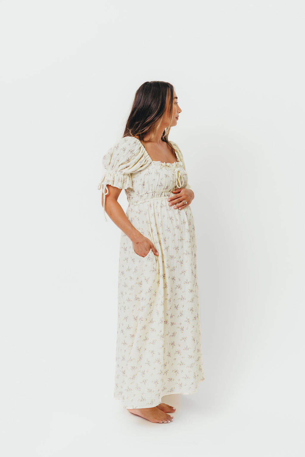 GARMENT DETAILS: Ultra-soft and lightweight 100% cotton maxi dress. Features a square neckline with dainty puffed sleeves, smocked waistband, and tie accents throughout. Finished with side pockets and lining.