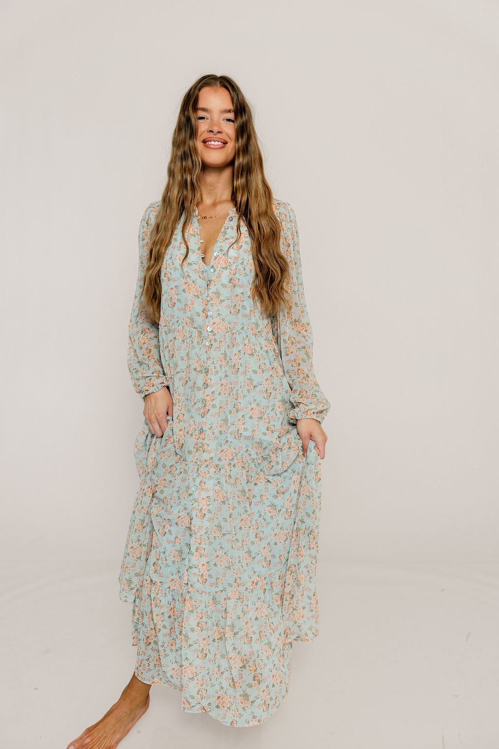 GARMENT DETAILS: Elegant cotton-blend maxi dress with full front button placket, long sleeves with elasticated cuffs, and gently tiered skirt. Lined.