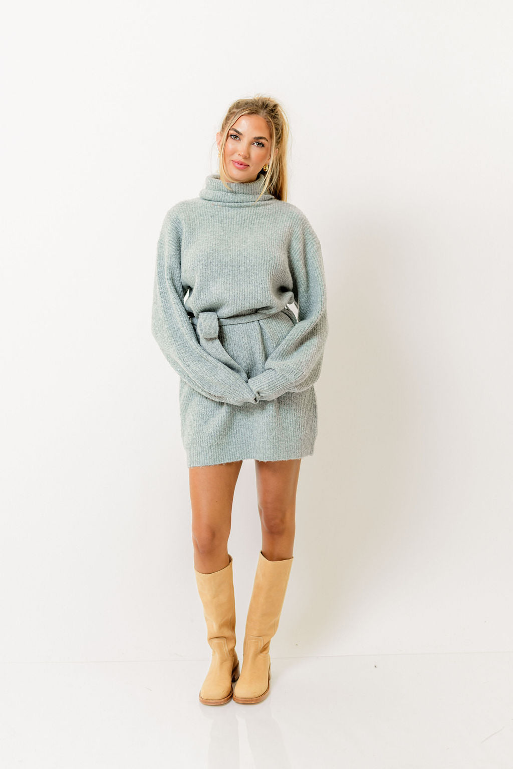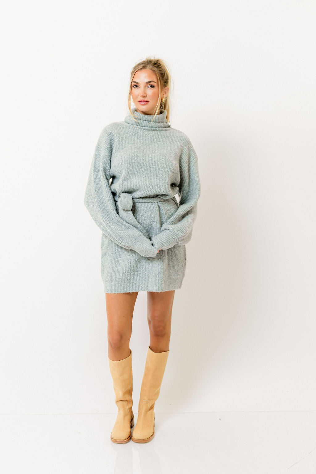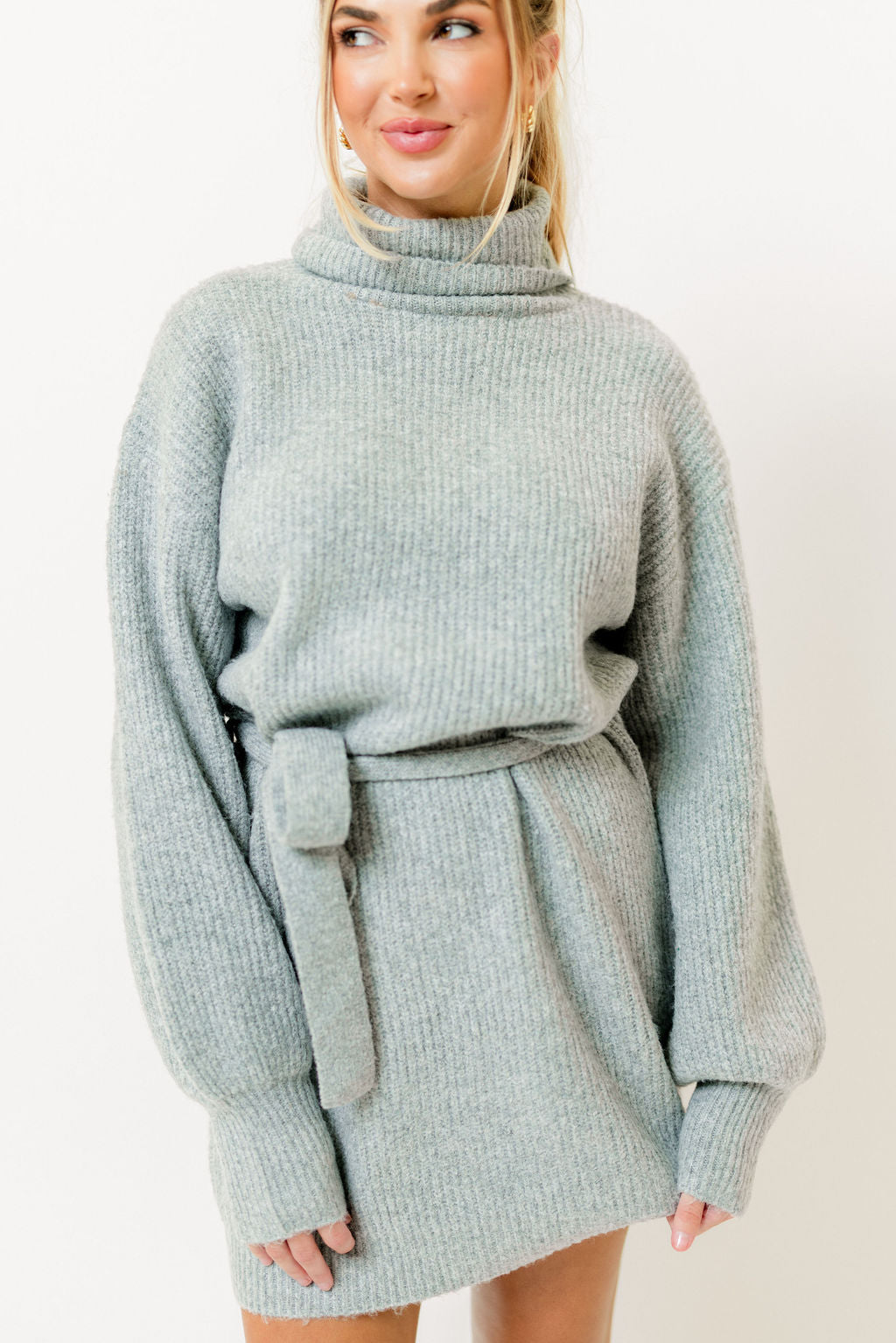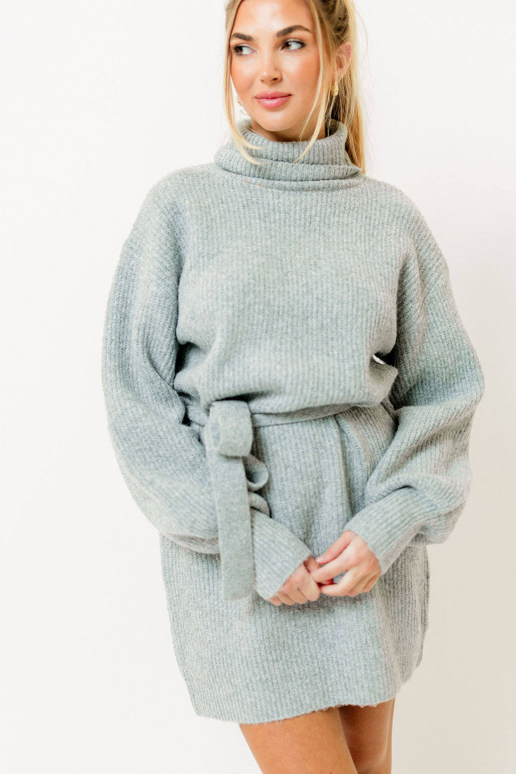 Audrina Turtleneck Sweater Dress with Tie Waist in Heather Grey