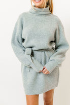 GARMENT DETAILS: Cozy knit short dress with long cuffed sleeves, dropped shoulders, and a chunky knit turtleneck. Features a matching adjustable belt.