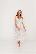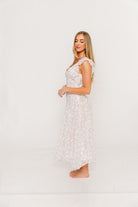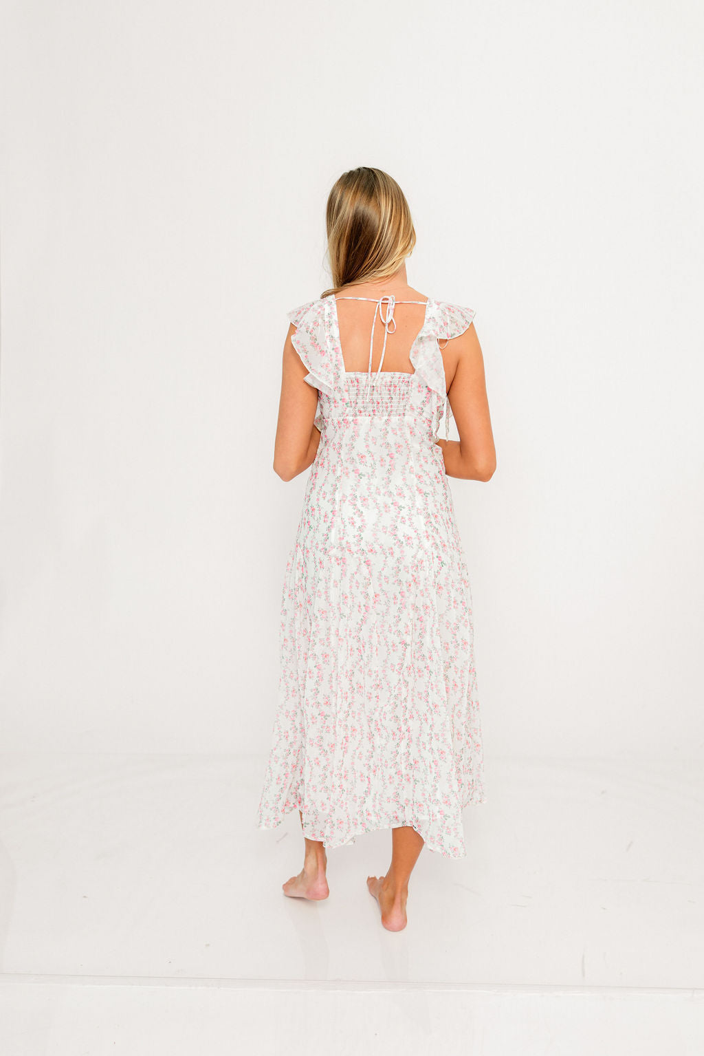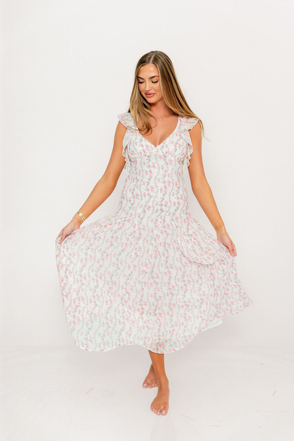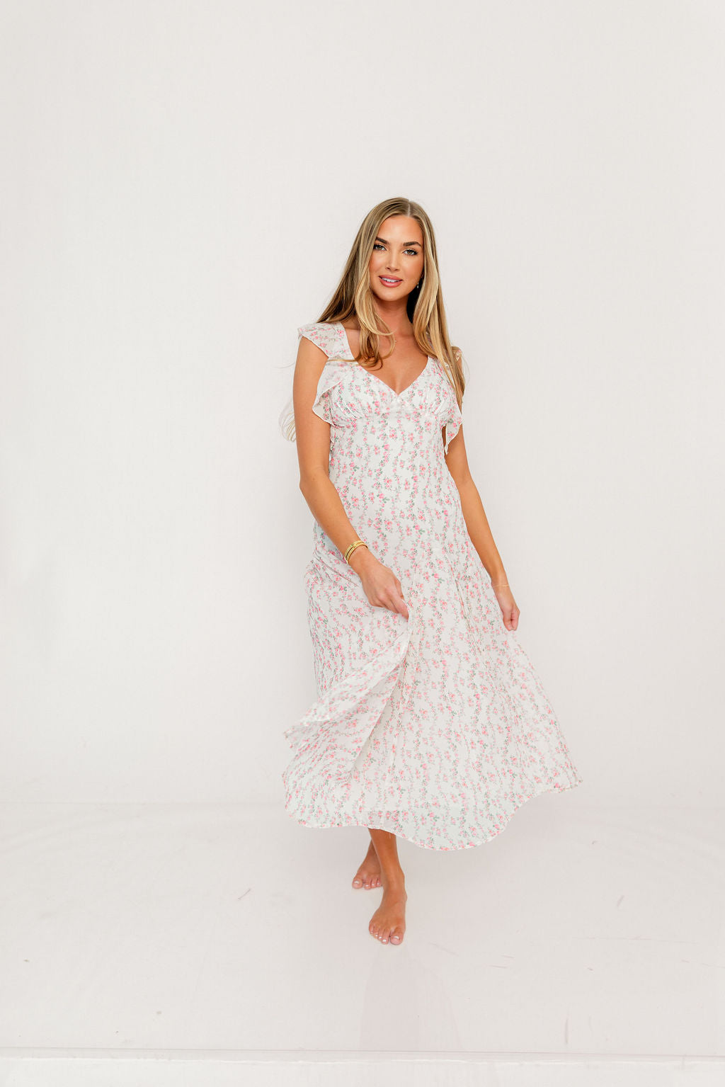 Rosie Flutter Sleeve Floral Maxi Dress in Off White/Pink