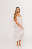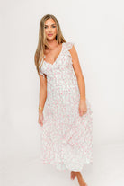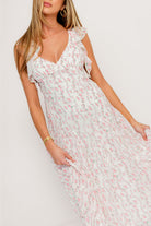 GARMENT DETAILS: Dainty floral print maxi dress with a plunging V-neckline, ruffled shoulder straps, and smocked back panel with adjustable back tie. Features a flowy, feminine skirt and defined, empire-waisted bust.