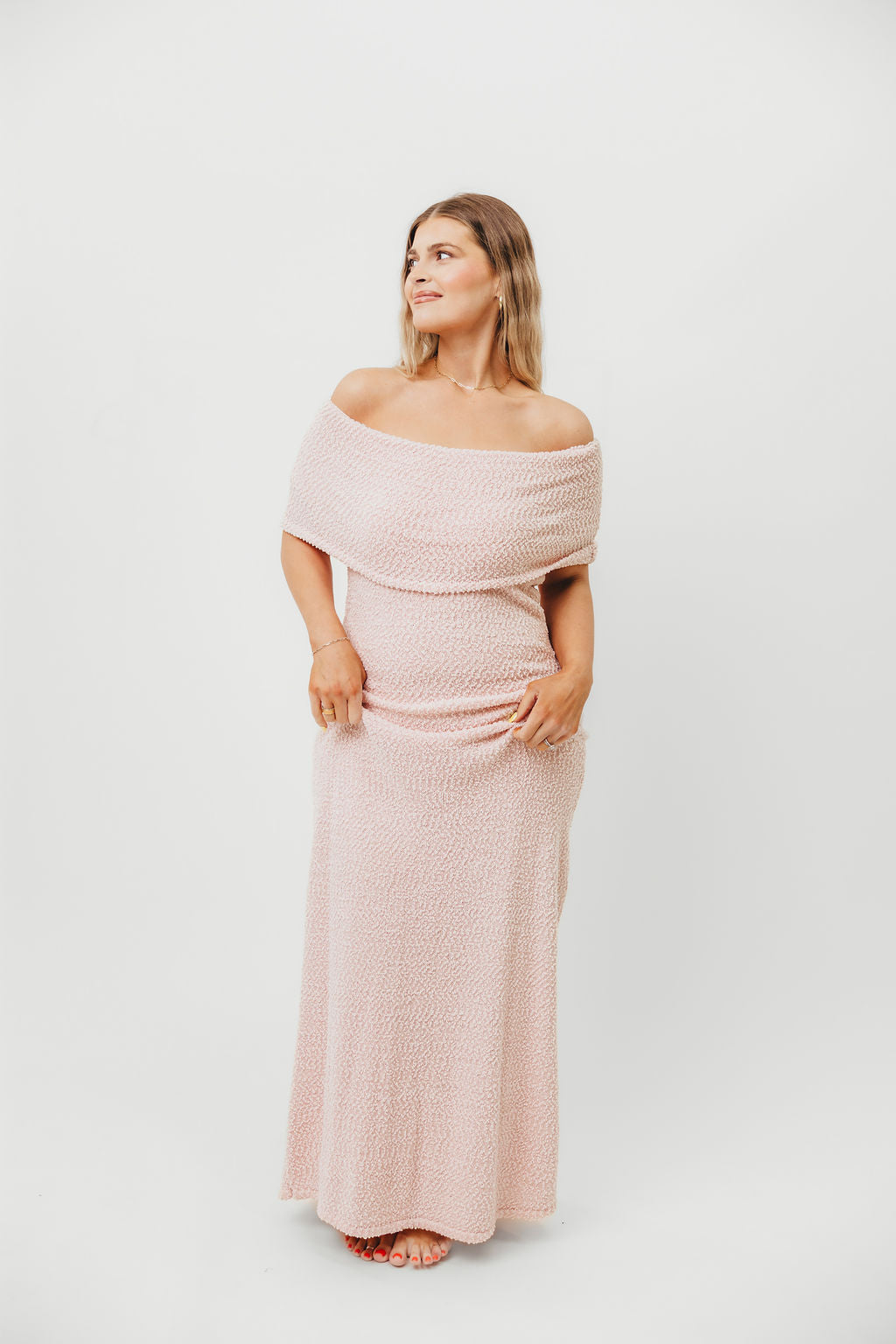 GARMENT DETAILS: Gorgeous chenille-like knit maxi dress with folded off-the-shoulder neckline, short sleeves, and a fit-and-flare skirt. Features a full lining (neck to hem) but still very lightweight.