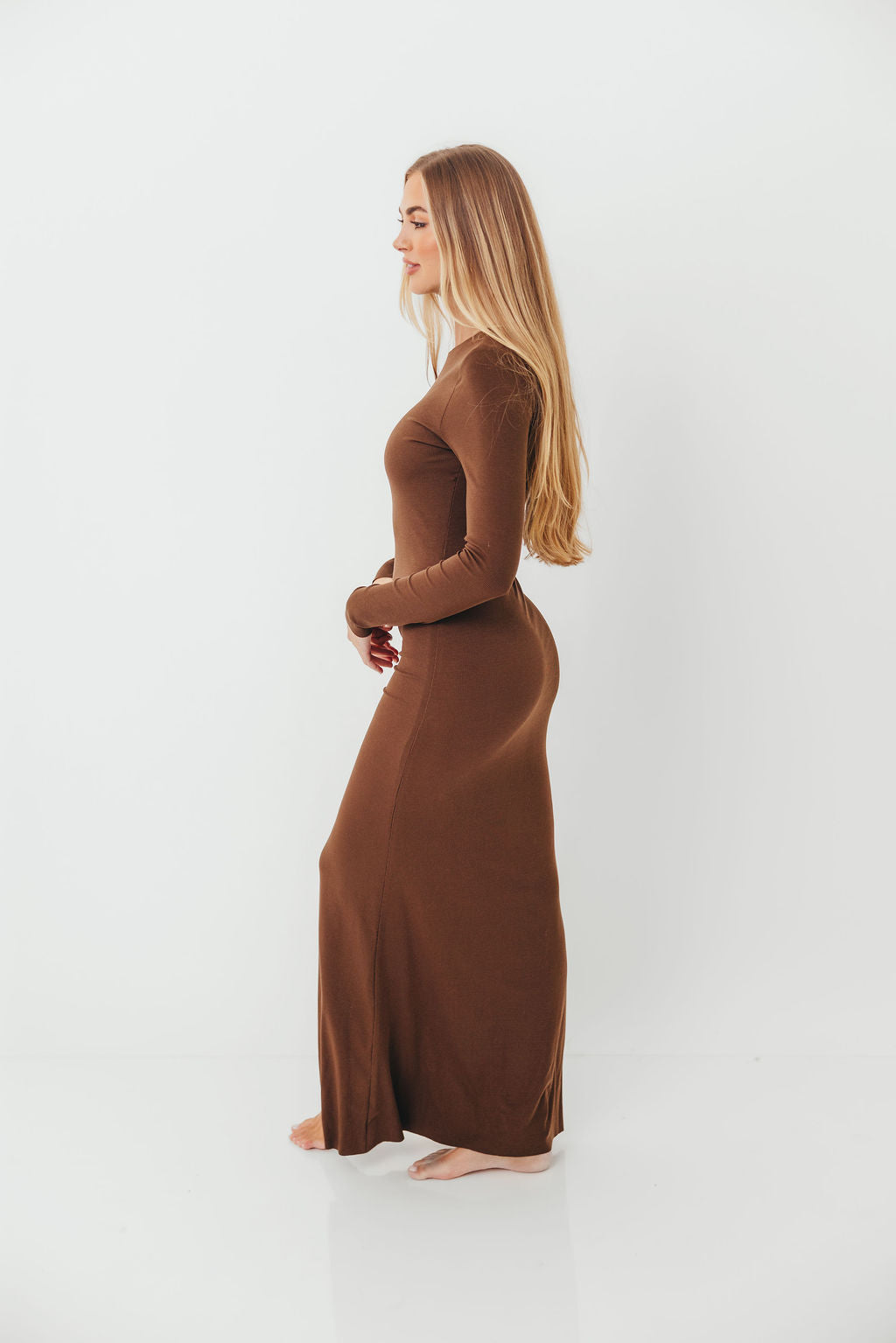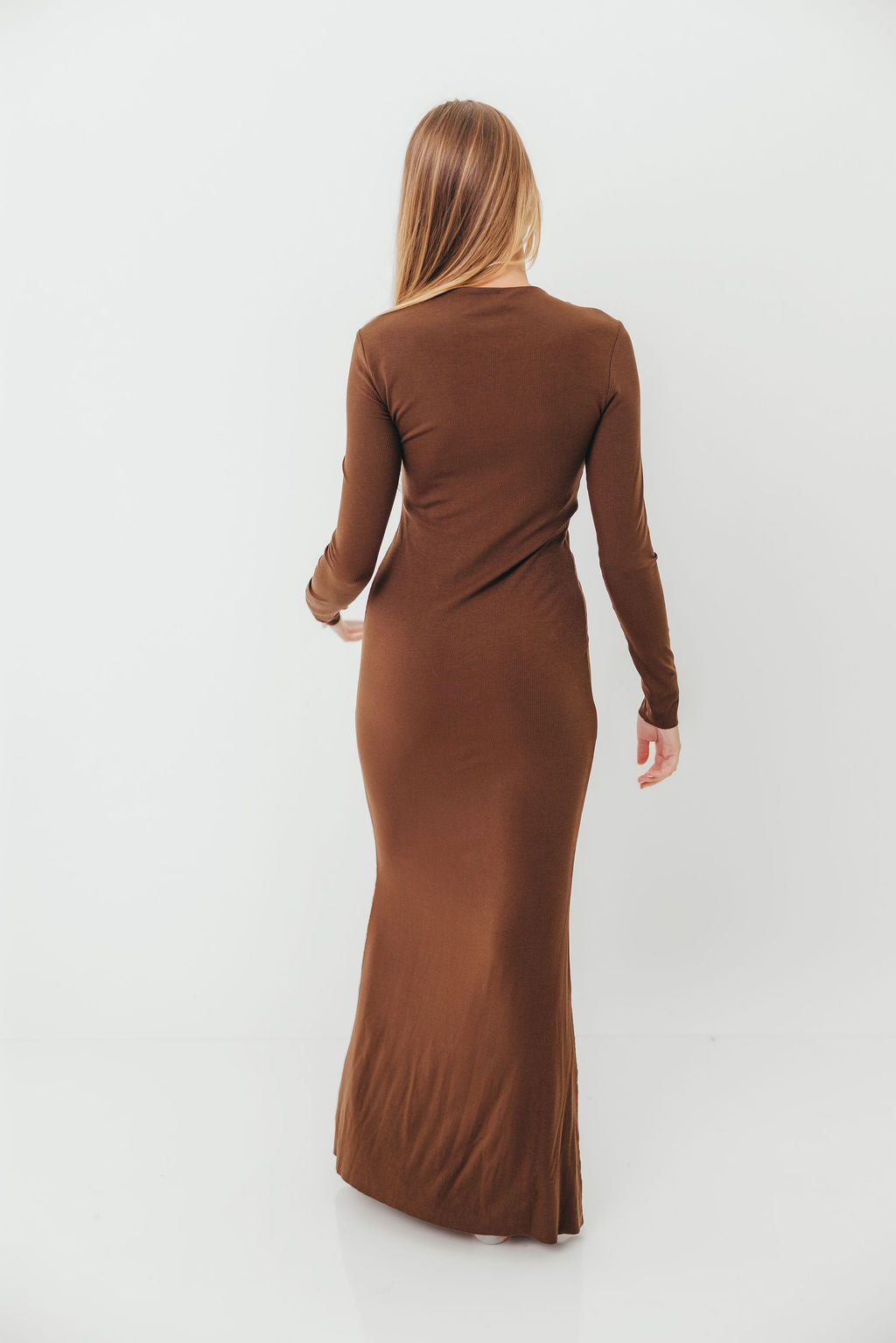 Cru Tiny Ribbed Maxi Dress in Chocolate Brown - Bump Friendly