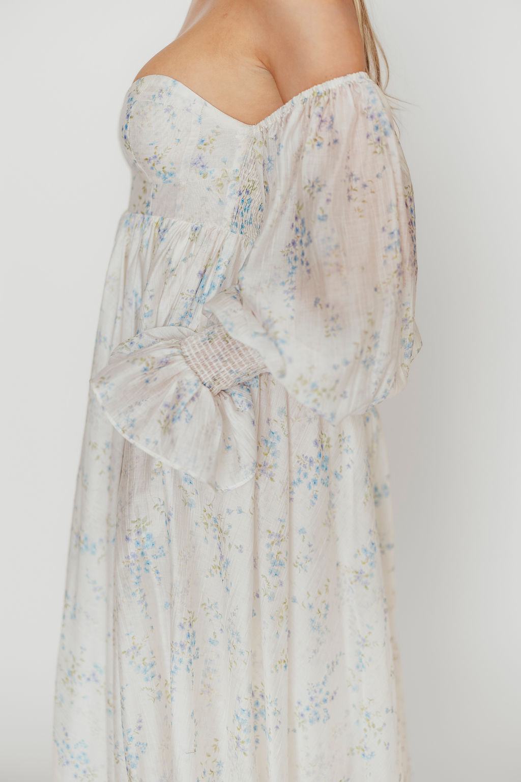 GARMENT DETAILS: Stunning and feminine maxi dress with sweetheart neckline, bustier-style bodice with defined bust (no boning), and sheer long sleeves with elasticized cuffs and ruffle accents. Features a generously cut, sweeping skirt. Lined.