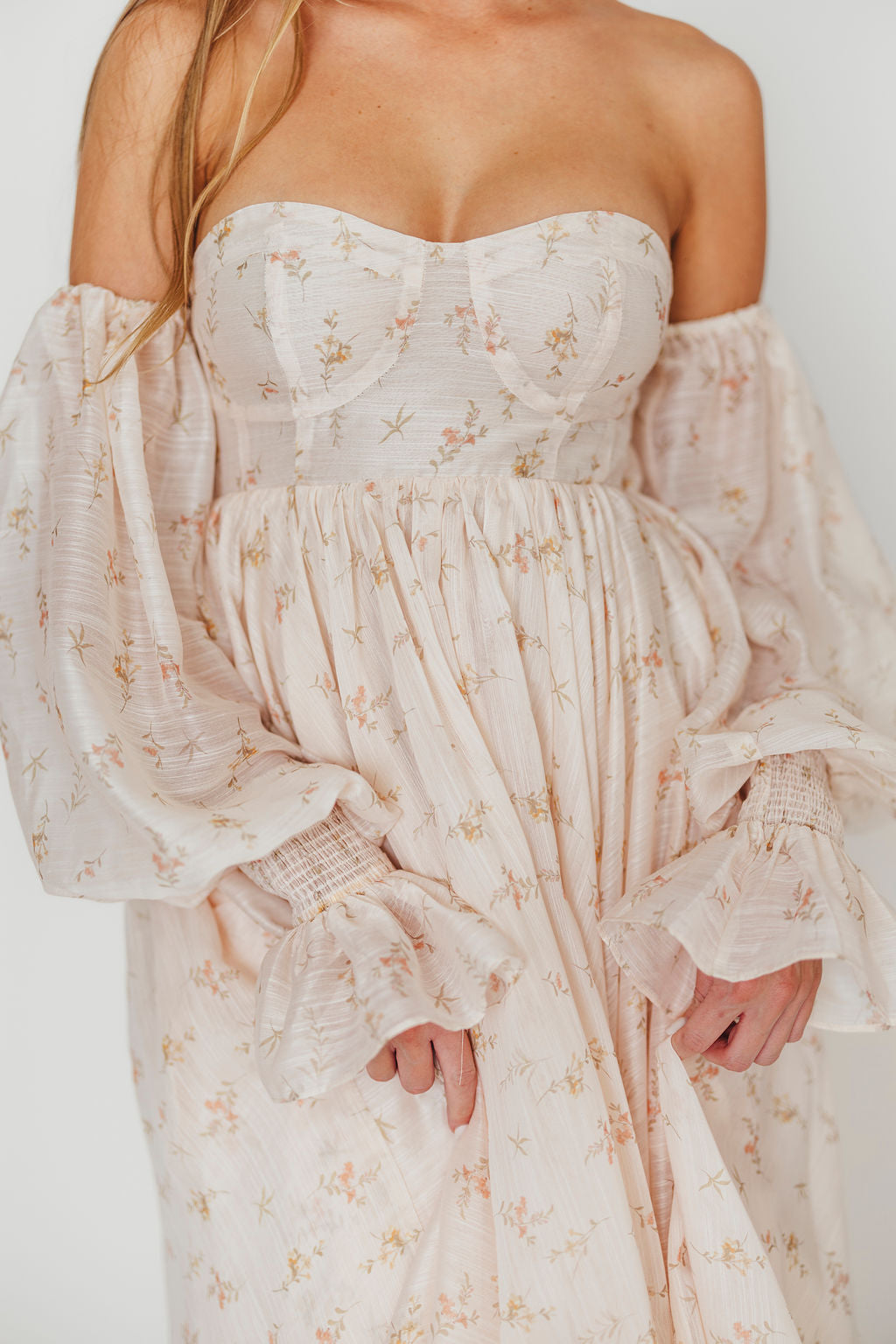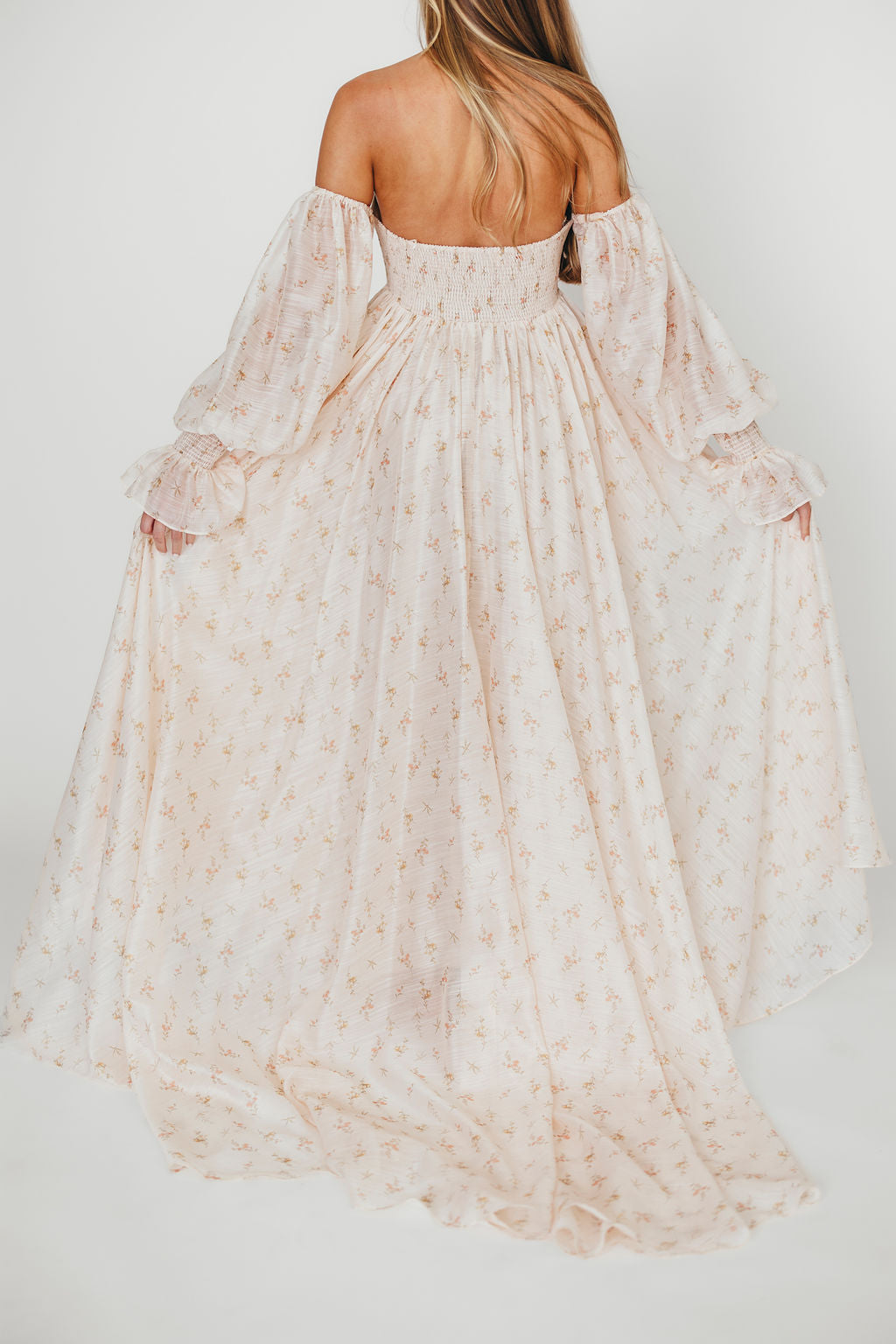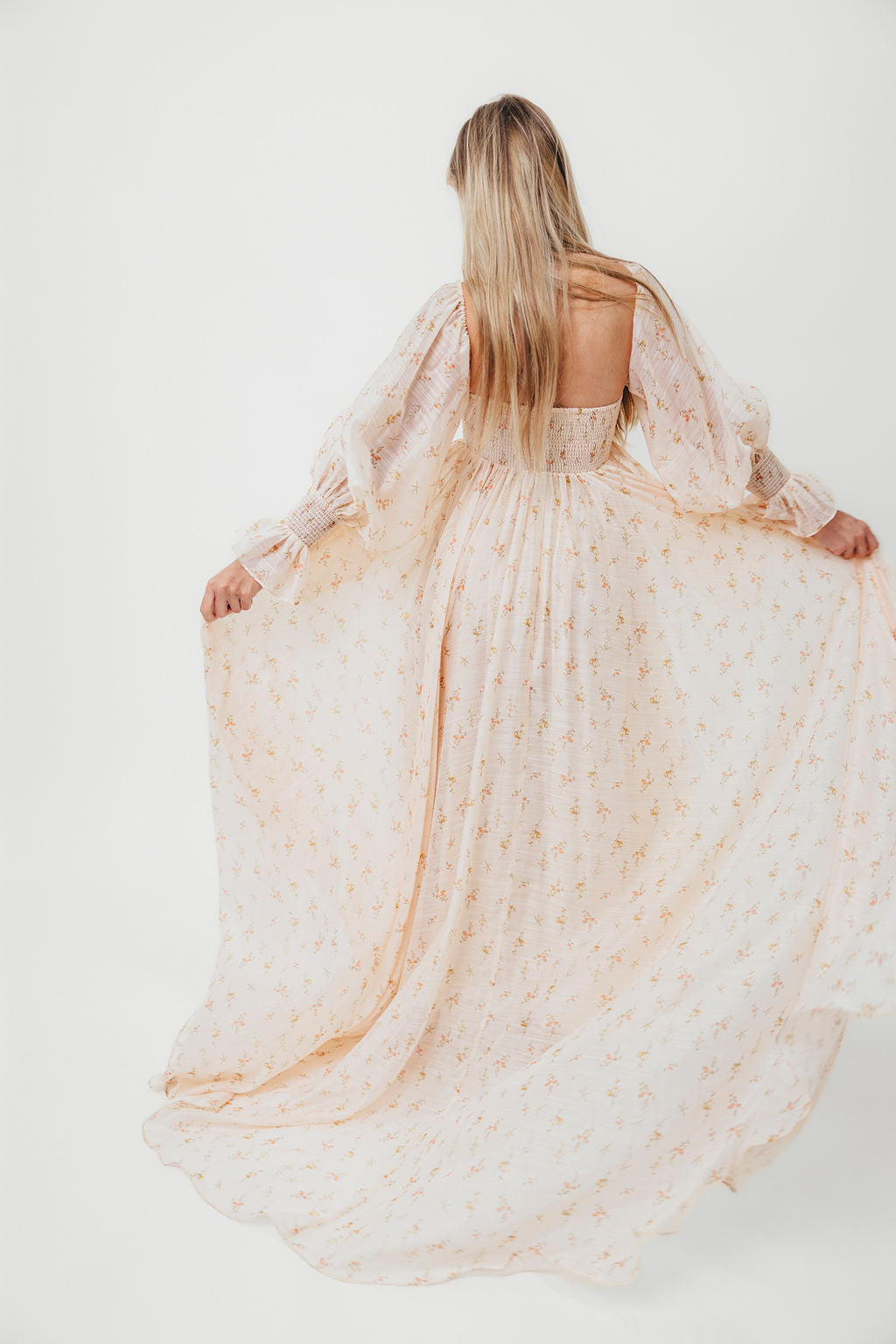 GARMENT DETAILS: Premium floral maxi dress in a lightweight, shirred chiffon. Features a soft bustier-style bodice (no boning), sweetheart neckline, smocked back panel, and sheer long sleeves with elastic cuffs and ruffles. Sleeves can be worn on or off the shoulder. Finished with a sweeping maxi-length skirt and dramatic train. Lined.