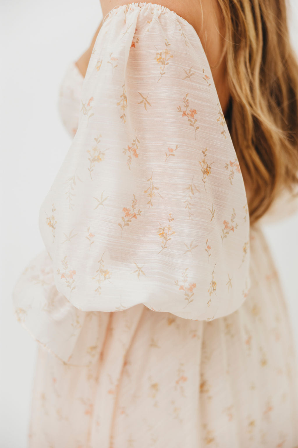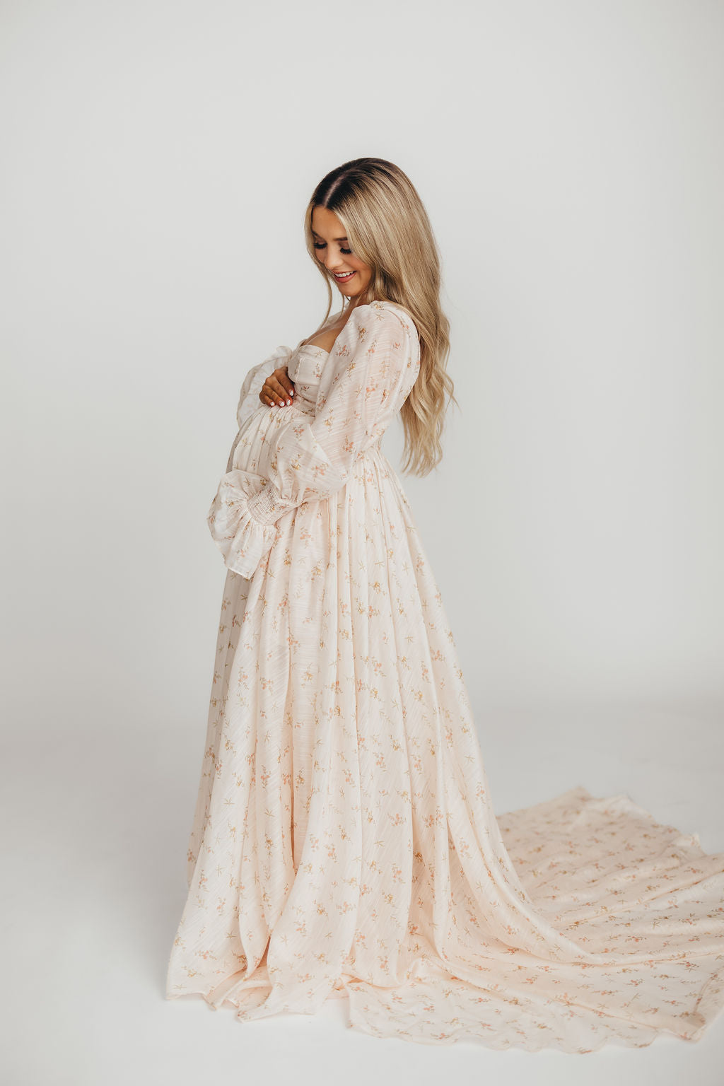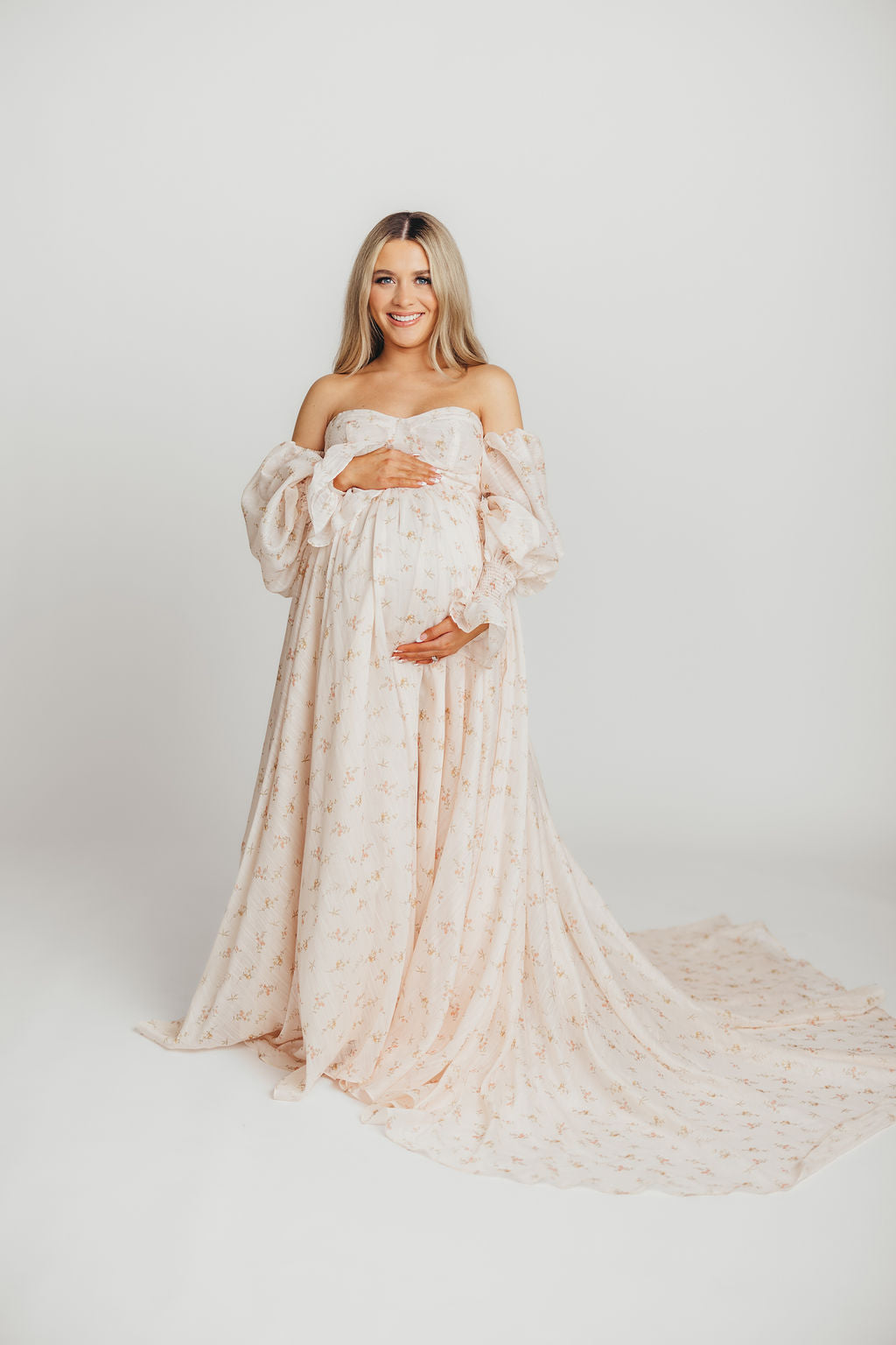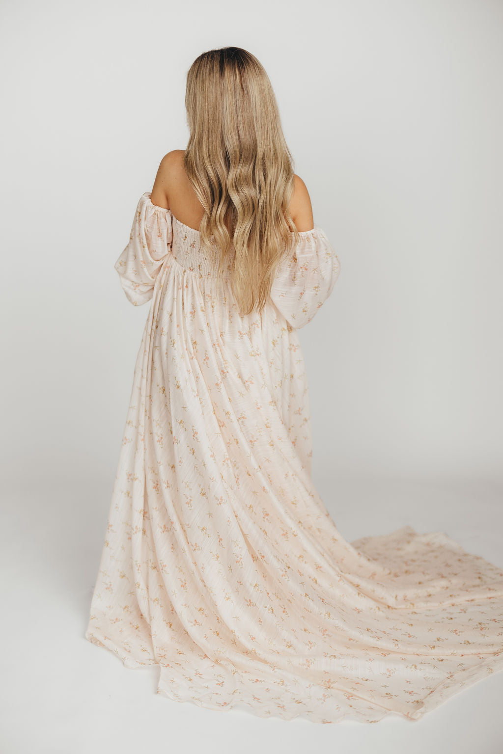 GARMENT DETAILS: Premium floral maxi dress in a lightweight, shirred chiffon. Features a soft bustier-style bodice (no boning), sweetheart neckline, smocked back panel, and sheer long sleeves with elastic cuffs and ruffles. Sleeves can be worn on or off the shoulder. Finished with a sweeping maxi-length skirt and dramatic train. Lined.