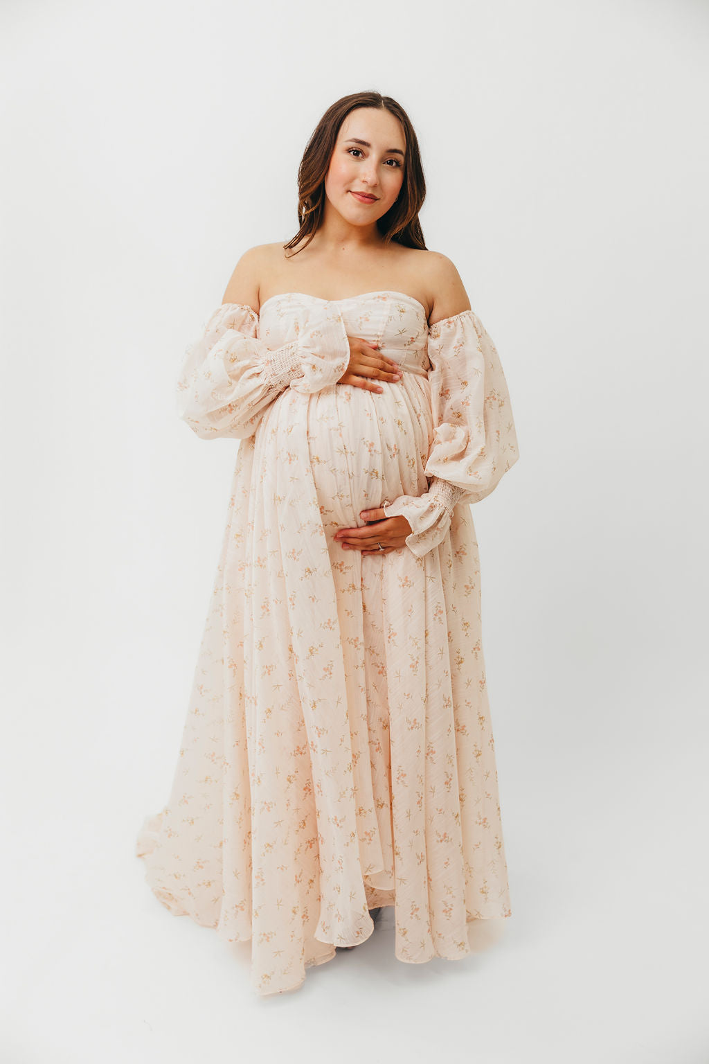This gown deserves the word breathtaking. Meet the Delilah Maxi, an absolutely stunning statement dress that is both whimsical and romantic. This premium gown is crafted from eight yards of lightweight floral material, with a bustier-style bodice, swoon-worthy skirt and train, and sheer sleeves that can be worn on or off the shoulder depending on your mood! The Delilah Dress is a centerpiece of a dress and perfect for every body type, including expecting mamas. (P.S. it makes an incredible client closet dress for photographers!)